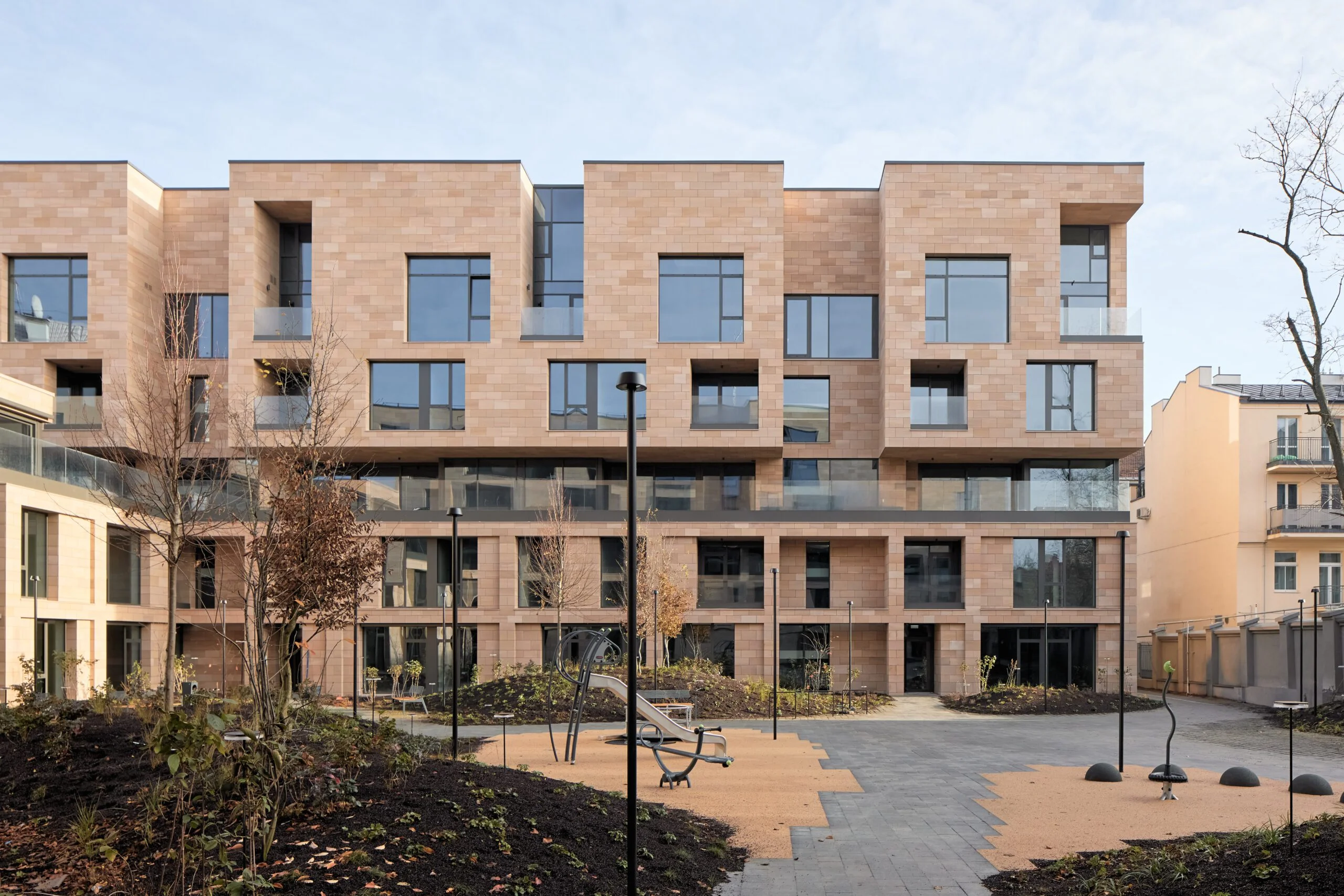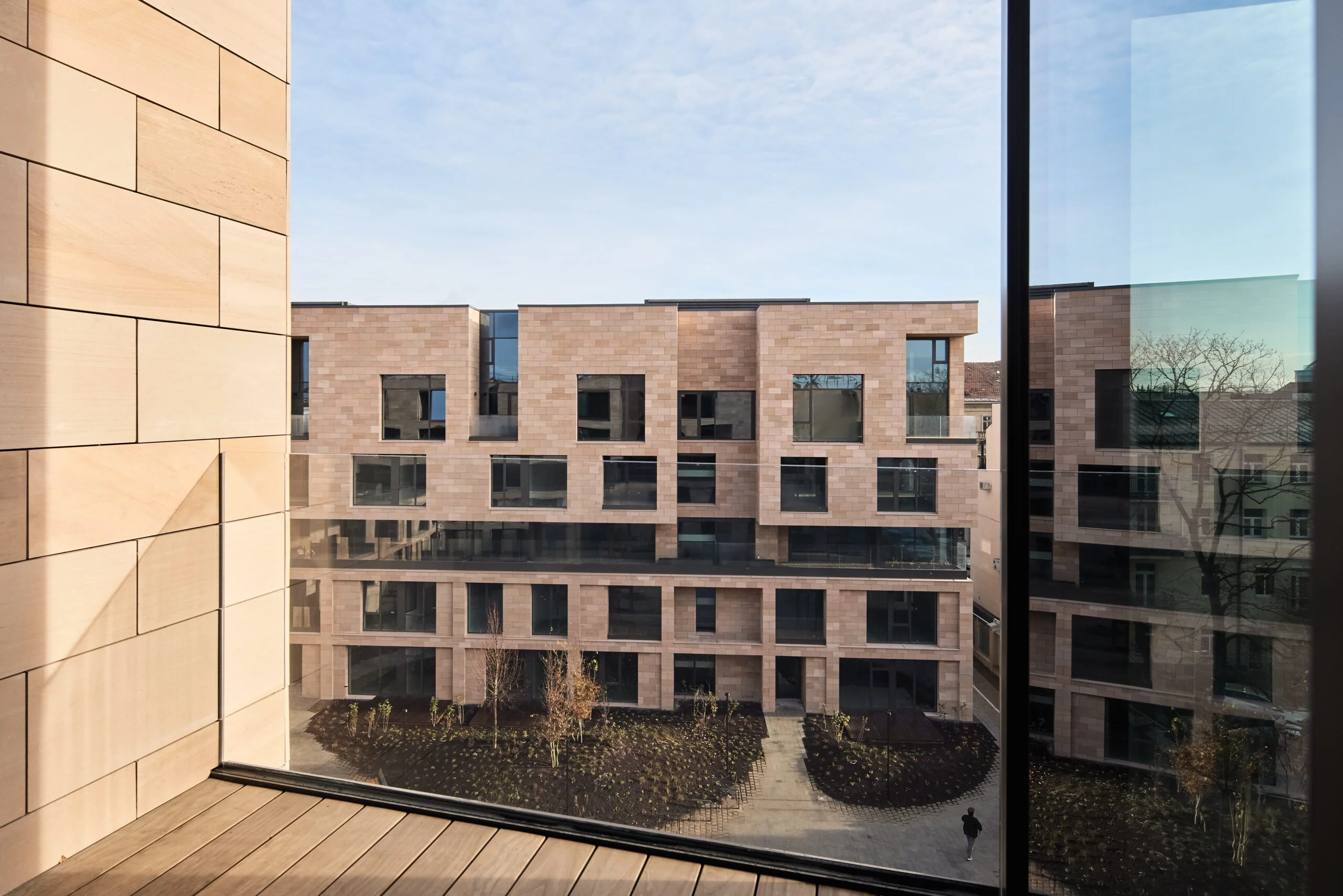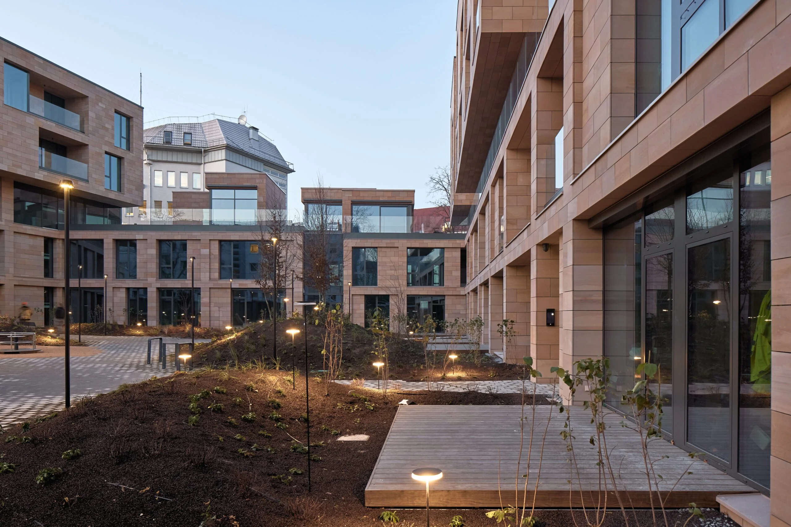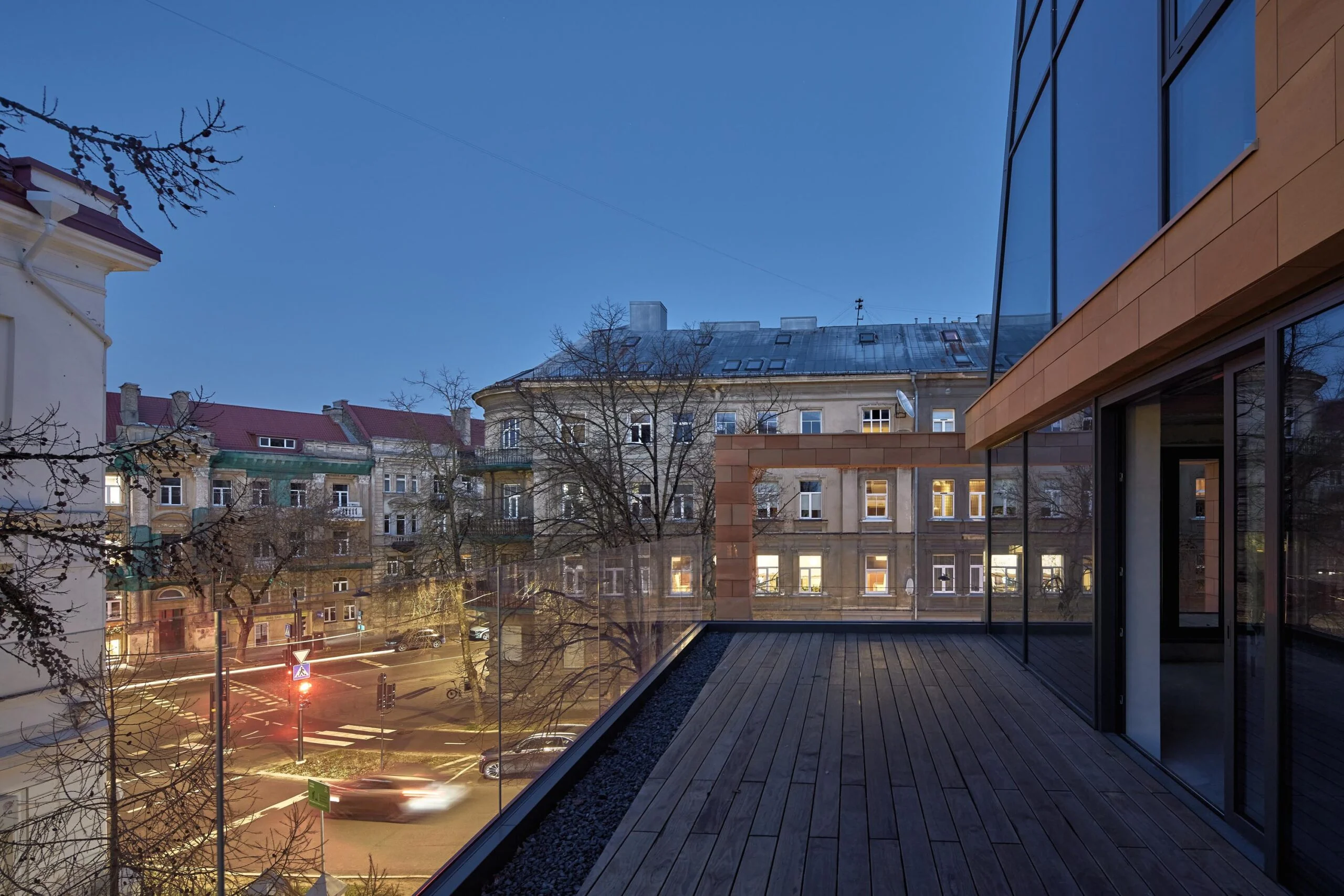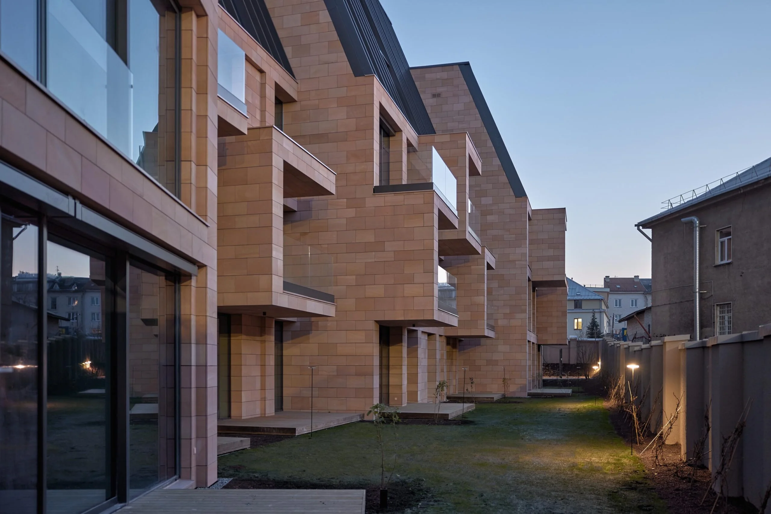 Rytinėje komplekso pusėje suprojektuota kolonada ne tik išlaiko gatvės užstatymo liniją, bet kartu už jos suplanuoti balkonai ir terasos, kurie neišeina į gatvę už fasado ribų, užtikrindami jaukumą ir privatumą. Atitrauktas pirmasis aukštas sukuria nišų erdves, kur atsiranda erdvė komercijai, gali įsikurti kavinukės, ekspozicijos tarsi privačiuose savo kiemeliuose. Teritorija suskirstyta į viešas ir privačias erdves kalvomis, kurios apželdintos suaugusiais medžiais ir želdiniais. Kiemo erdvė pereina į laiptinių erdvę parinkus to paties fasadinio akmens plokštes.