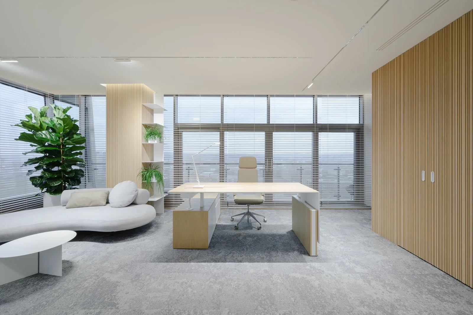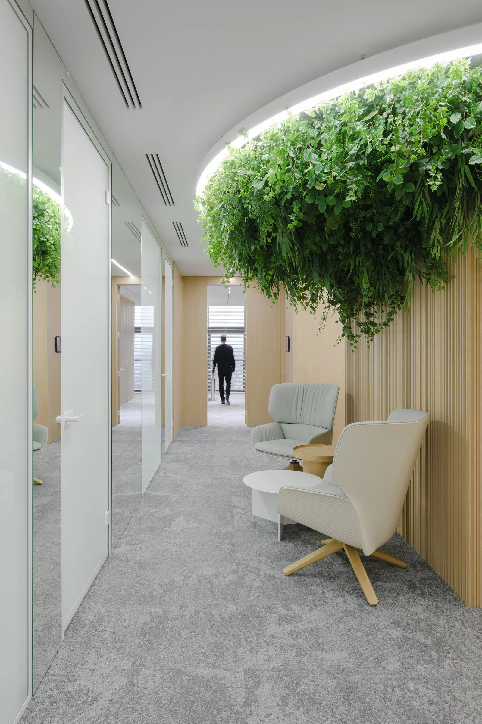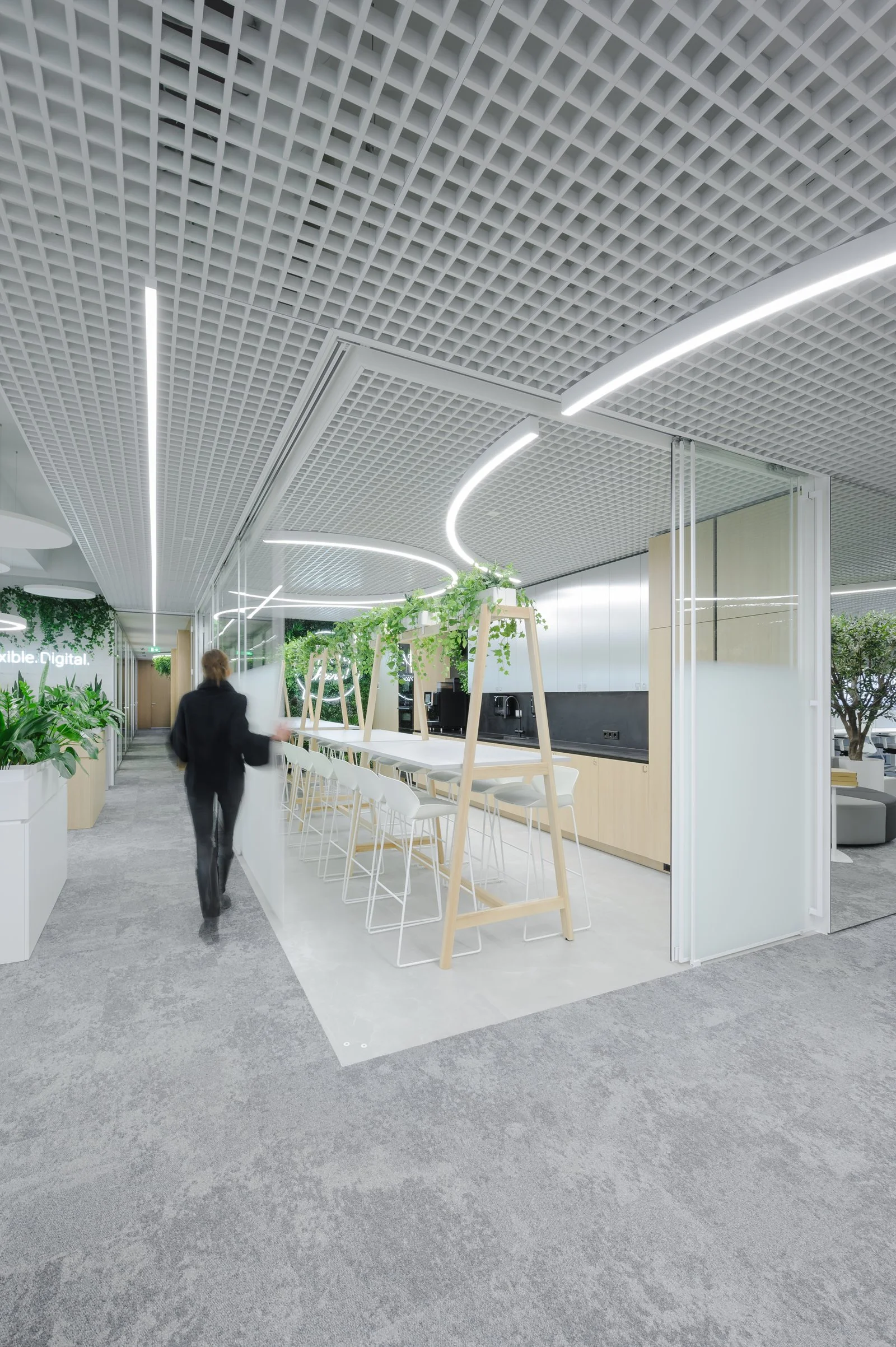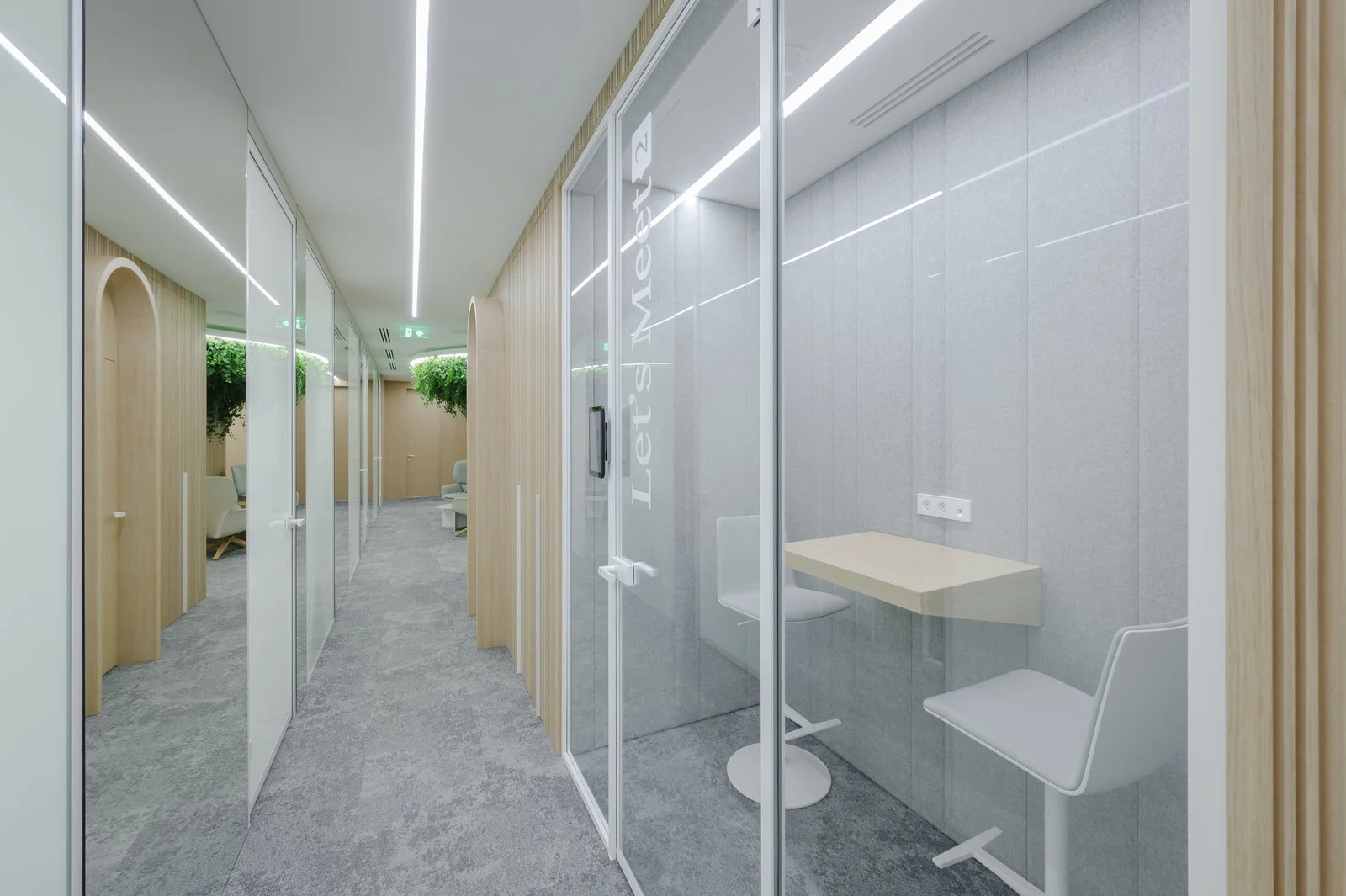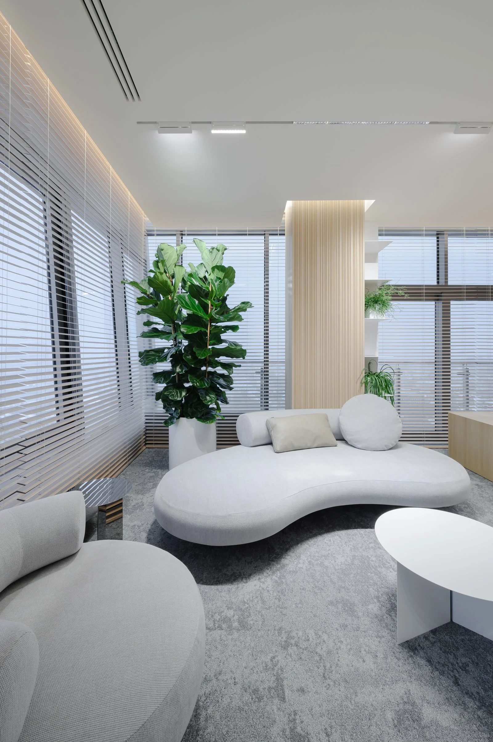 Interjeras ne tik atspindi aukštą estetikos lygį, bet ir puikiai subalansuoja brandą su jaunatvišku veržlumu. Kiekvienas dizaino elementas buvo parinktas su aiškiu tikslu – sukurti erdvę, kuri įkvepia ir skatina kūrybiškumą, tačiau taip pat užtikrina patogią ir diskretišką darbo atmosferą. Šviesios spalvos ir natūralios medžiagos suteikia erdvės pojūtį, užtikrina lengvumą. Apgalvotas erdvės planavimas ir funkcionalūs baldai ne tik užtikrina ergonomišką judėjimą, bet ir skatina efektyvų darbo procesą, taip sukuriant harmoningą ir neblaškančią aplinką, kurioje lengva susikoncentruoti.