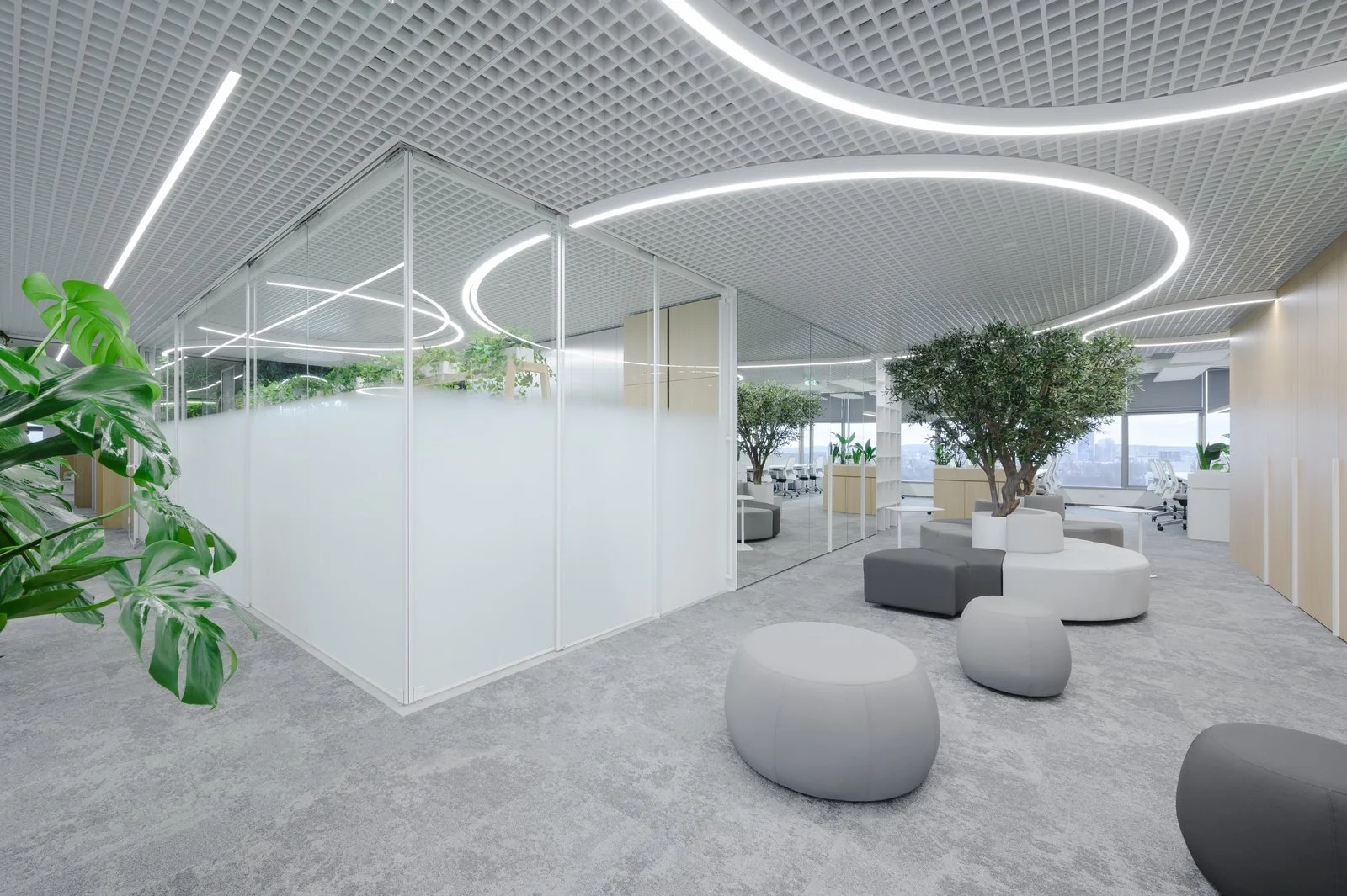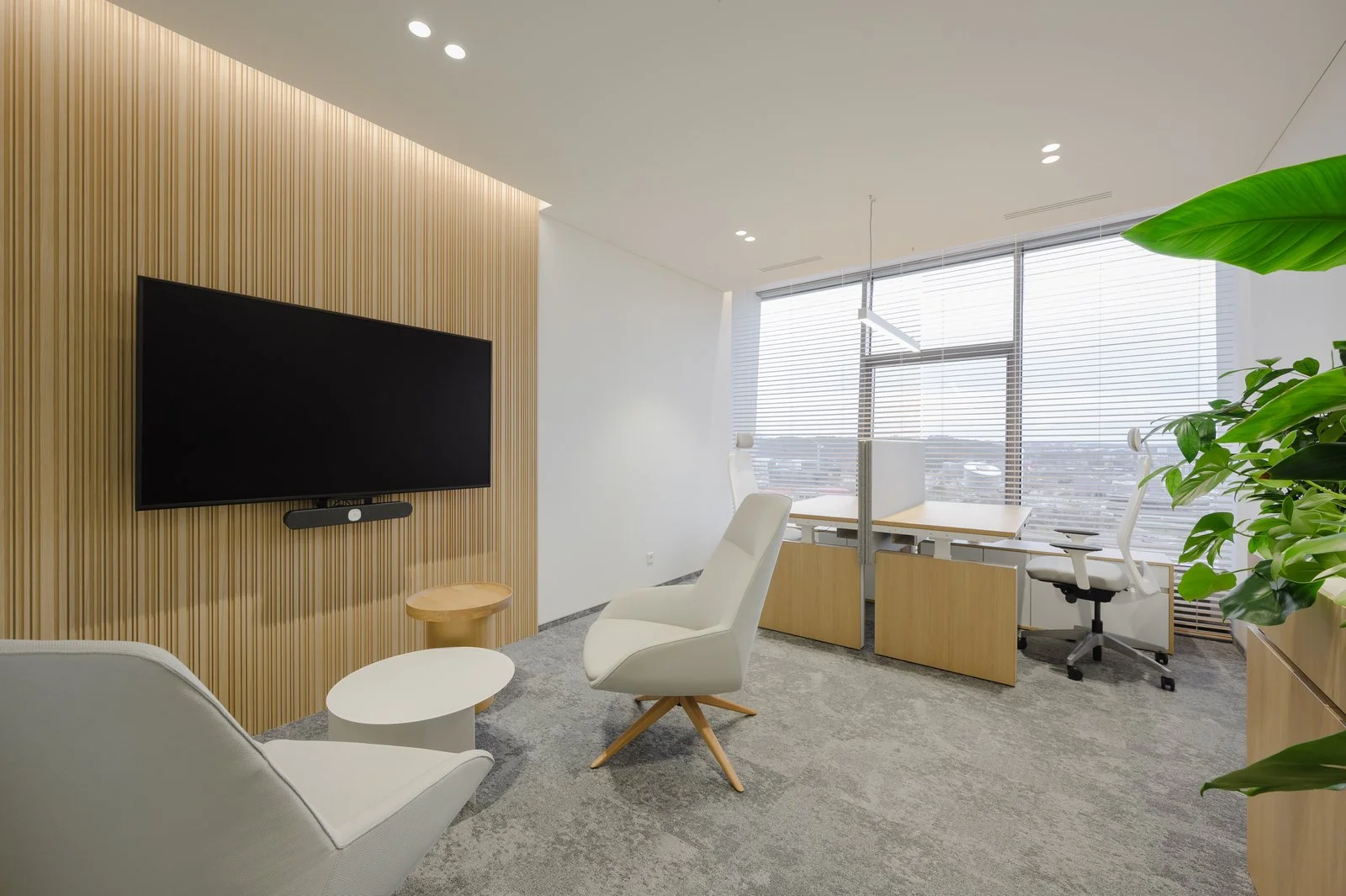 Šis biuras, įsikūręs paskutiniame dangoraižio aukšte, reprezentuoja modernios darbo aplinkos idėją, sujungiančią išmaniąsias technologijas, funkcionalumą ir išskirtinį dizainą. Kiekviena erdvė apgalvota taip, kad atitiktų aukščiausius ergonomikos ir darbo efektyvumo standartus, užtikrinant maksimalų patogumą bei prisitaikymą prie skirtingų darbo stilių ir poreikių. Išmaniosios technologijos leidžia lengvai valdyti apšvietimą, temperatūrą ir akustiką, taip sukuriant optimalią darbo aplinką, kurią pritaikyti galima tiek individualiems darbuotojams, tiek komandiniams procesams. Biuro vieta virš miesto šurmulio suteikia išskirtinį panoraminį vaizdą, kuriame atsispindi „Biuras tarp debesų“ – projektas, derinantis erdvės šviesumą ir ramybę.