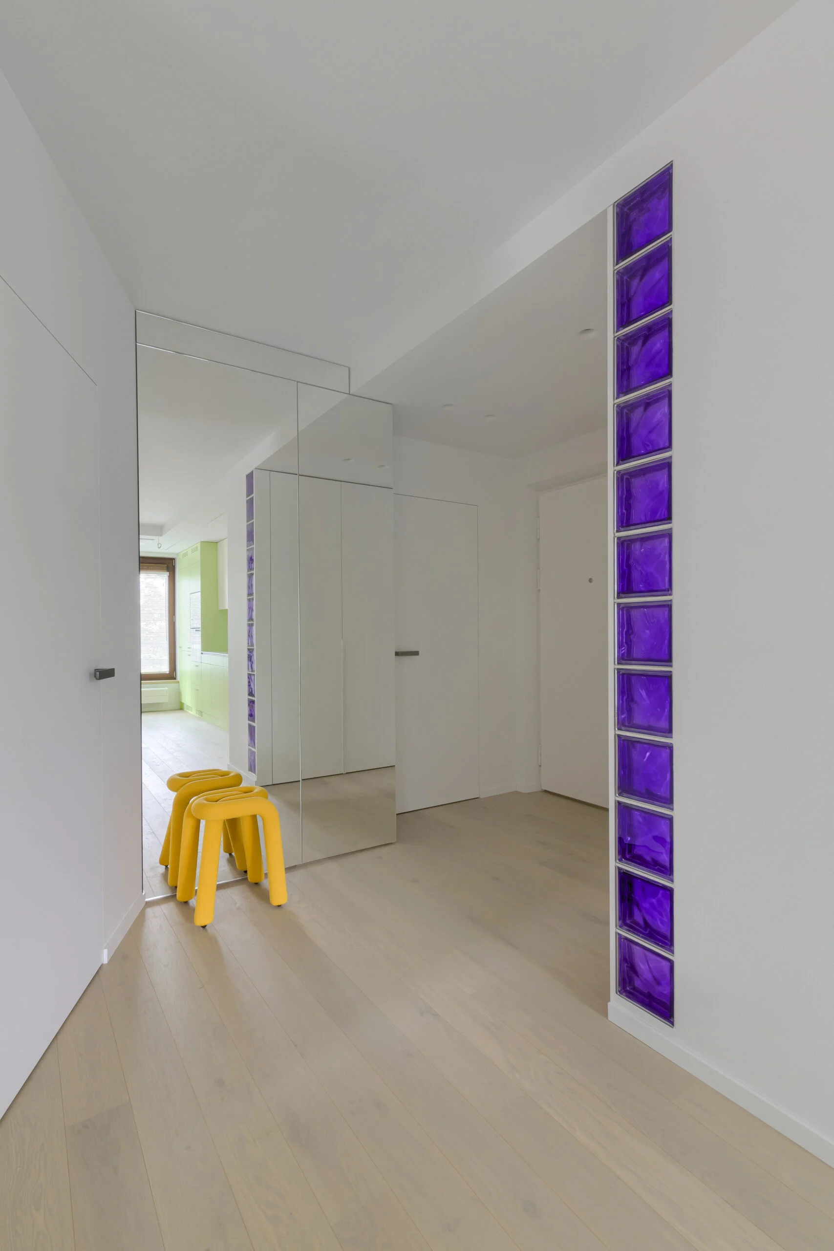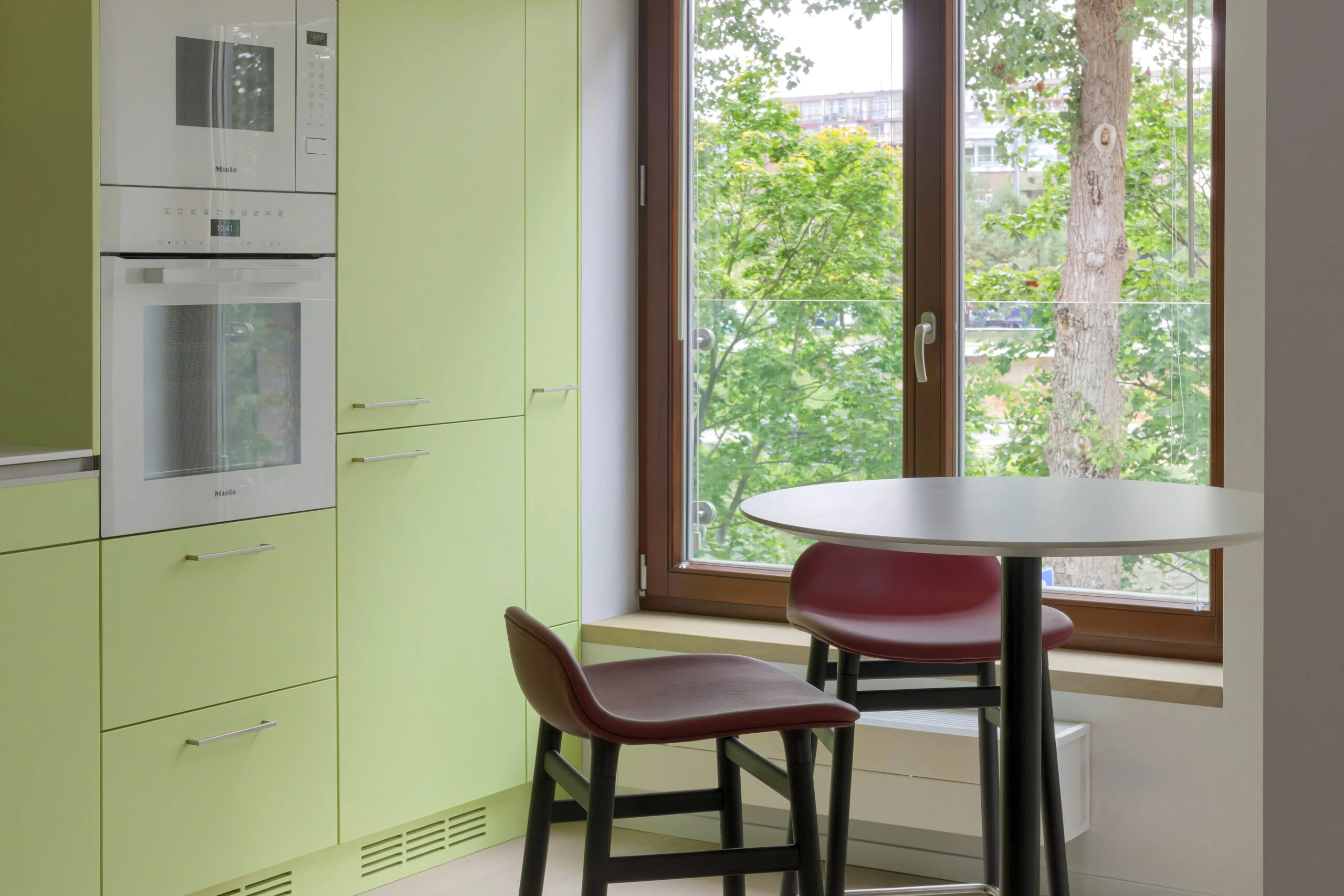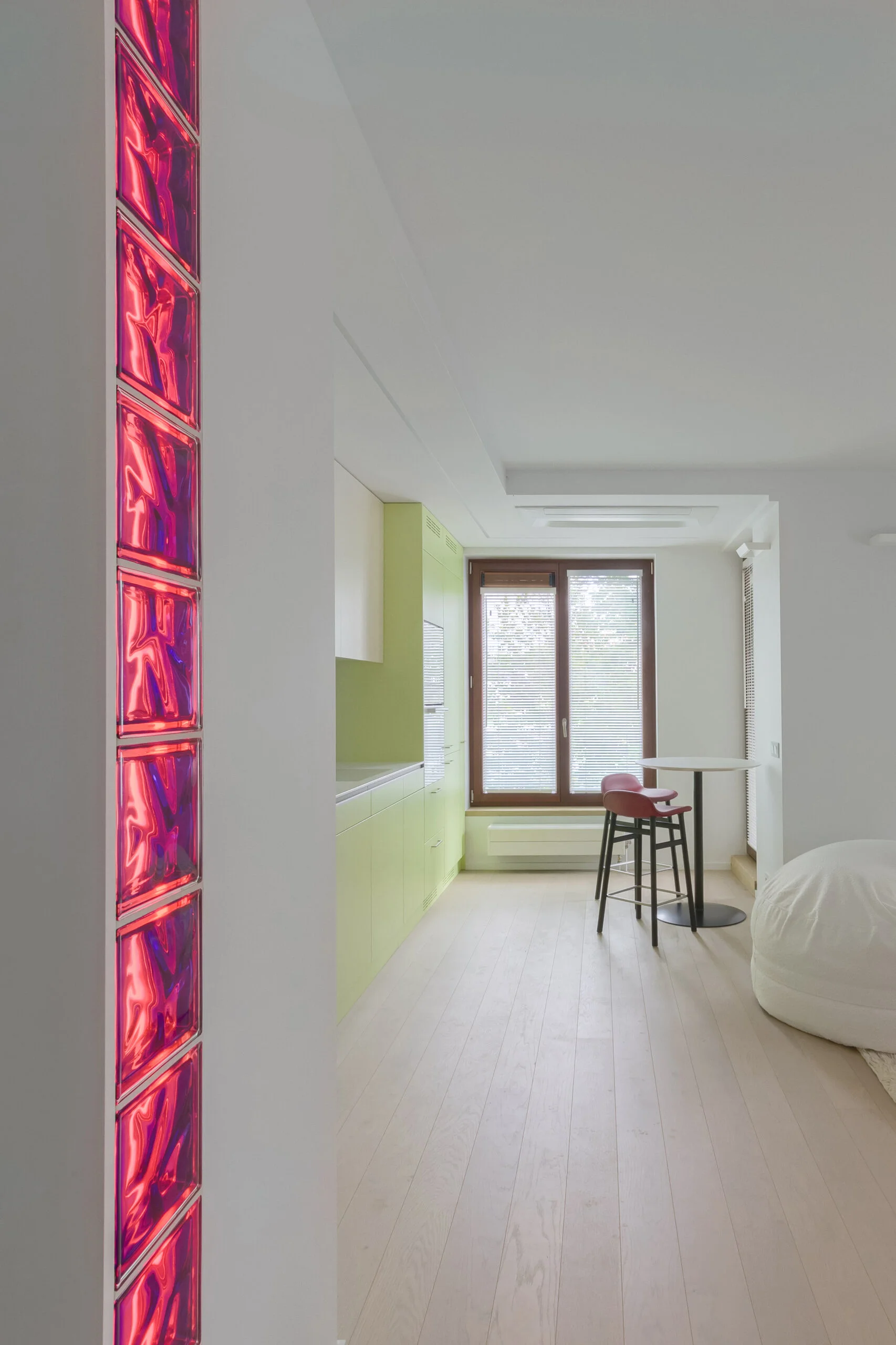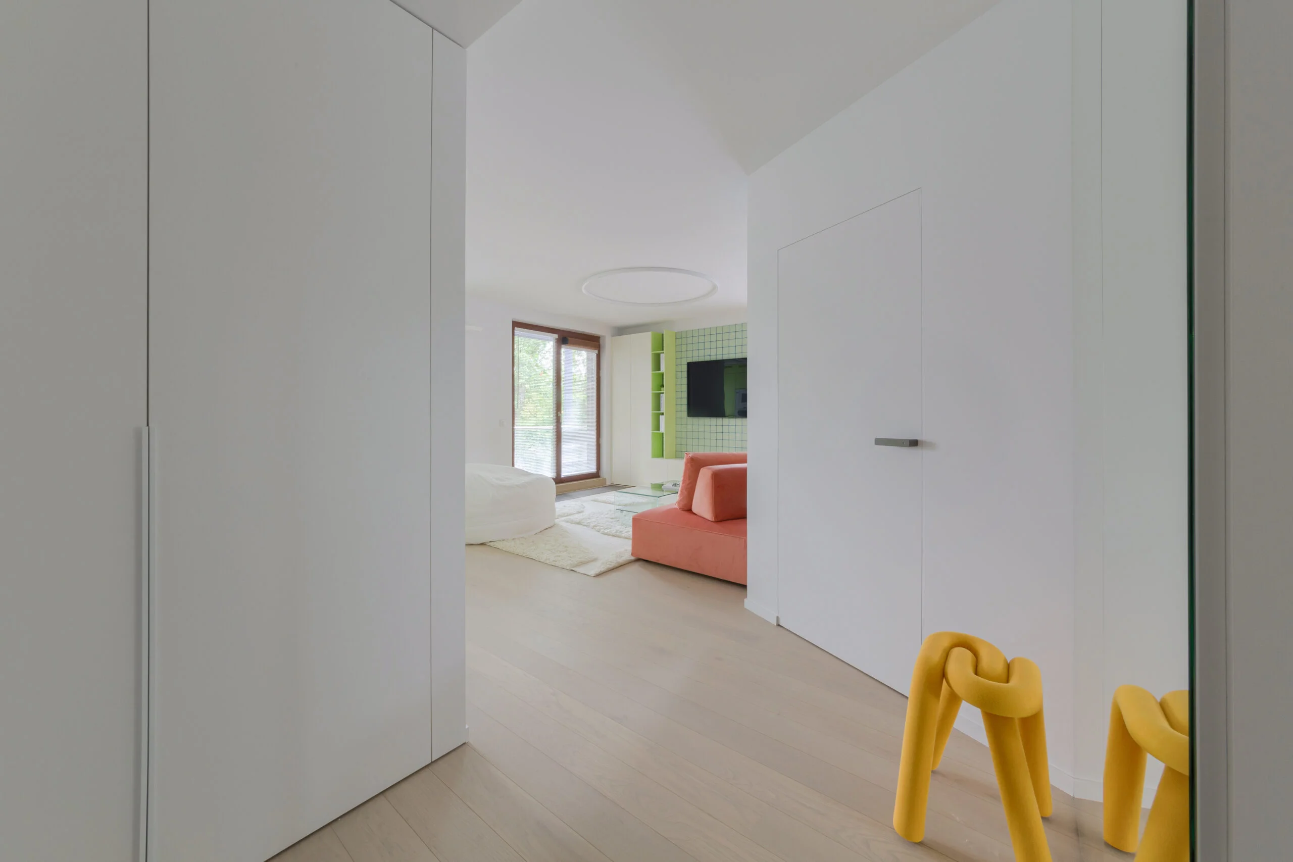 Pagrindinė šio buto interjero ašis – kodinis žodis „gaivu“, kurį klientas išsakė pirmojo susitikimo su dizaineriais metu, diskutuojant spalvinius interjero sprendimus. Gyvenamoji buto erdvė primena pavasarį: ji šviesi, skaidri ir lengva. Tačiau žengiant į intymesnes zonas – miegamąjį ar vonios kambarį – nuotaika kardinaliai keičiasi. Čia dominuoja gyvybinga raudona spalva, kurianti jaukią, paslaptingą ir energingą atmosferą.
