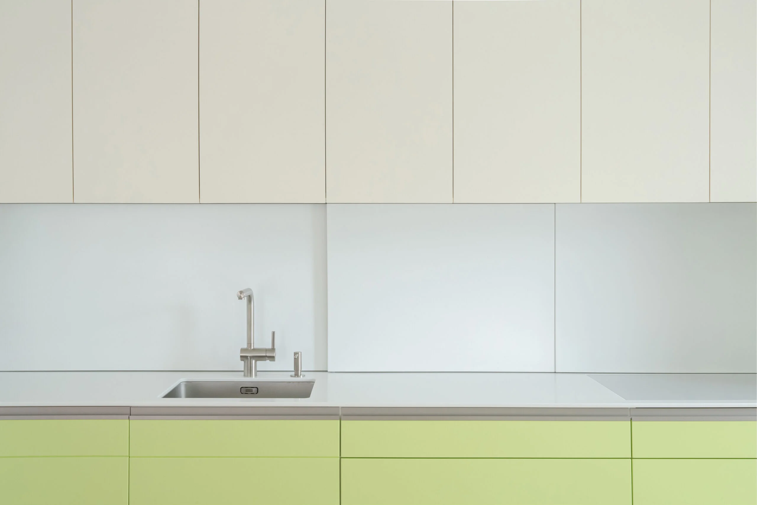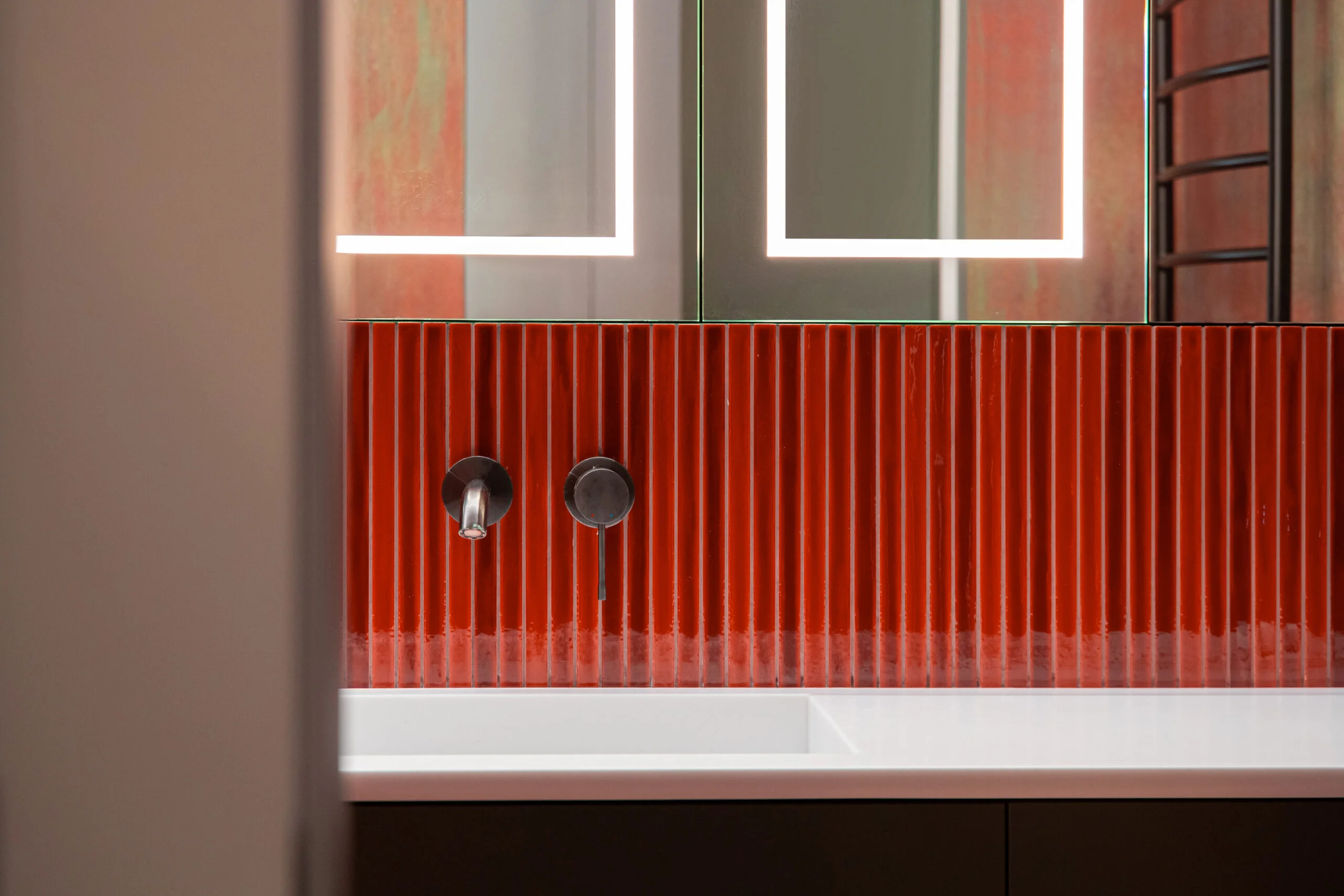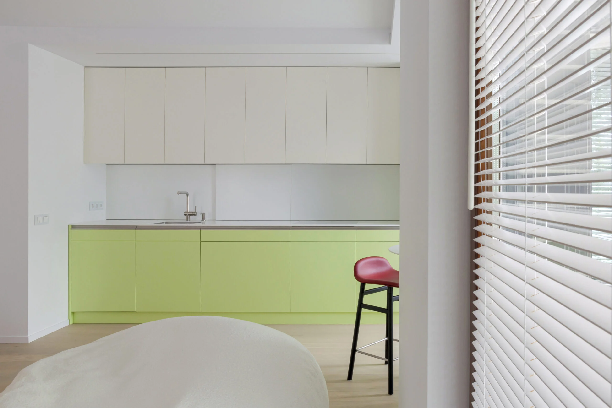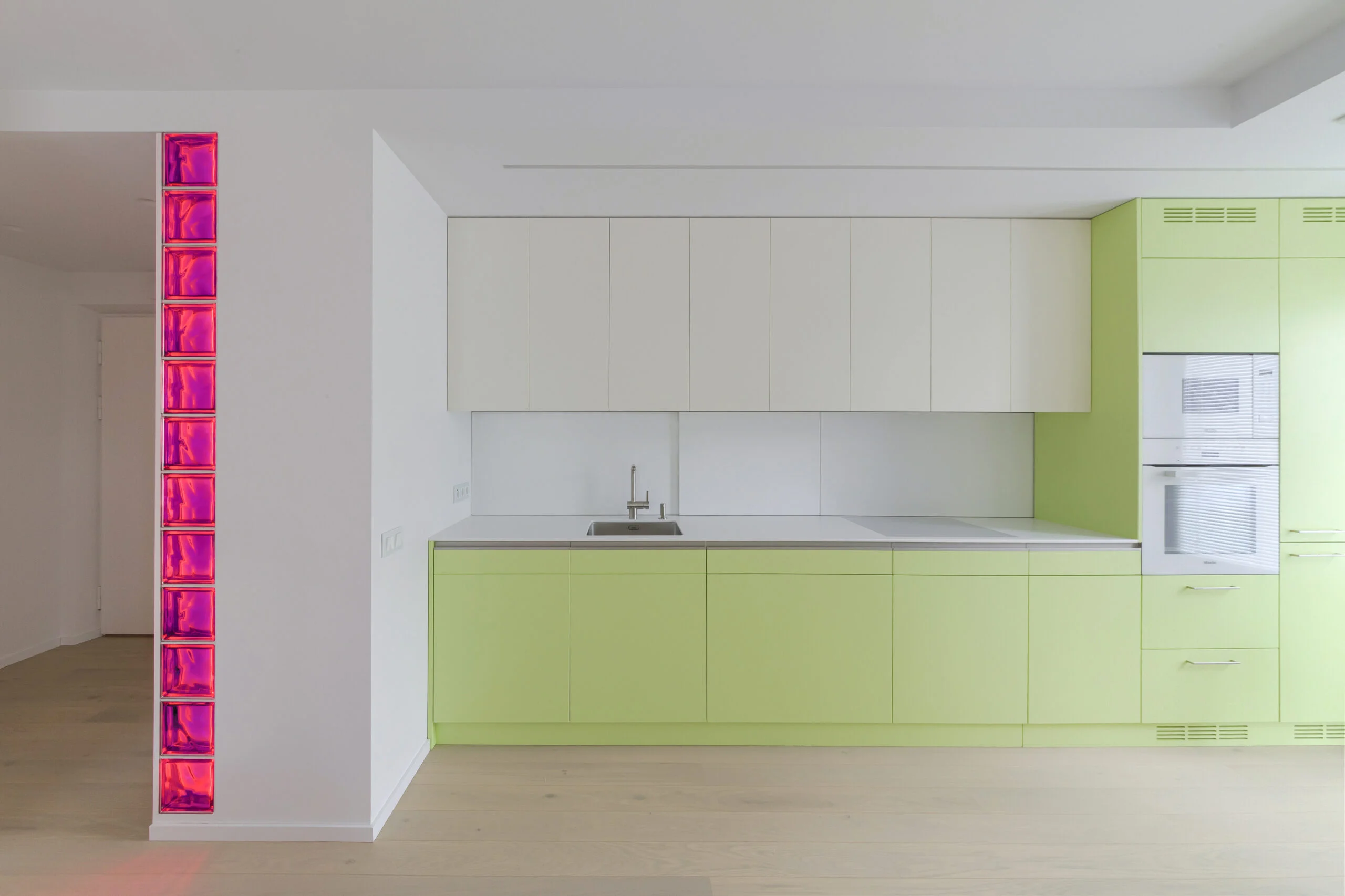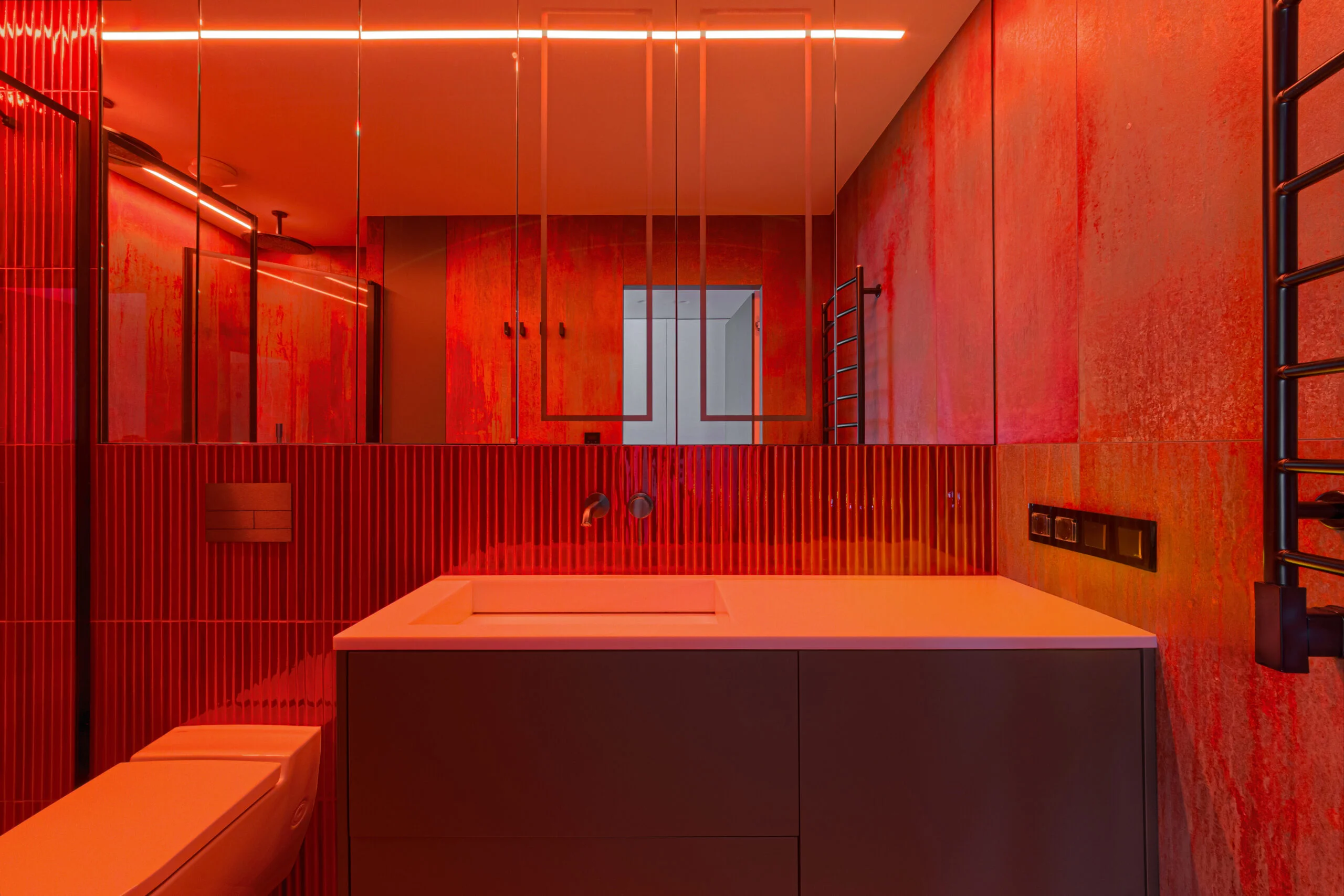 Pagrindinė šio buto interjero ašis – kodinis žodis „gaivu“, kurį klientas išsakė pirmojo susitikimo su dizaineriais metu, diskutuojant spalvinius interjero sprendimus. Gyvenamoji buto erdvė primena pavasarį: ji šviesi, skaidri ir lengva. Tačiau žengiant į intymesnes zonas – miegamąjį ar vonios kambarį – nuotaika kardinaliai keičiasi. Čia dominuoja gyvybinga raudona spalva, kurianti jaukią, paslaptingą ir energingą atmosferą.