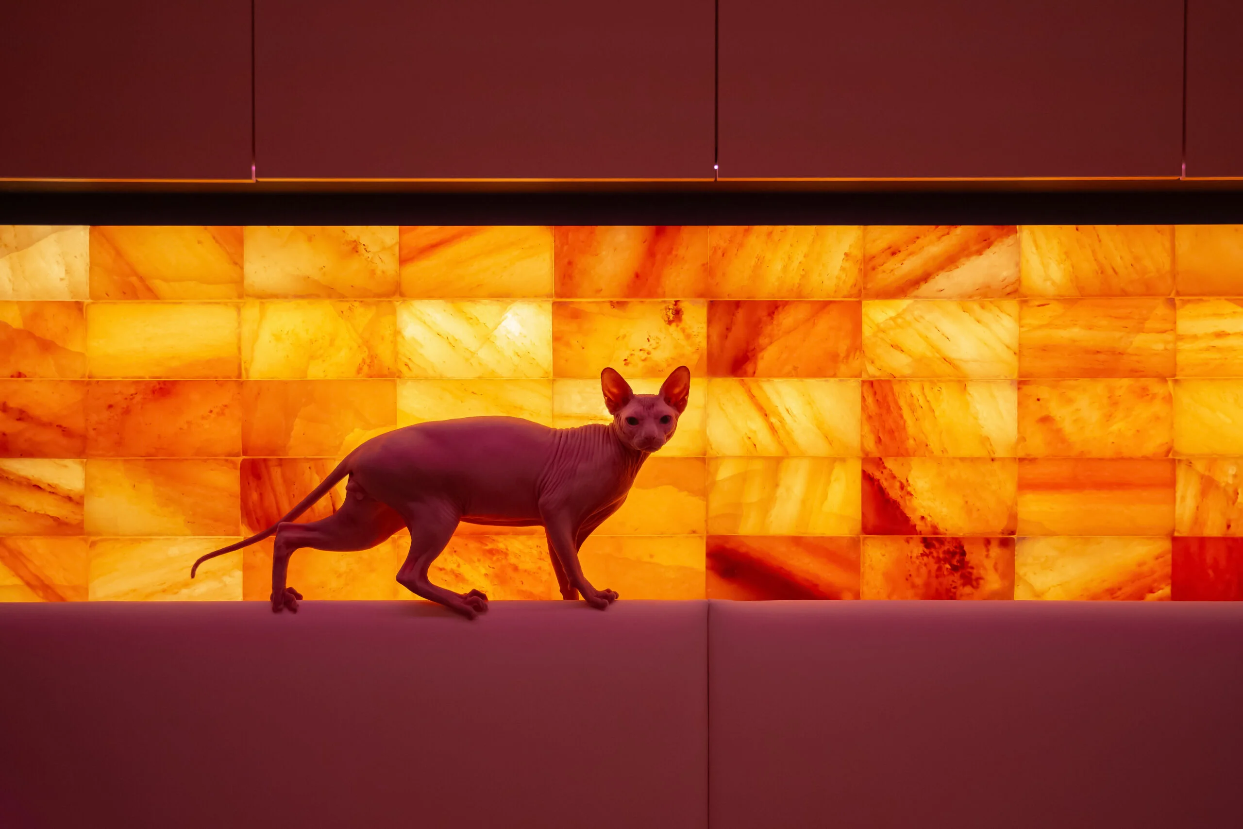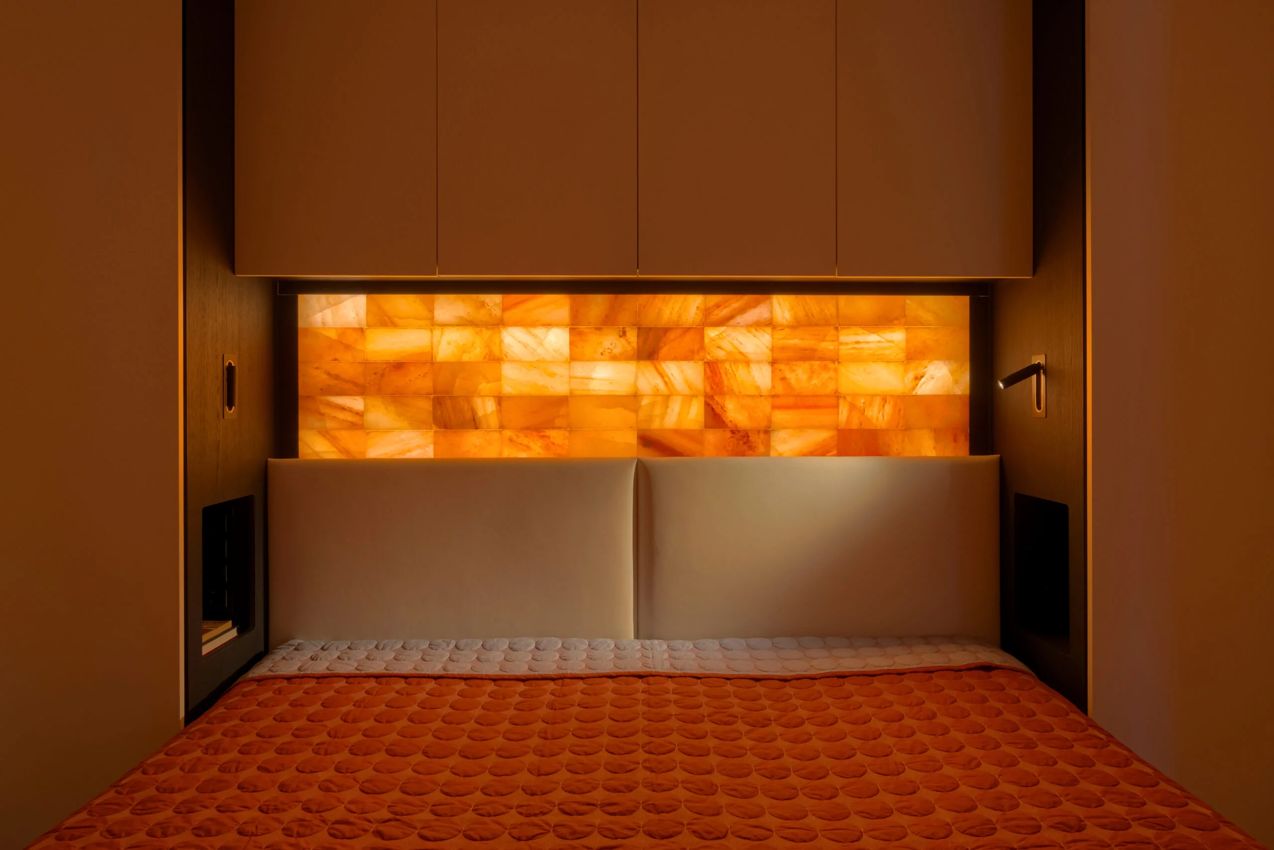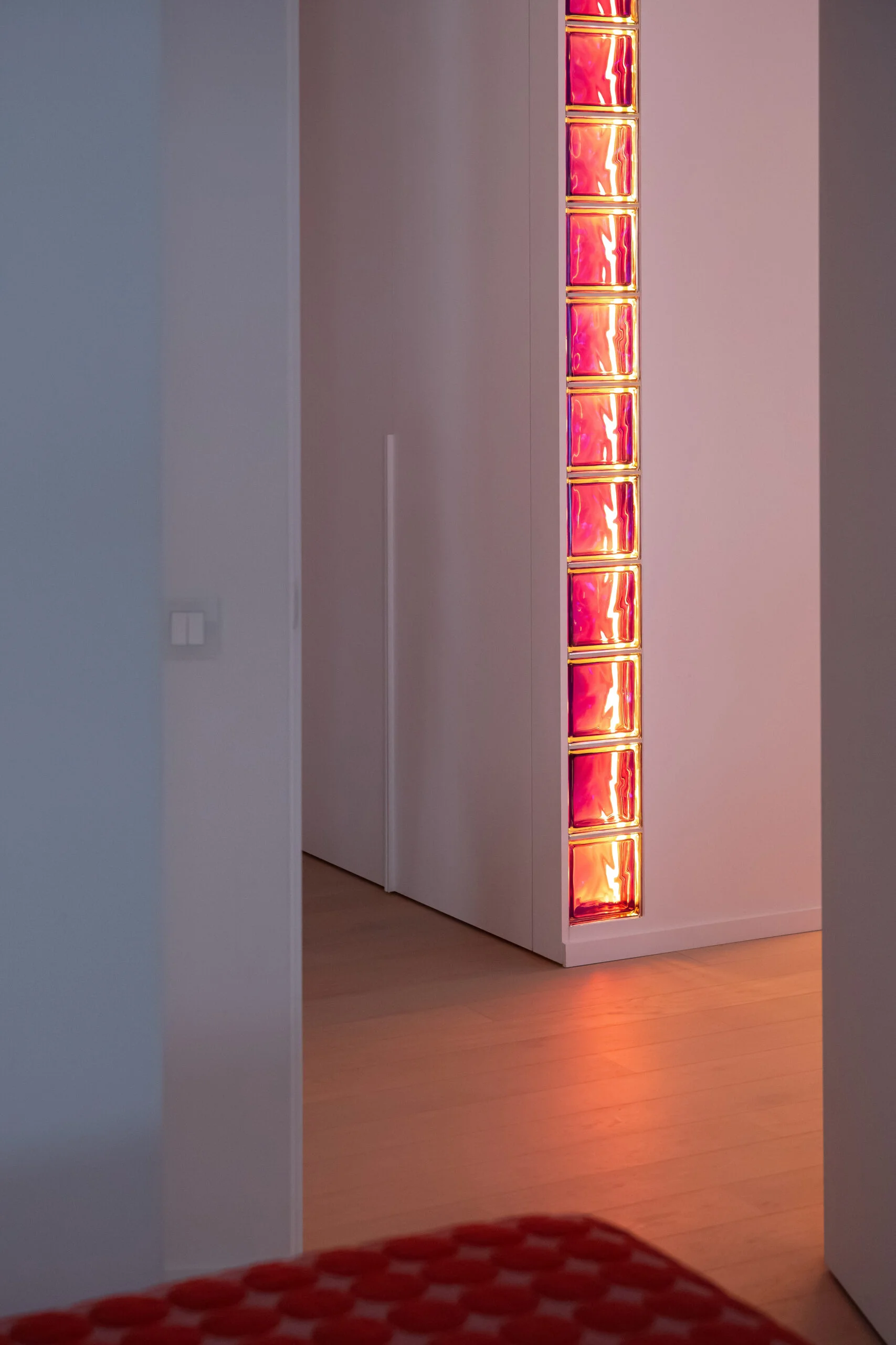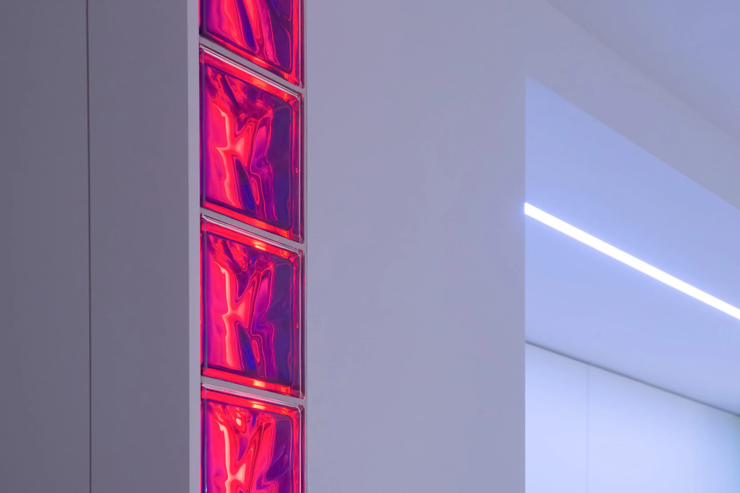 - Netradicinės medžiagos: estetinį ir funkcinį išskirtinumą suteikia rečiau gyvenamuosiuose interjeruose sutinkami elementai – skaidrūs stiklo blokeliai bei Himalajų druskos blokelių apdaila, suteikianti erdvei natūralios tekstūros ir šilumos.