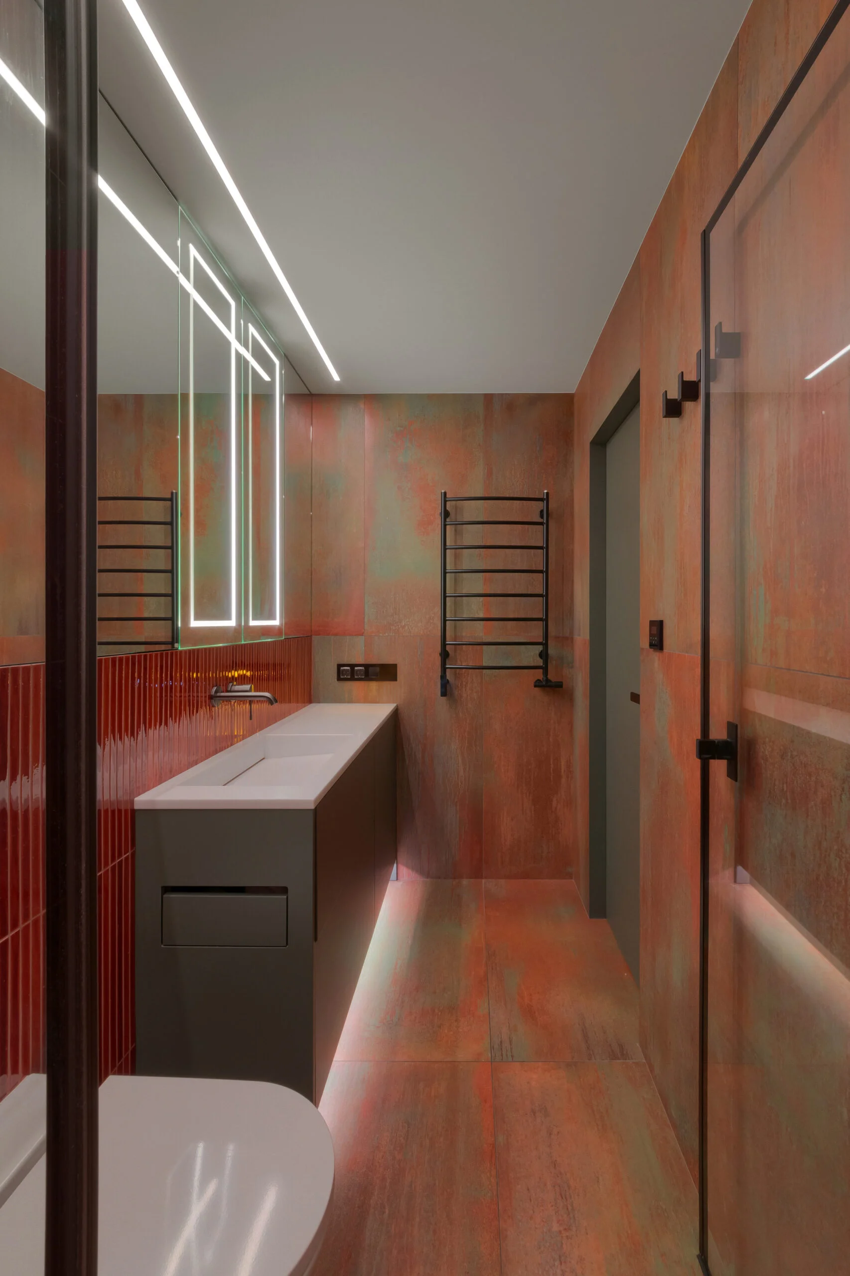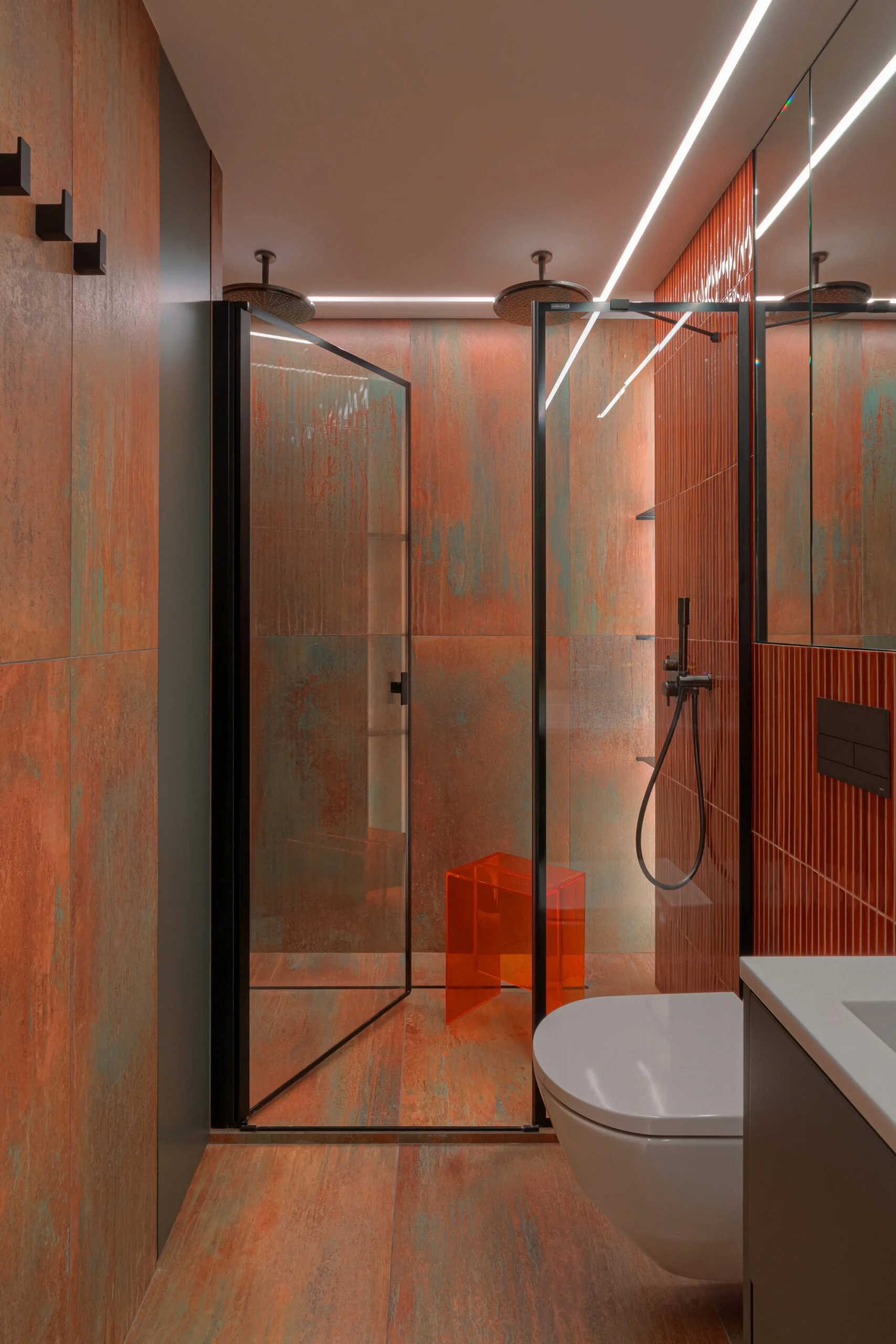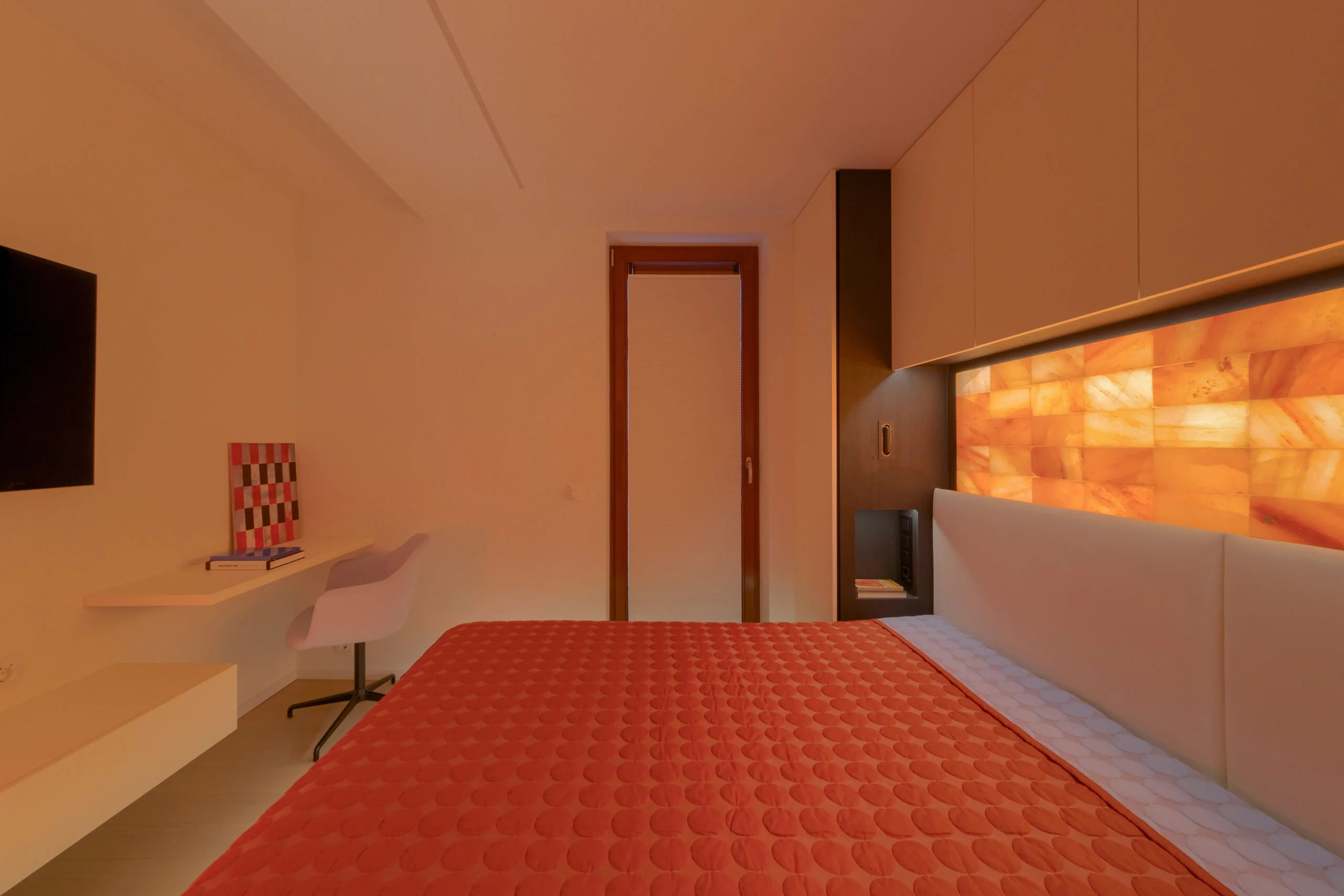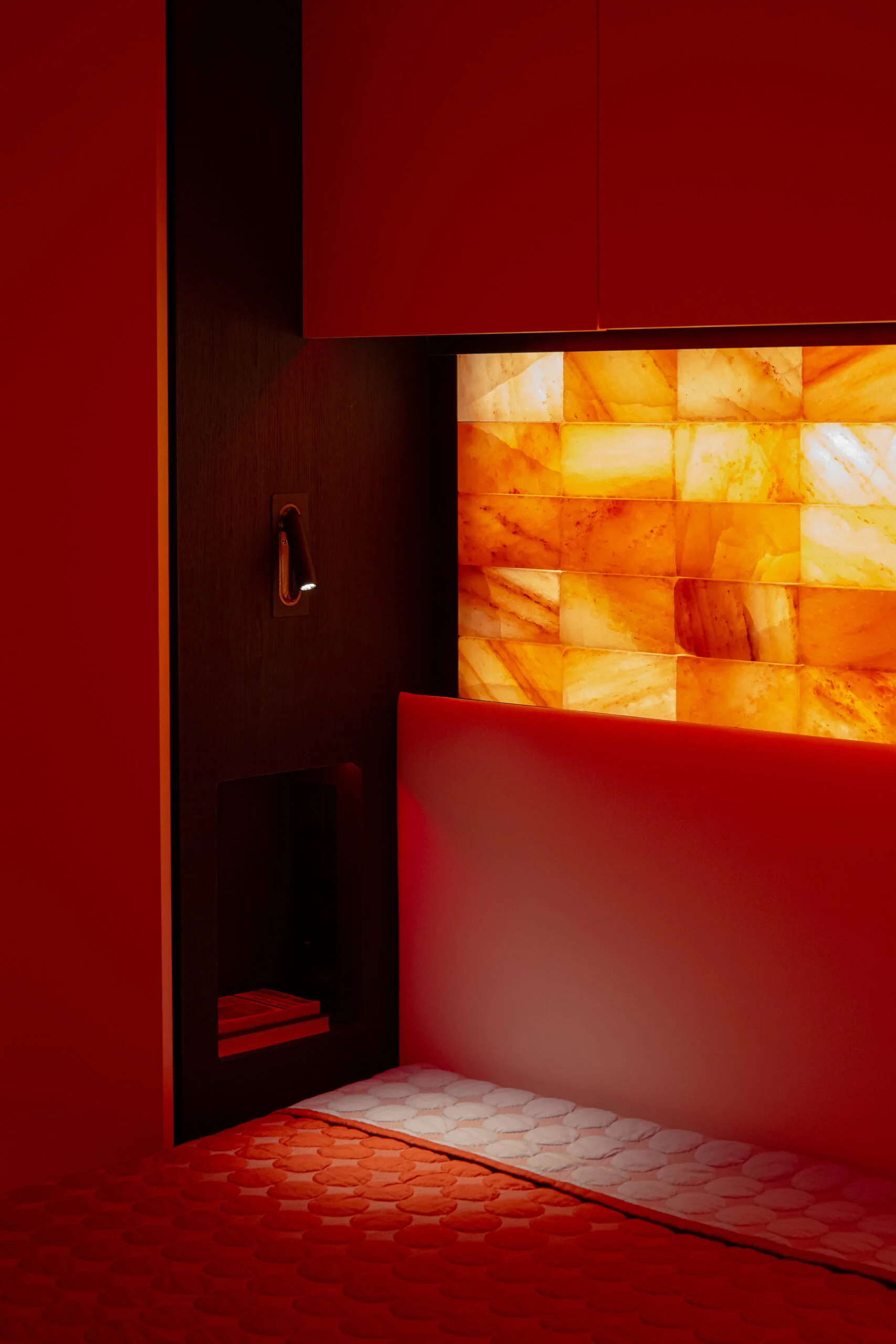 - Netradicinės medžiagos: estetinį ir funkcinį išskirtinumą suteikia rečiau gyvenamuosiuose interjeruose sutinkami elementai – skaidrūs stiklo blokeliai bei Himalajų druskos blokelių apdaila, suteikianti erdvei natūralios tekstūros ir šilumos.