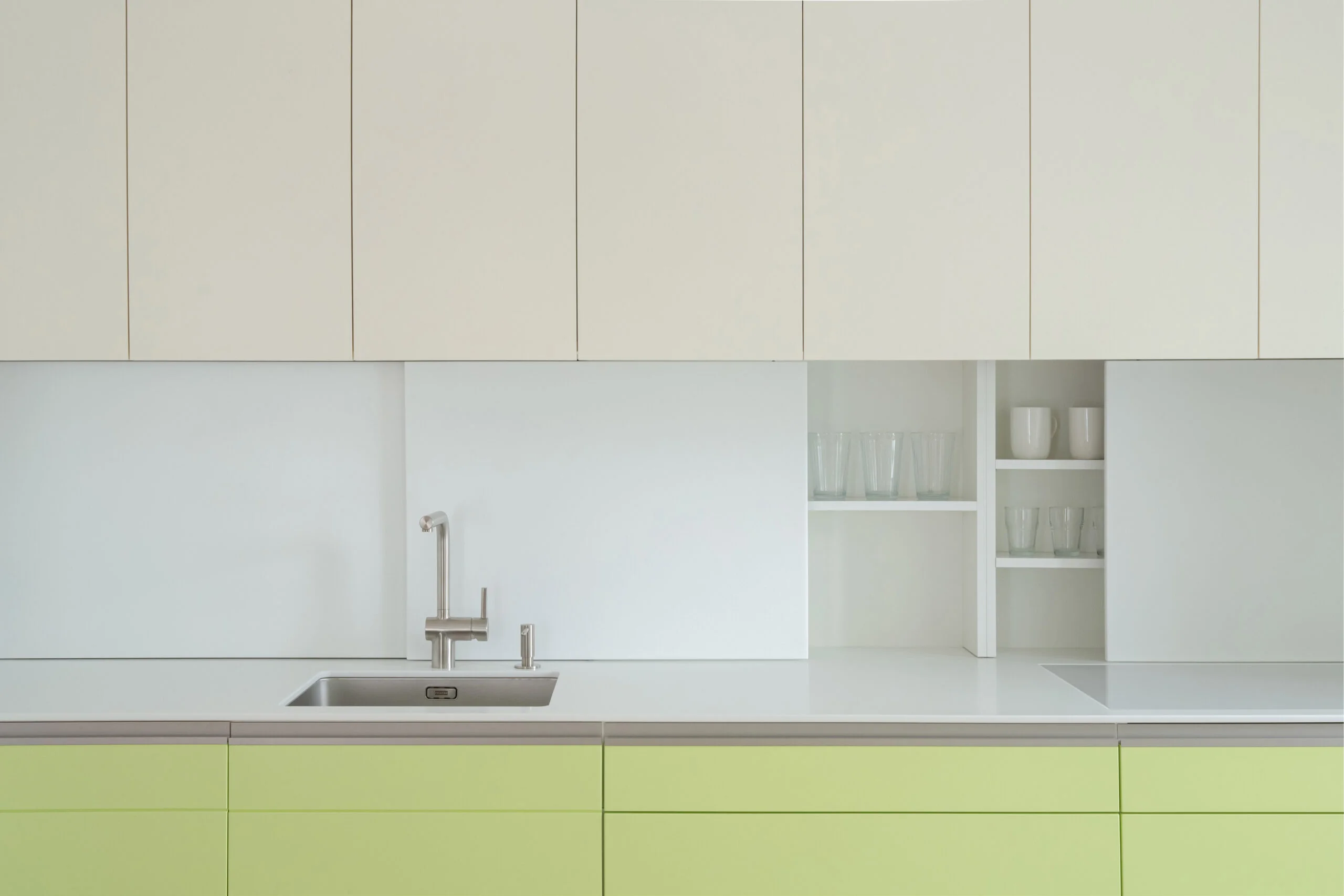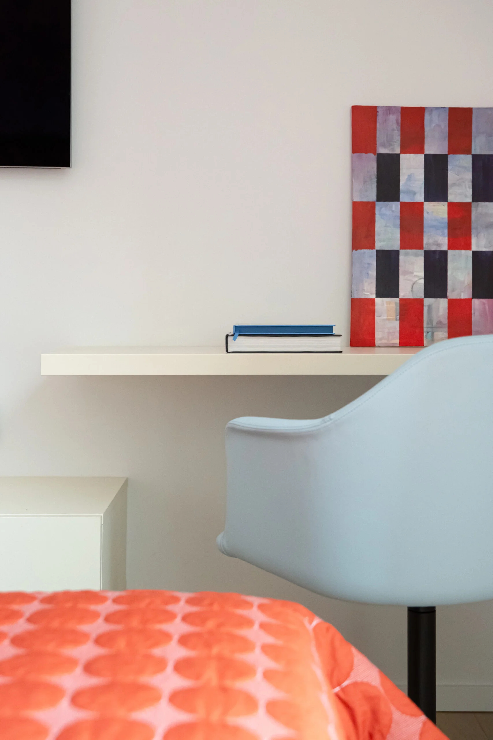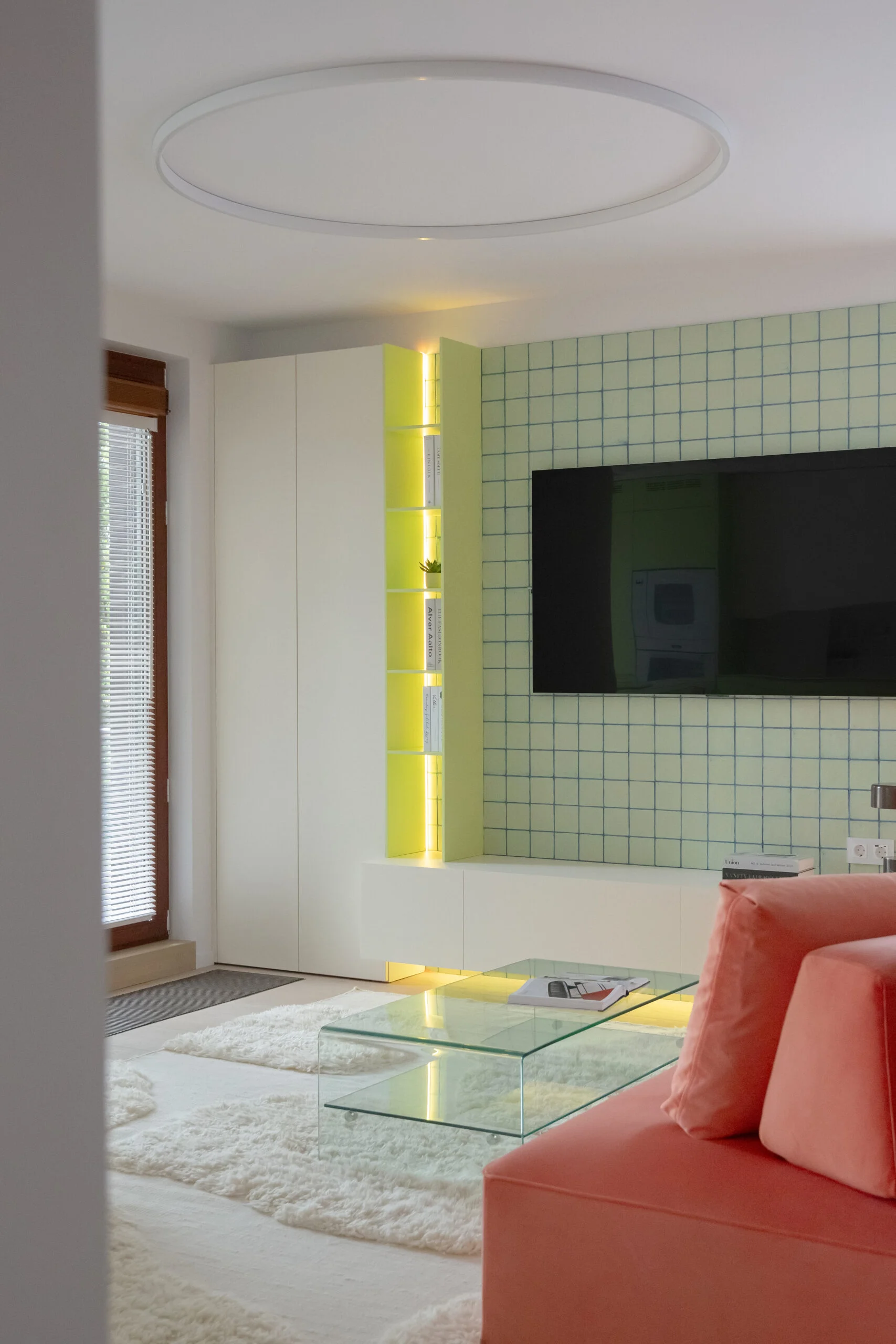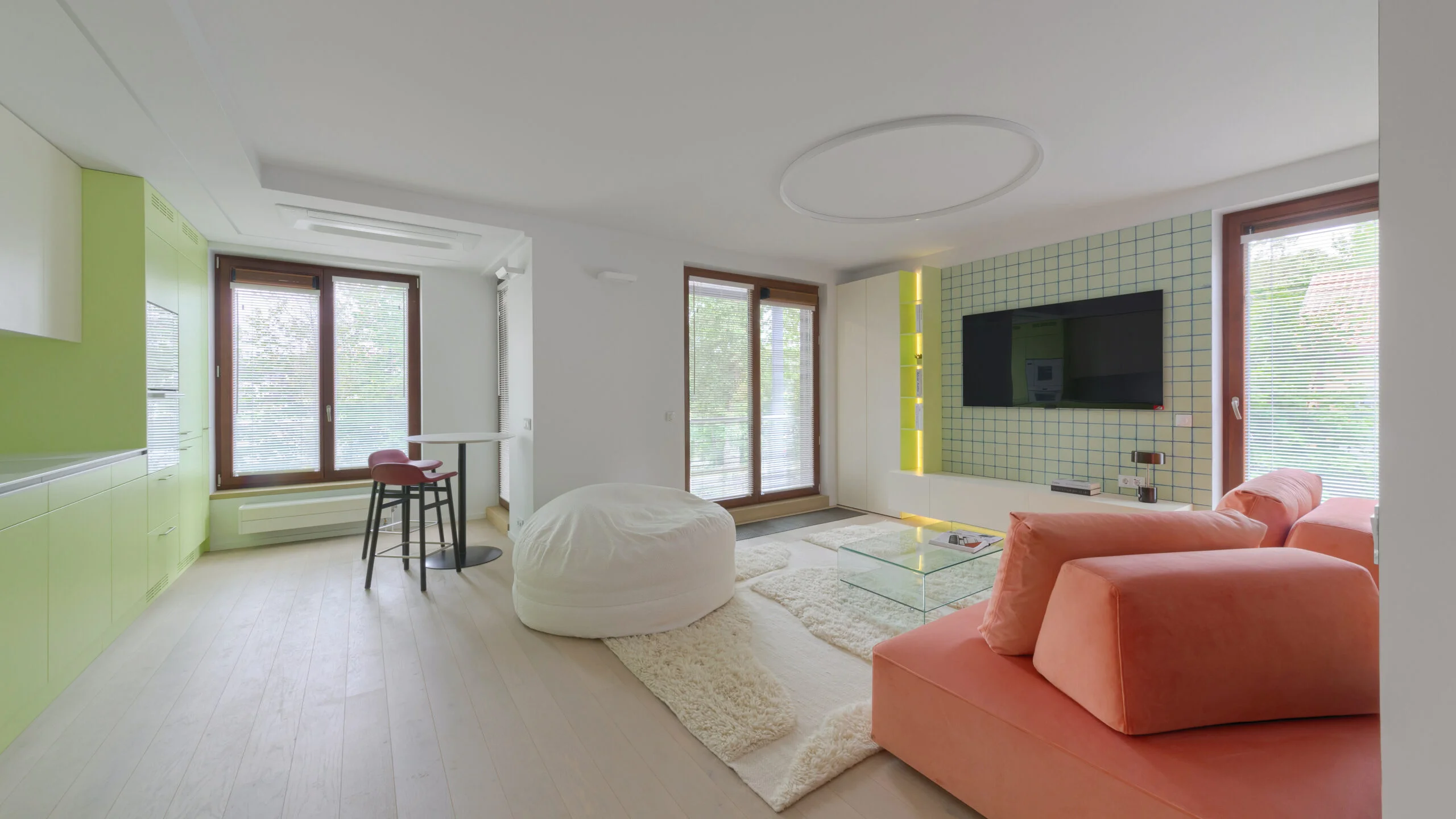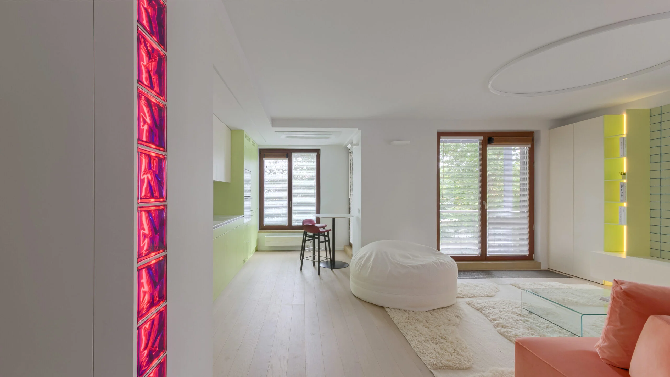 Šio buto interjeras Antakalnyje – tai drąsus eksperimentas, kuriame klasikinė pavasario paletė harmoningai sugyvena su moderniomis technologijomis ir intymia spalvų drama.