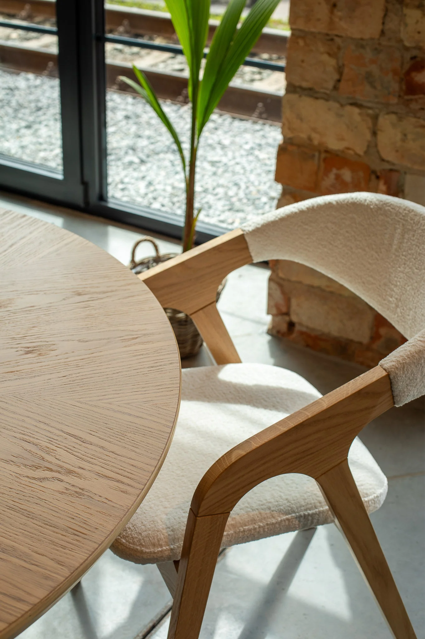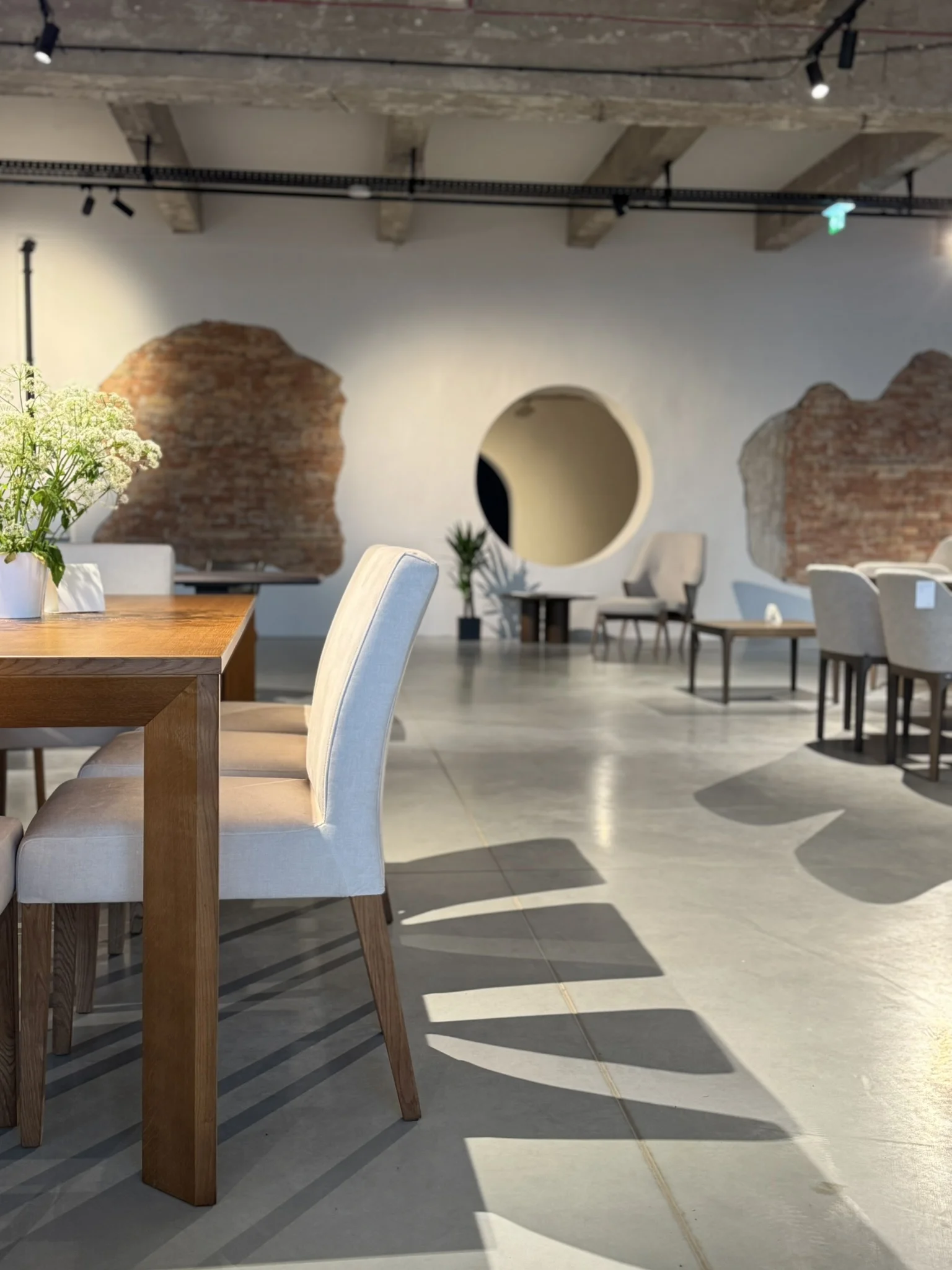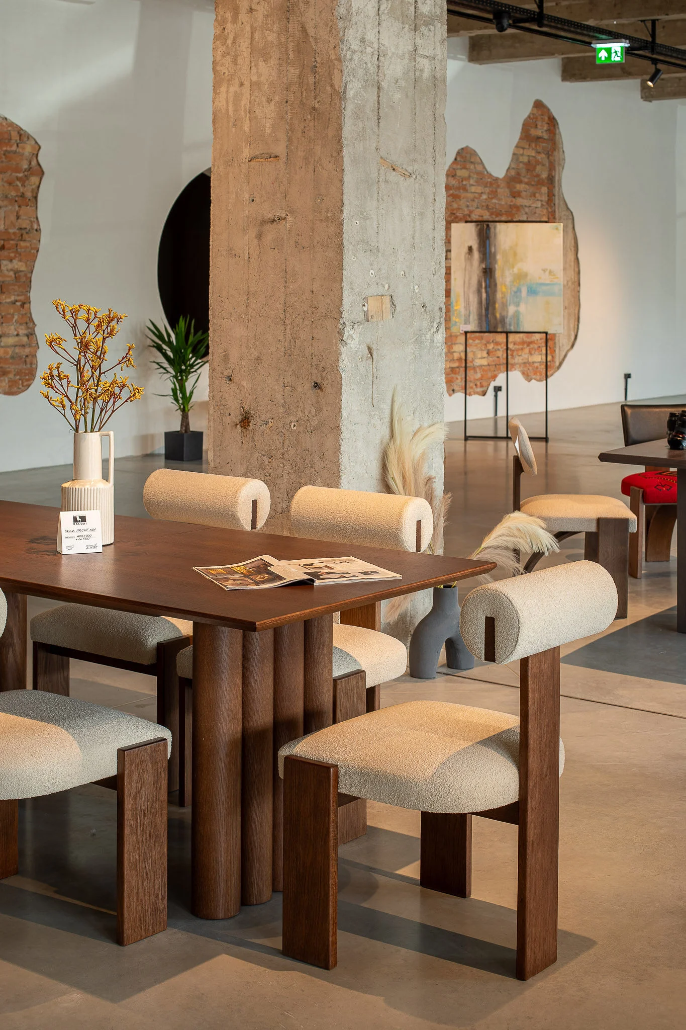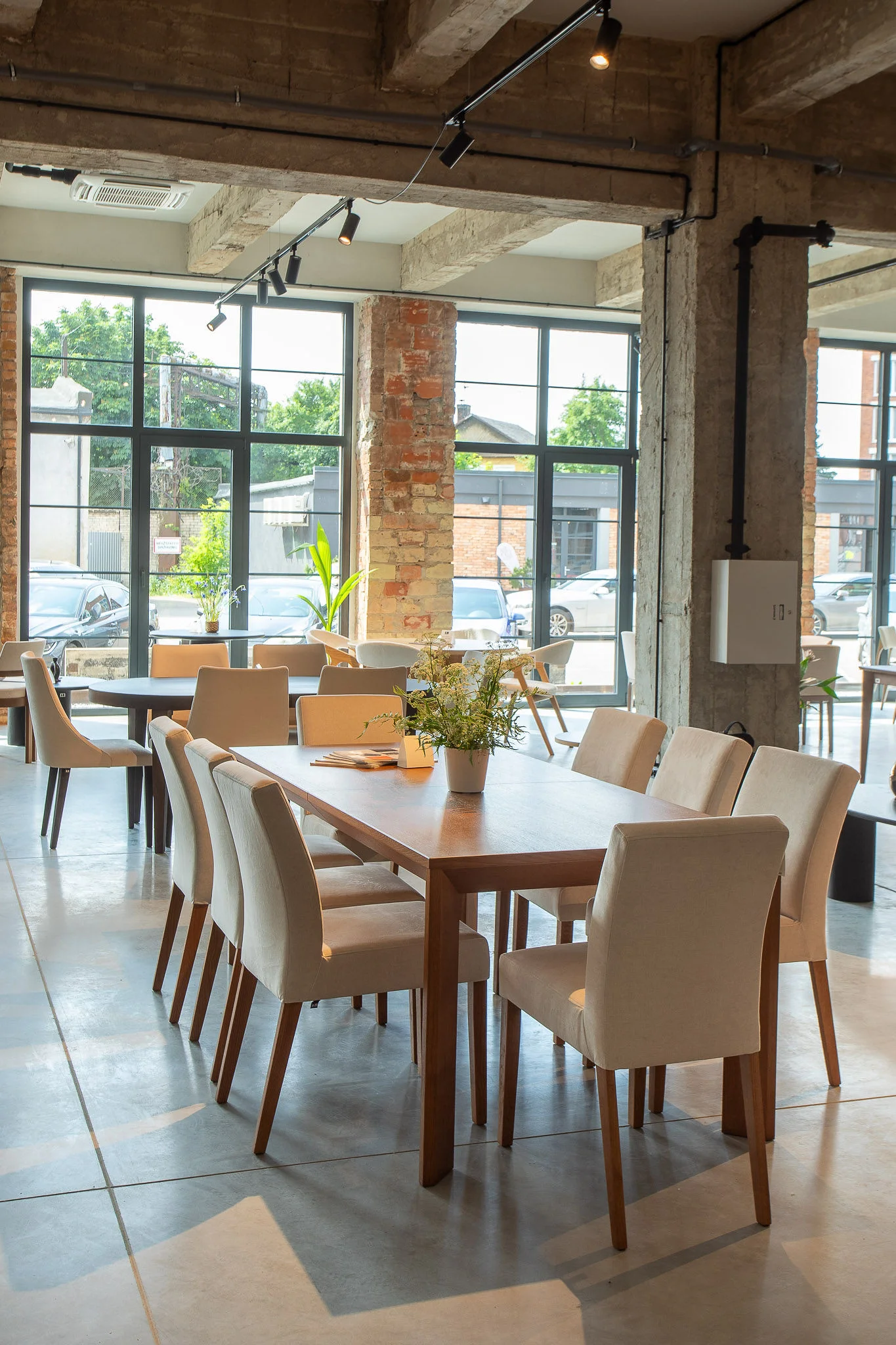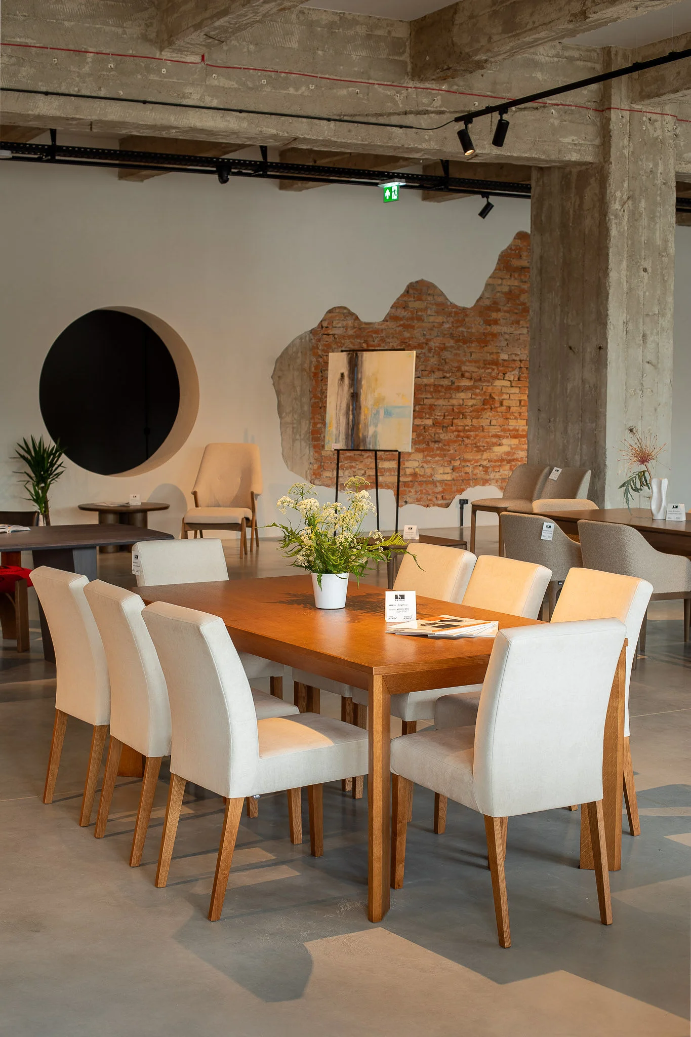 MATERIJA salono erdvėje gausu natūralios šviesos – ji padeda atskleisti baldų faktūras, medienos raštą, spalvų niuansus. Industrinio stiliaus kontrastas derinamas su šiltais medžio tonais, užapvalintomis baldų formomis ir tekstile – pabrėžiamas tiek baldų, tiek interjero unikalumas. Visa tai padidina ne tik vizualinį, bet ir taktilinį patyrimą – klientas gali prisiliesti prie medžiagos. Tokiu būdu MATERIJA tampa vieta, kur ne tik prekiaujama baldais, bet ir padedama klientui priimti geriausią sprendimą – tiek vizualiai, tiek praktiškai.
