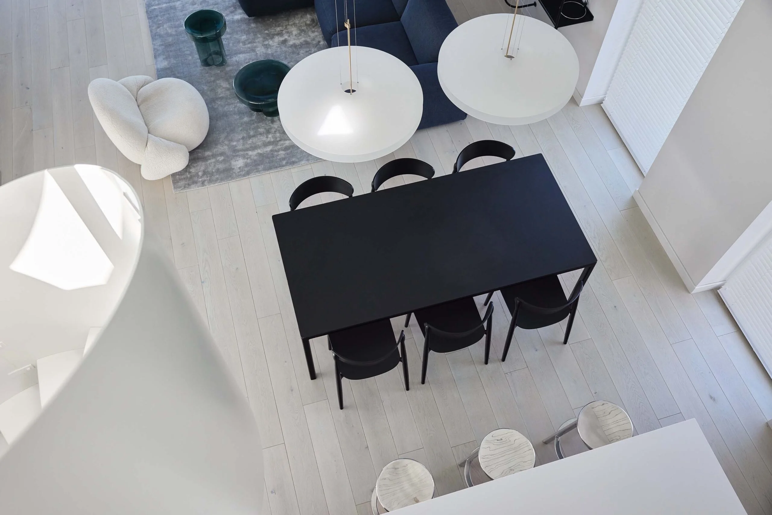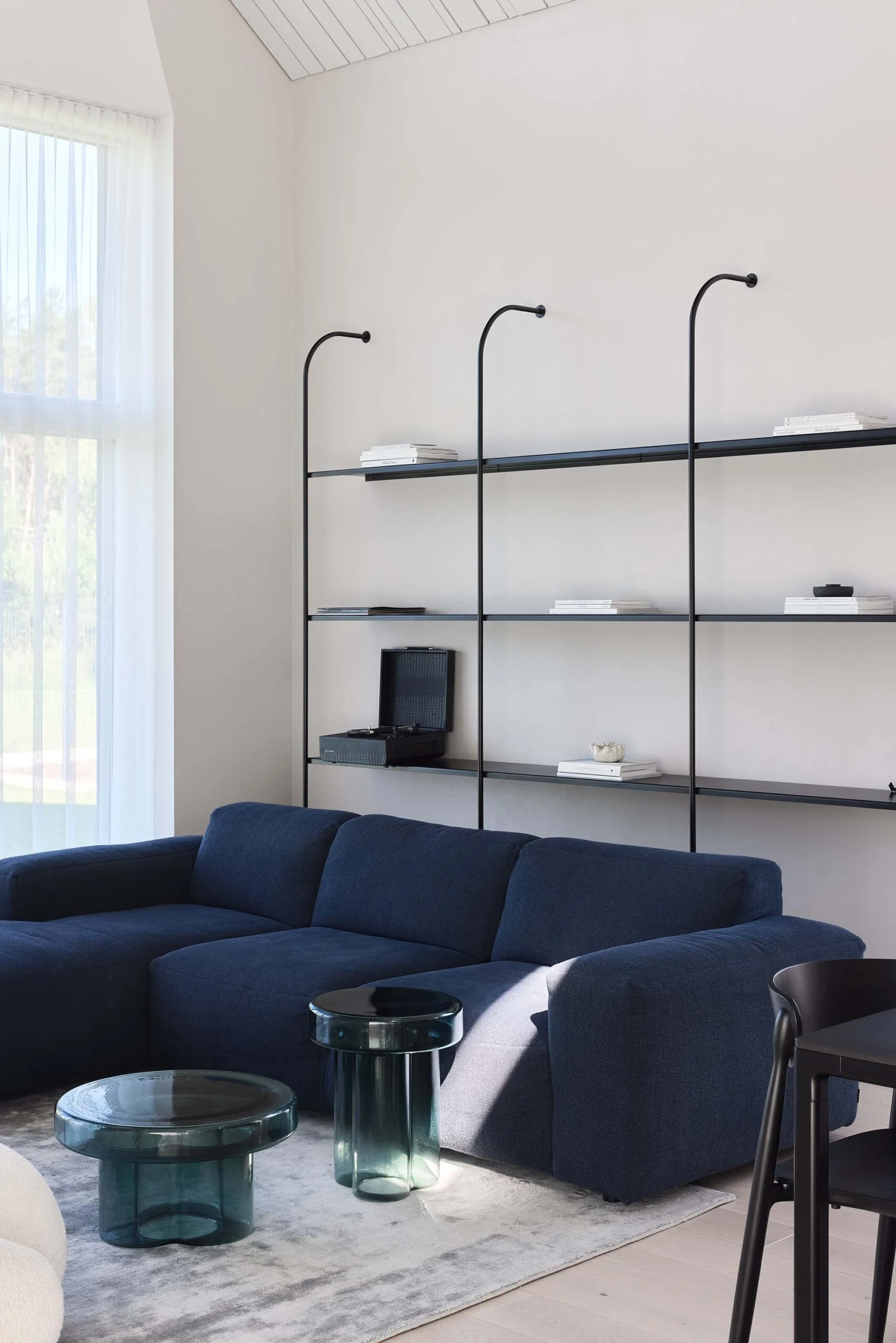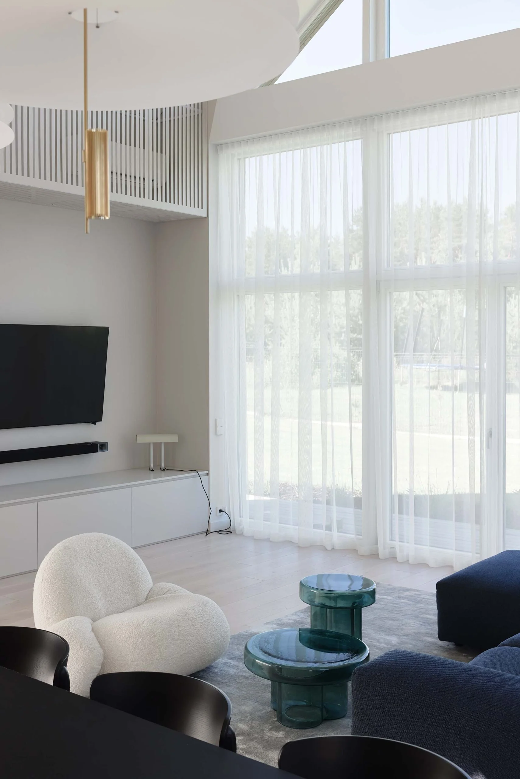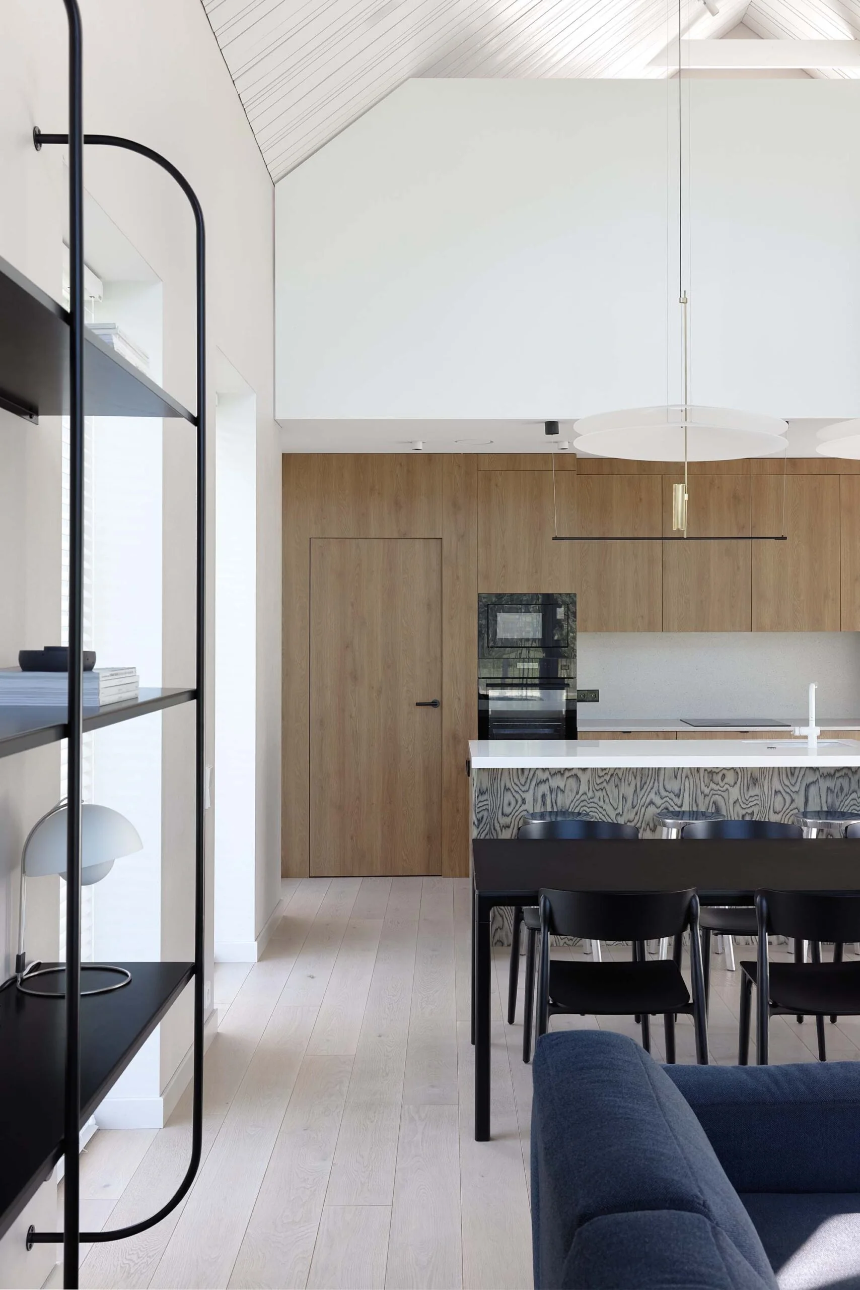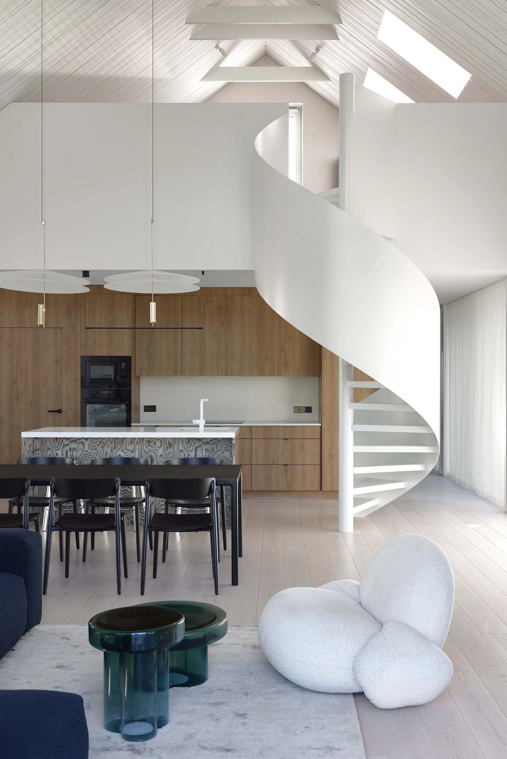 Pagrindinėje namo erdvėje išryškėja keli ryškesni objektai – išraiškingo rašto virtuvės sala, tamsiai mėlyna sofa, stiklo staliukai ir skulptūriškos formos fotelis. Jie tampa vizualiniais intarpais, kurie suteikia erdvei dinamikos, tačiau nepaneigia bendros ramios nuotaikos.
