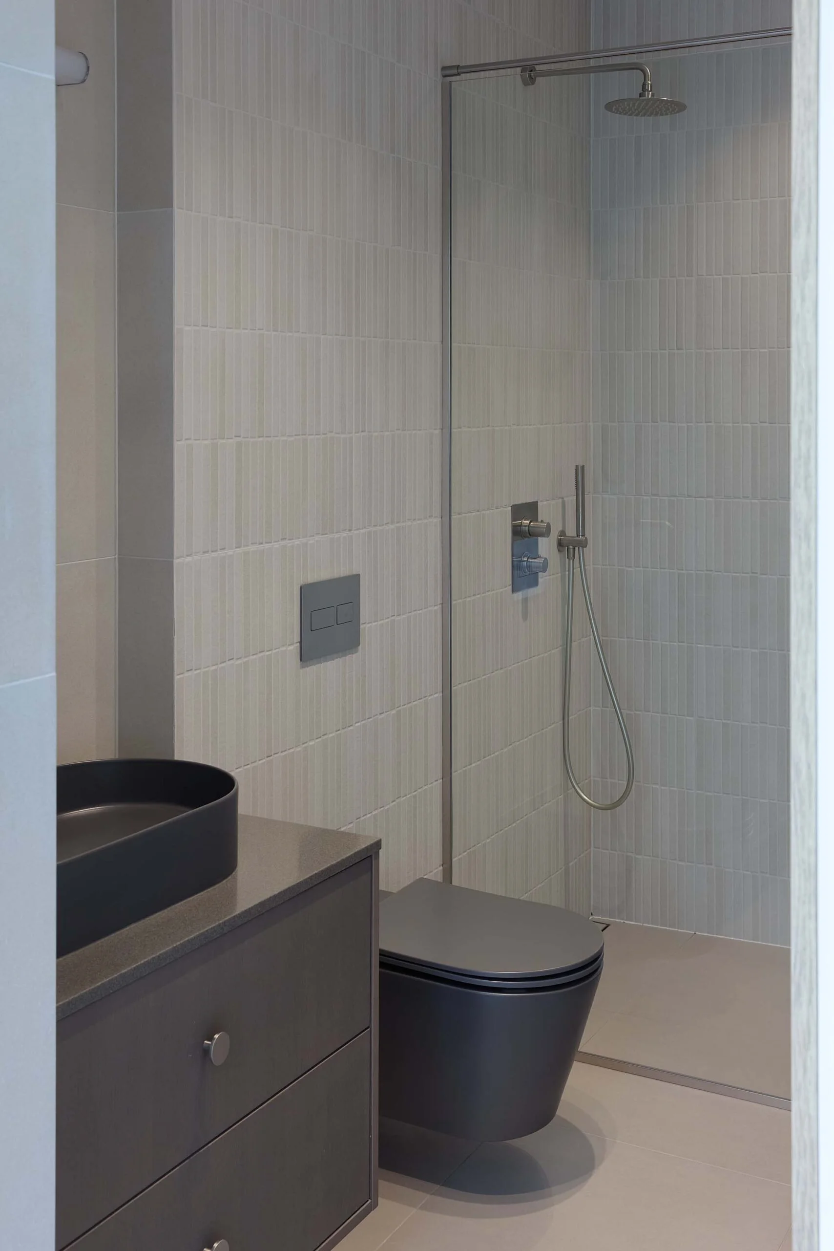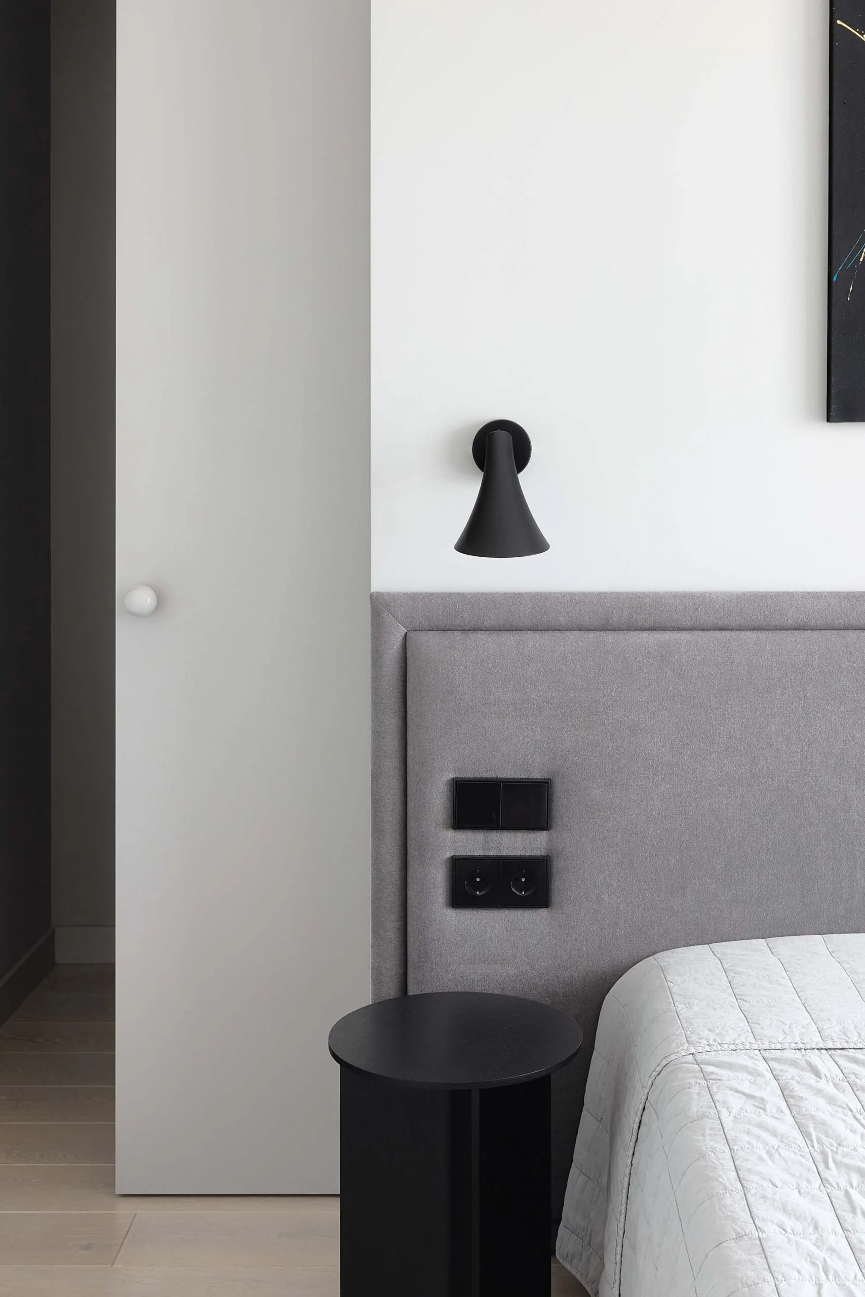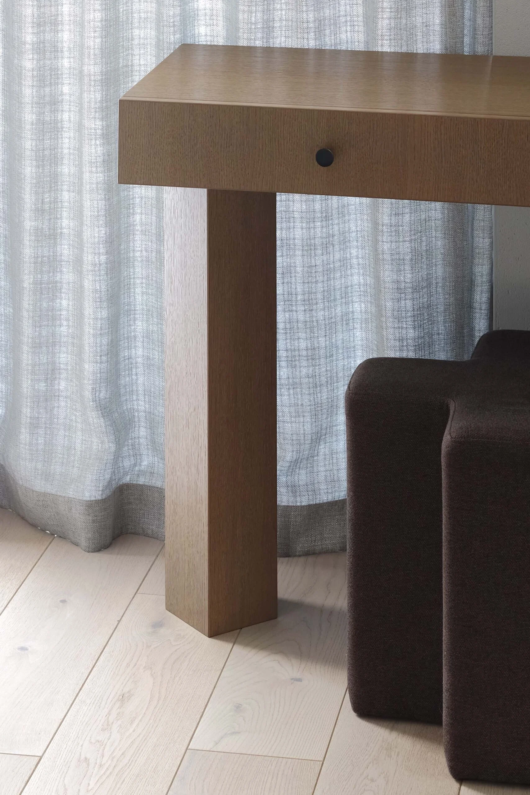 Namo medžiagiškume vyrauja natūralios faktūros: medžio parketlentės gyvenamosiose erdvėse, mikrocemento grindys tambūre, medžio faneruotos virtuvės plokštumos ir tekstilės akcentai. Sienos paliktos lengvai grublėtos, todėl šviesa, krisdama skirtingais kampais, sukuria subtilų paviršiaus žaismą.