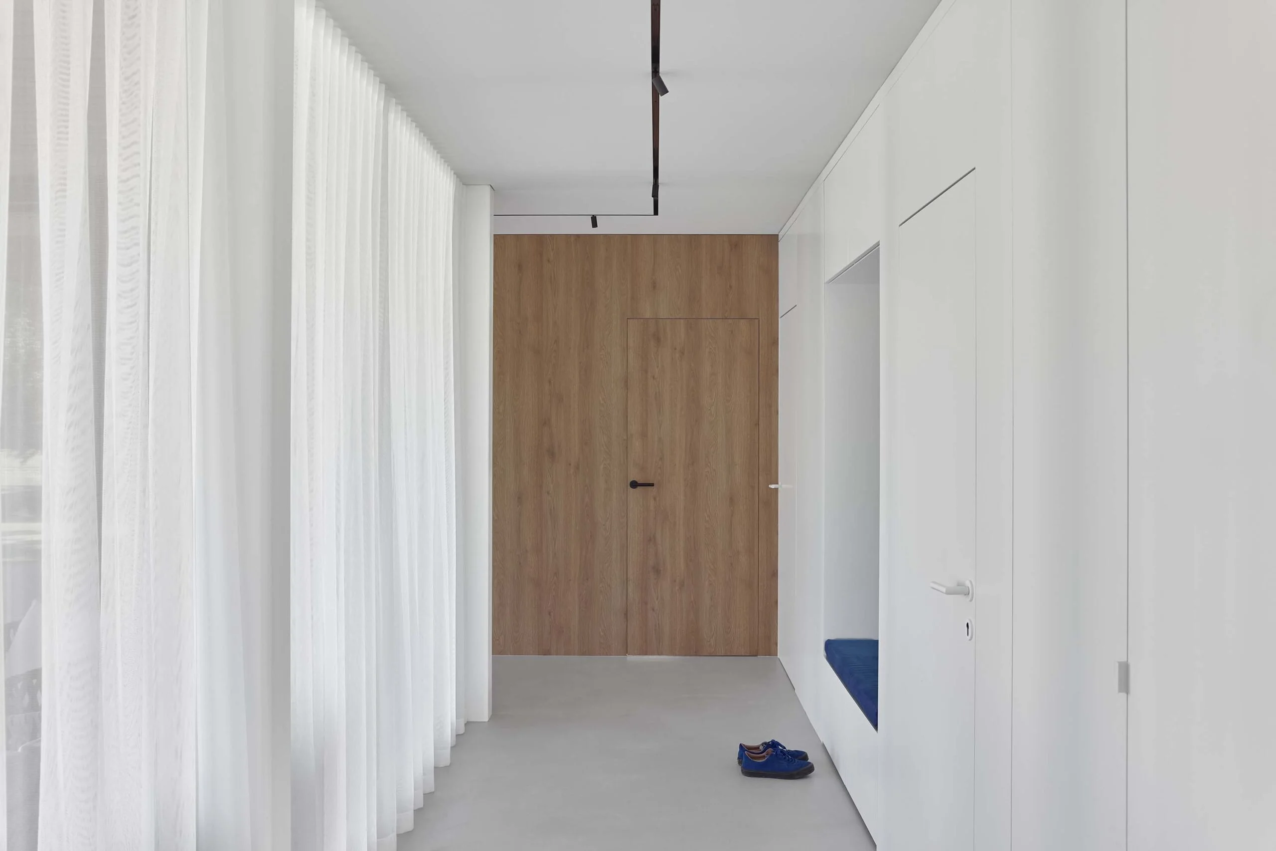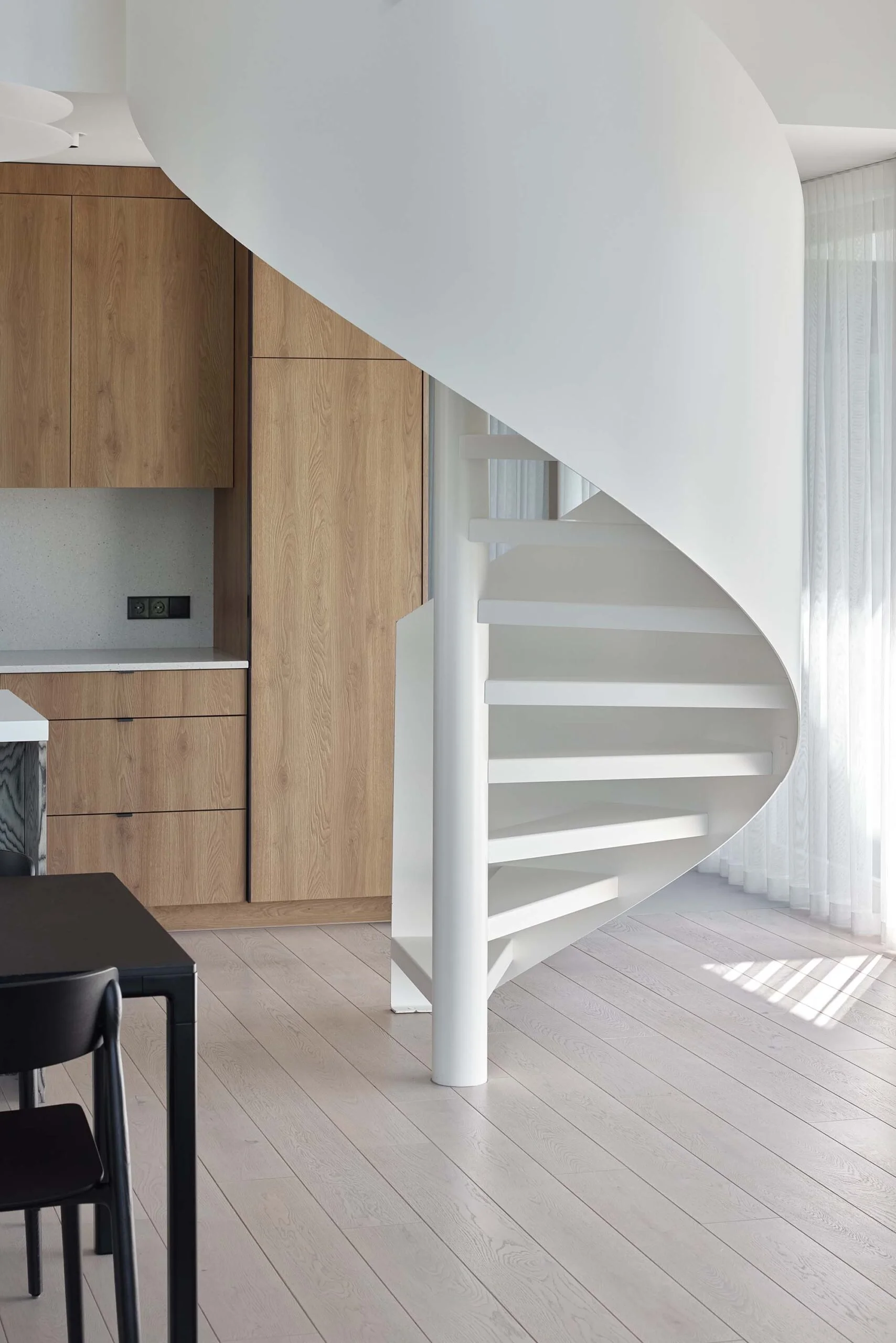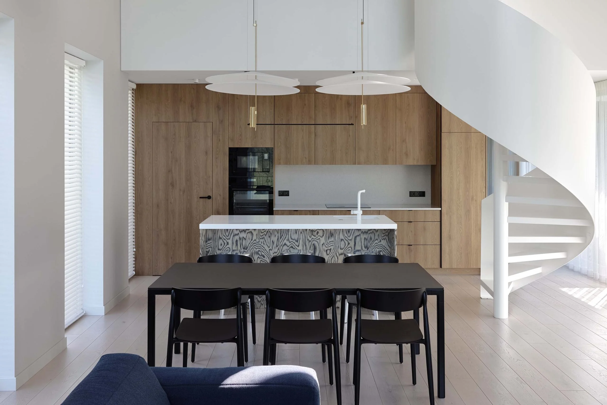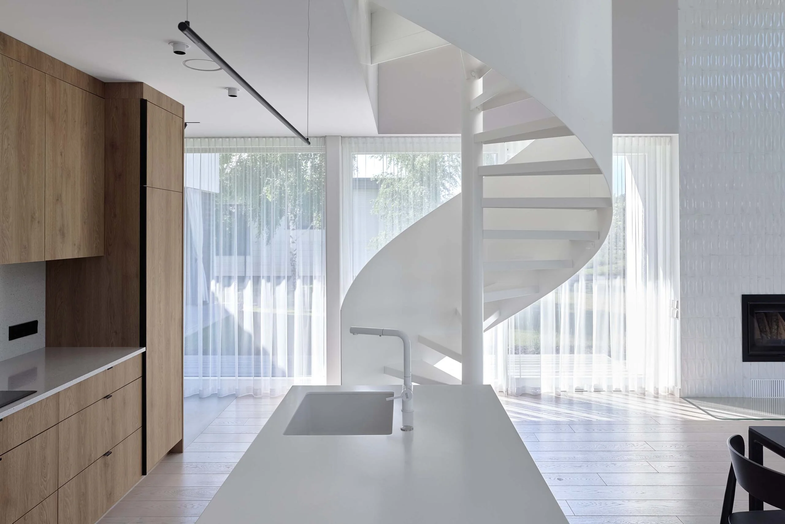 Interjeras organiškai papildo architektūrą – architektūrinė struktūra ir interjero sprendimai veikia kaip vientisa visuma, kurioje dera švara, estetika ir funkcionalumas.