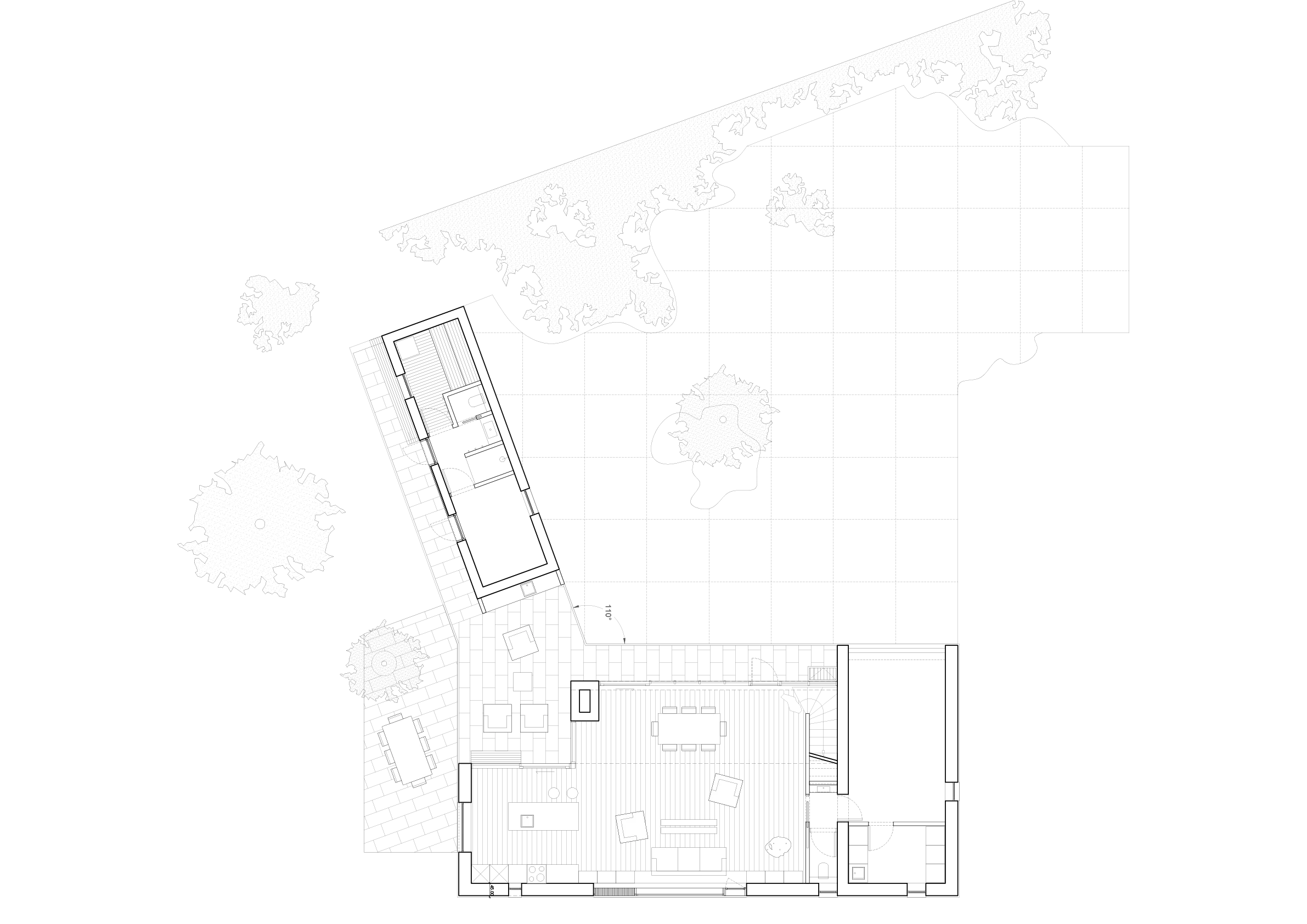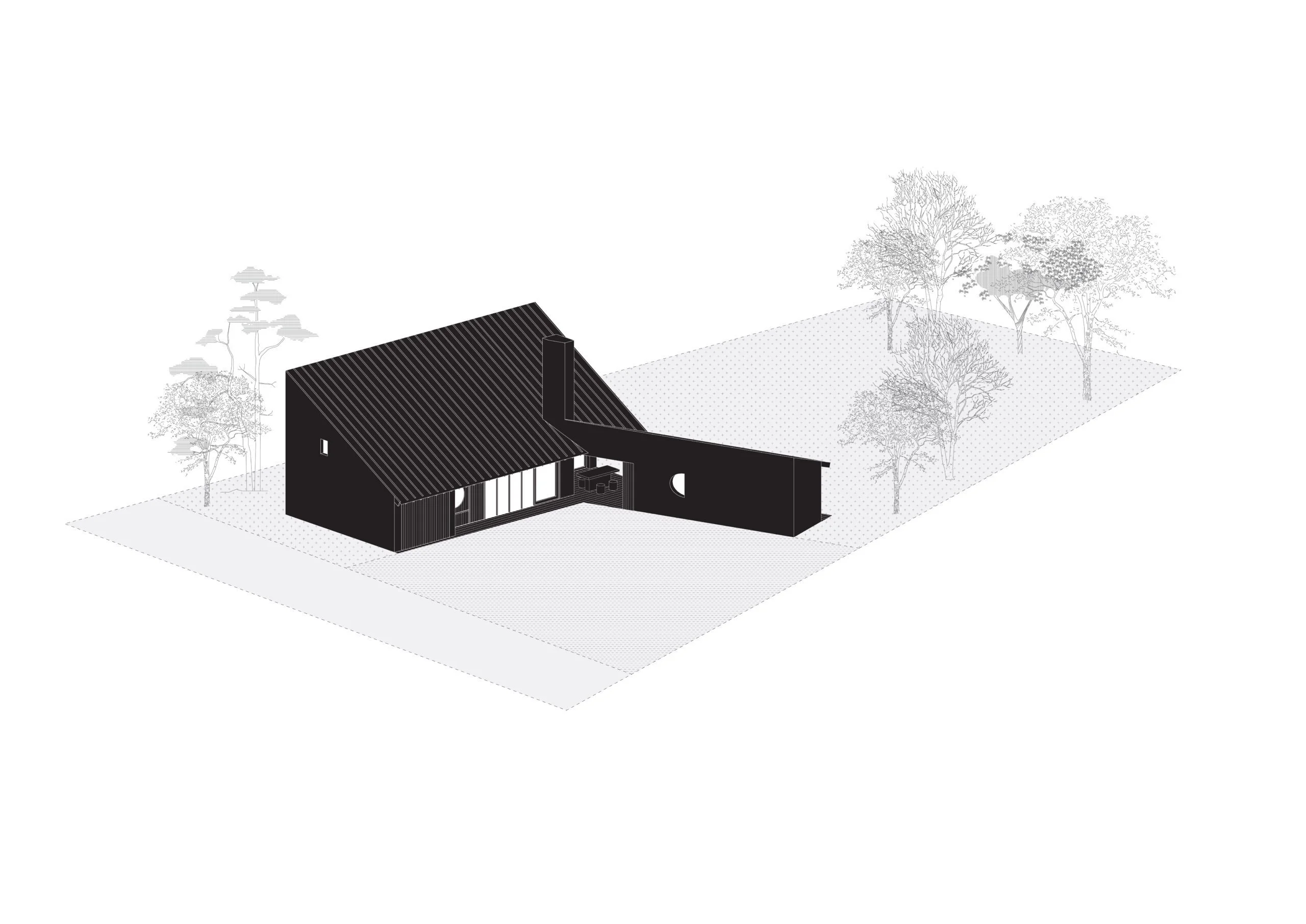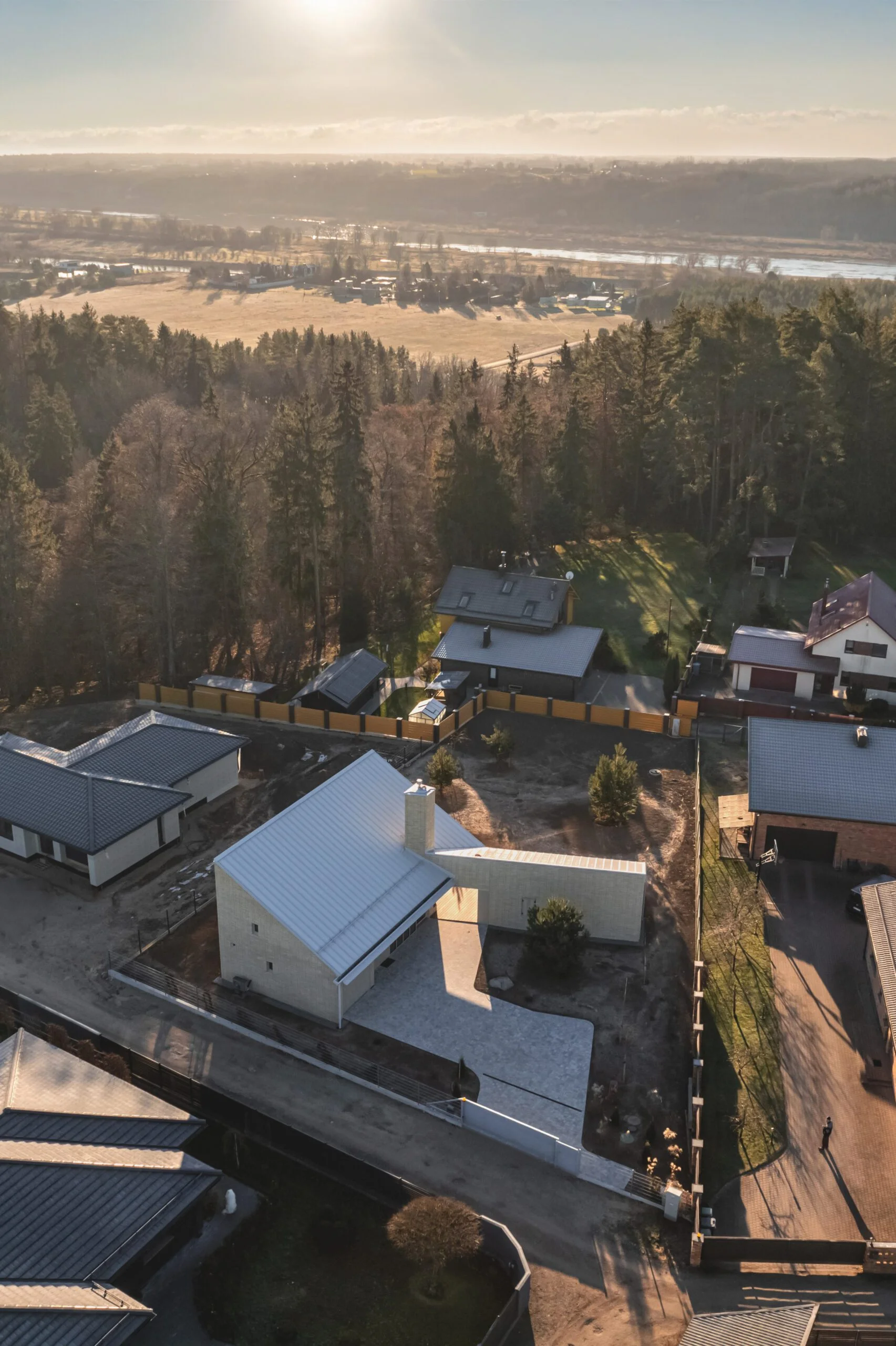 Namo architektūrinis sprendimas harmoningai suderina estetiką ir funkcionalumą. Išsikišę stogo elementai pietiniame ir vakariniame fasaduose sukuria jungtį tarp vidaus ir lauko erdvių, formuodami dosniai dengtą zoną. Šios kompozicijos šerdyje – lauko židinys ir vasaros virtuvė, tapę centrine namo ašimi.