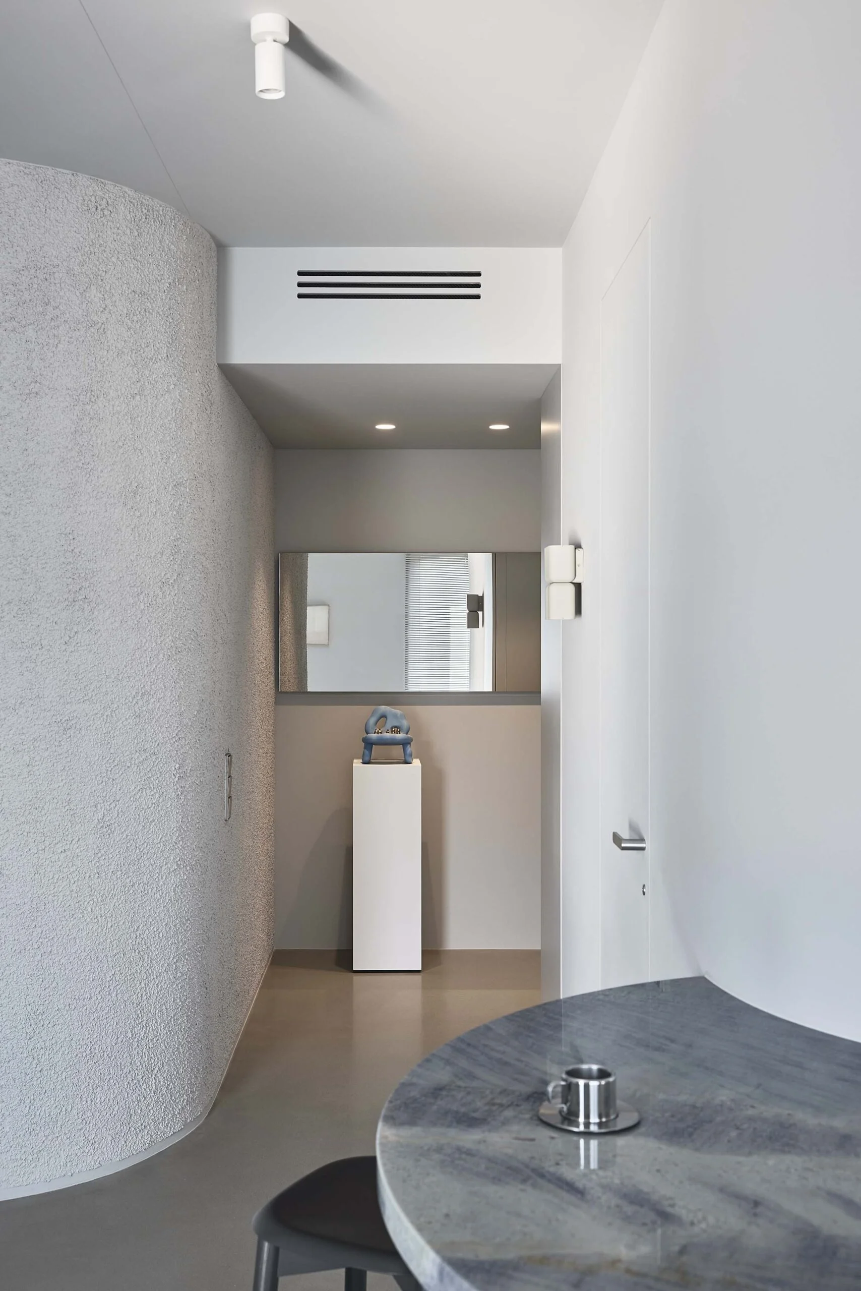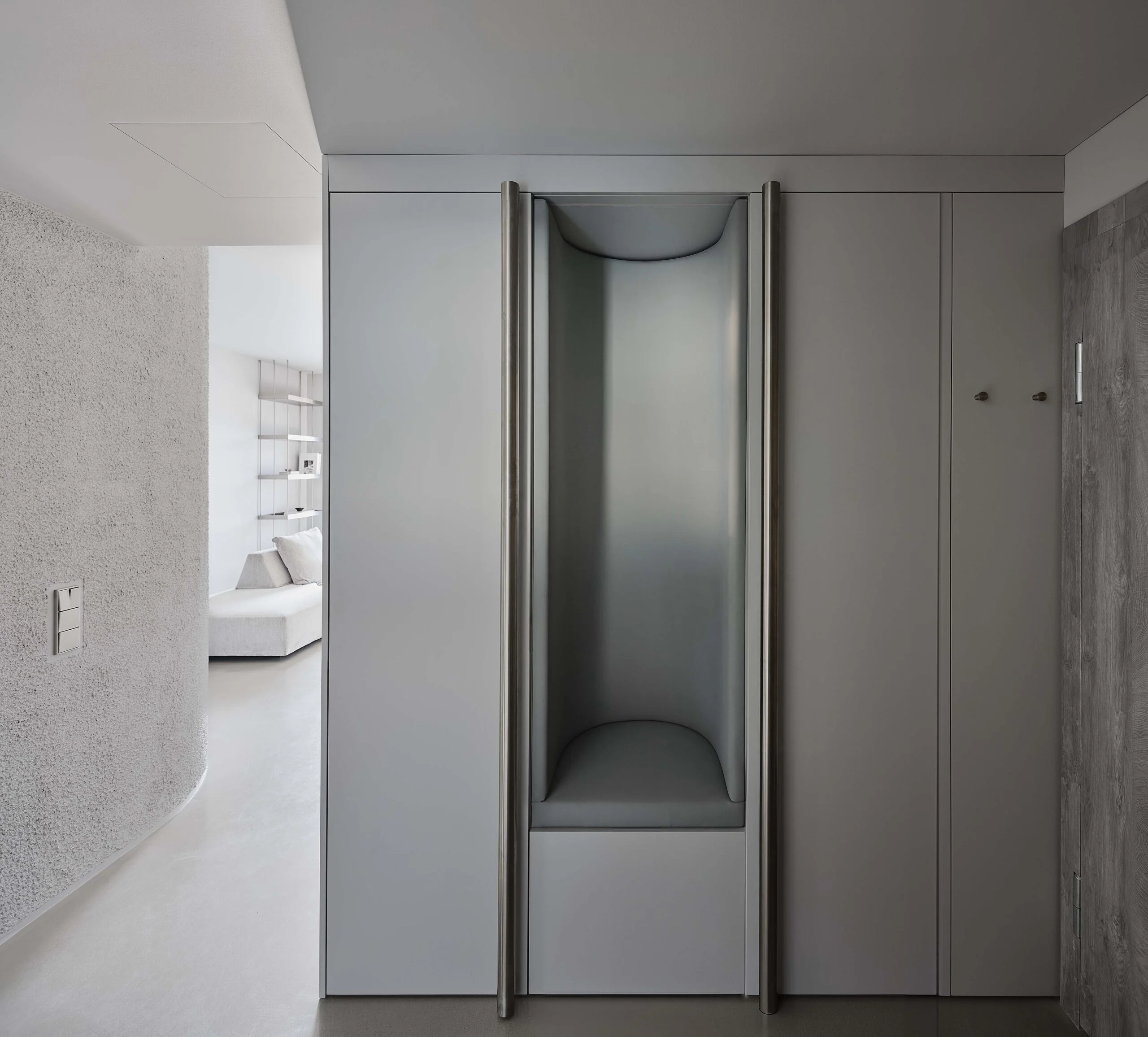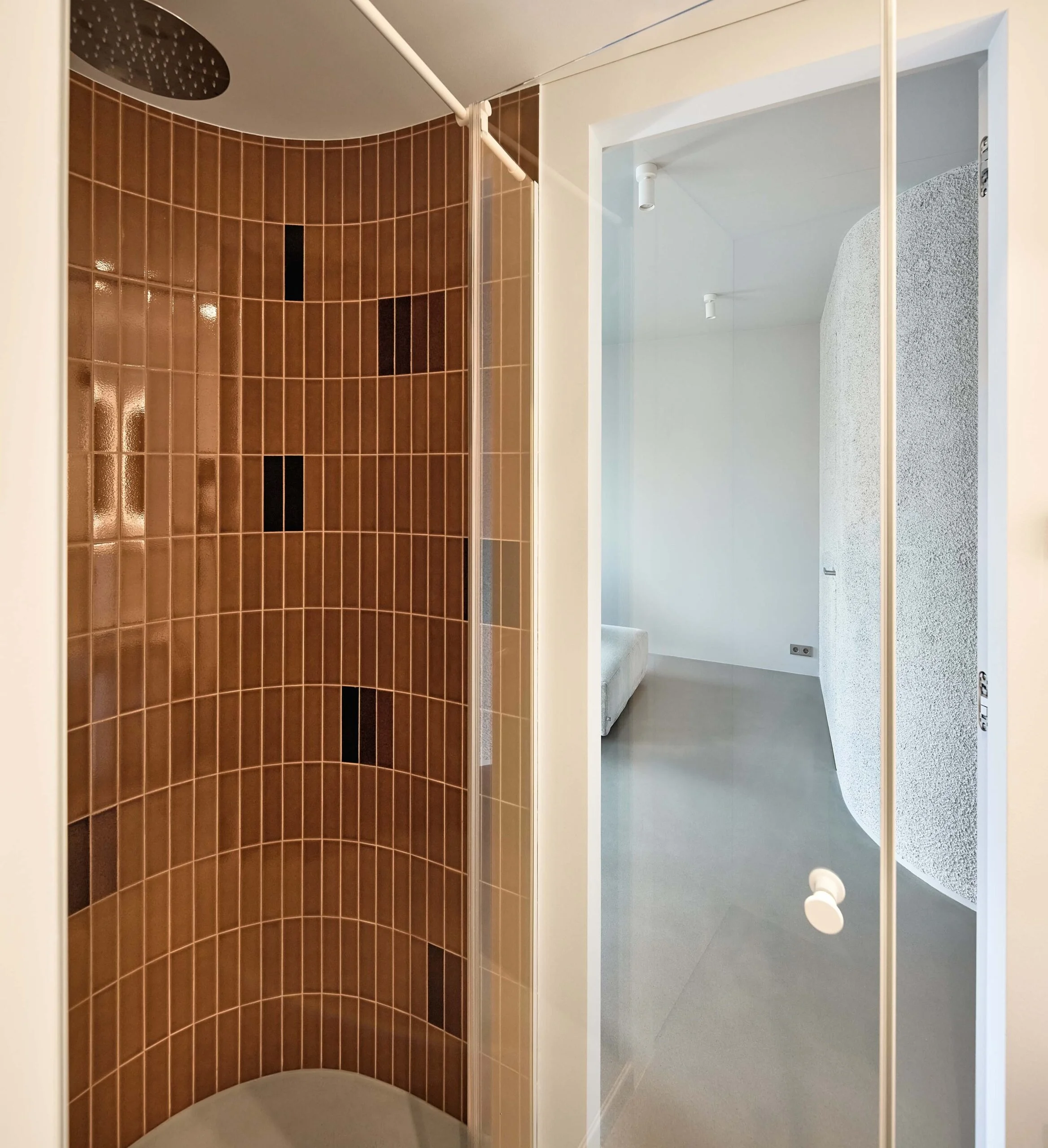 Miegamasis ir vonios kambarys kontrastuoja su pilkomis bendrosiomis zonomis, čia vyrauja balta spalva su keliais spalvų akcentais. Vonios dušo zonoje naudojamos „FormaFantasma“ dizaino studijos sukurtos plytelės, padengtos vulkaninio pelenų glazūra, kurios išryškina meninę išraišką tiek vizualiniu, tiek pojūčių aspektu.