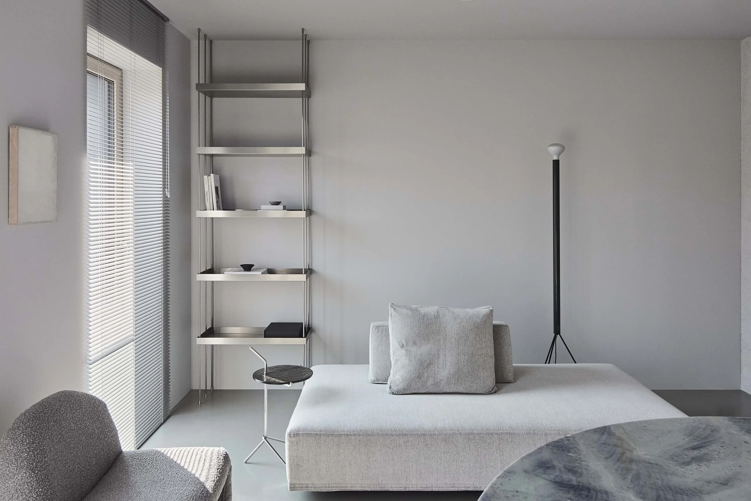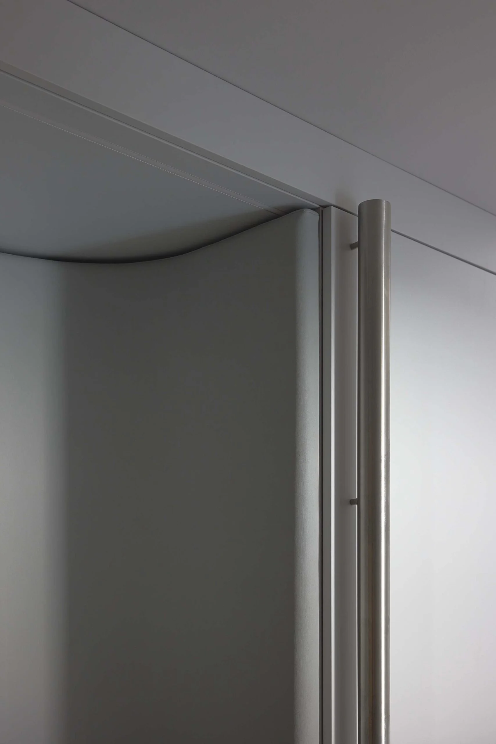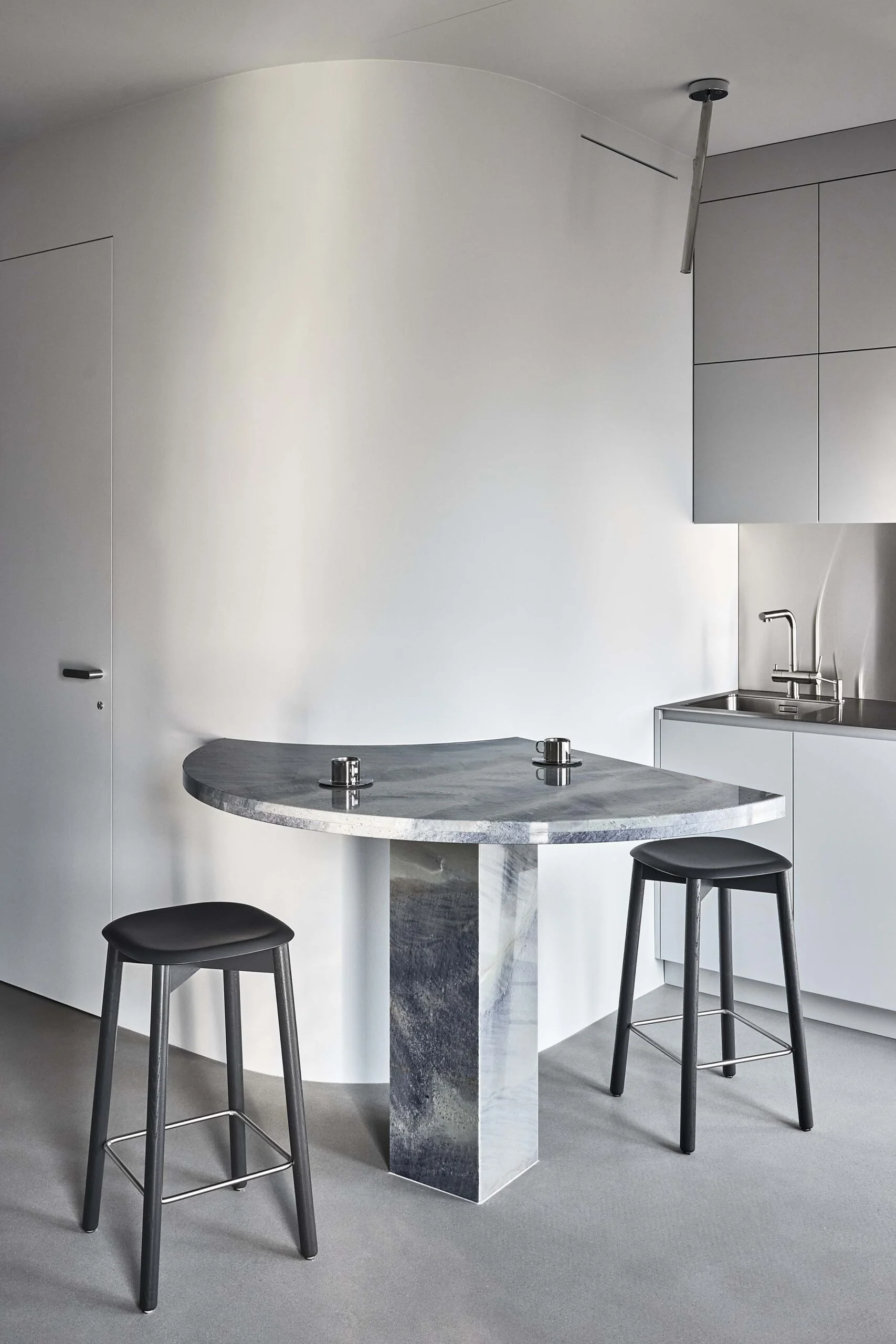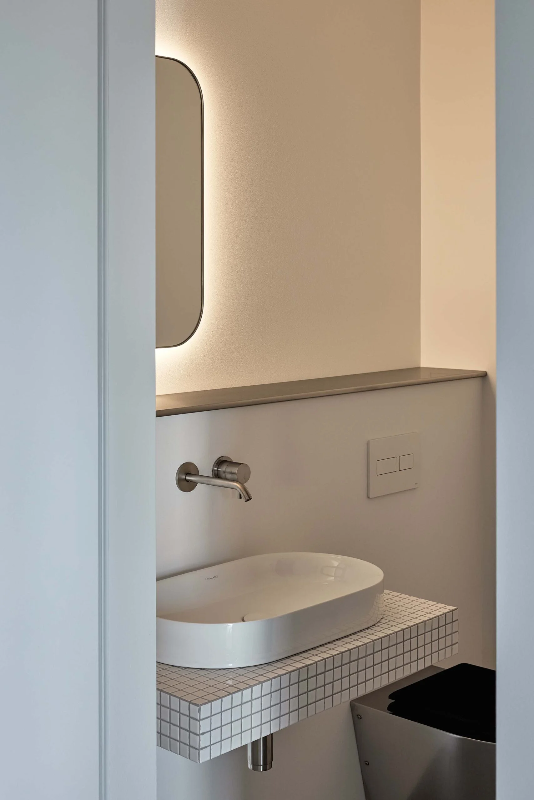 Miegamasis ir vonios kambarys kontrastuoja su pilkomis bendrosiomis zonomis, čia vyrauja balta spalva su keliais spalvų akcentais. Vonios dušo zonoje naudojamos „FormaFantasma“ dizaino studijos sukurtos plytelės, padengtos vulkaninio pelenų glazūra, kurios išryškina meninę išraišką tiek vizualiniu, tiek pojūčių aspektu.