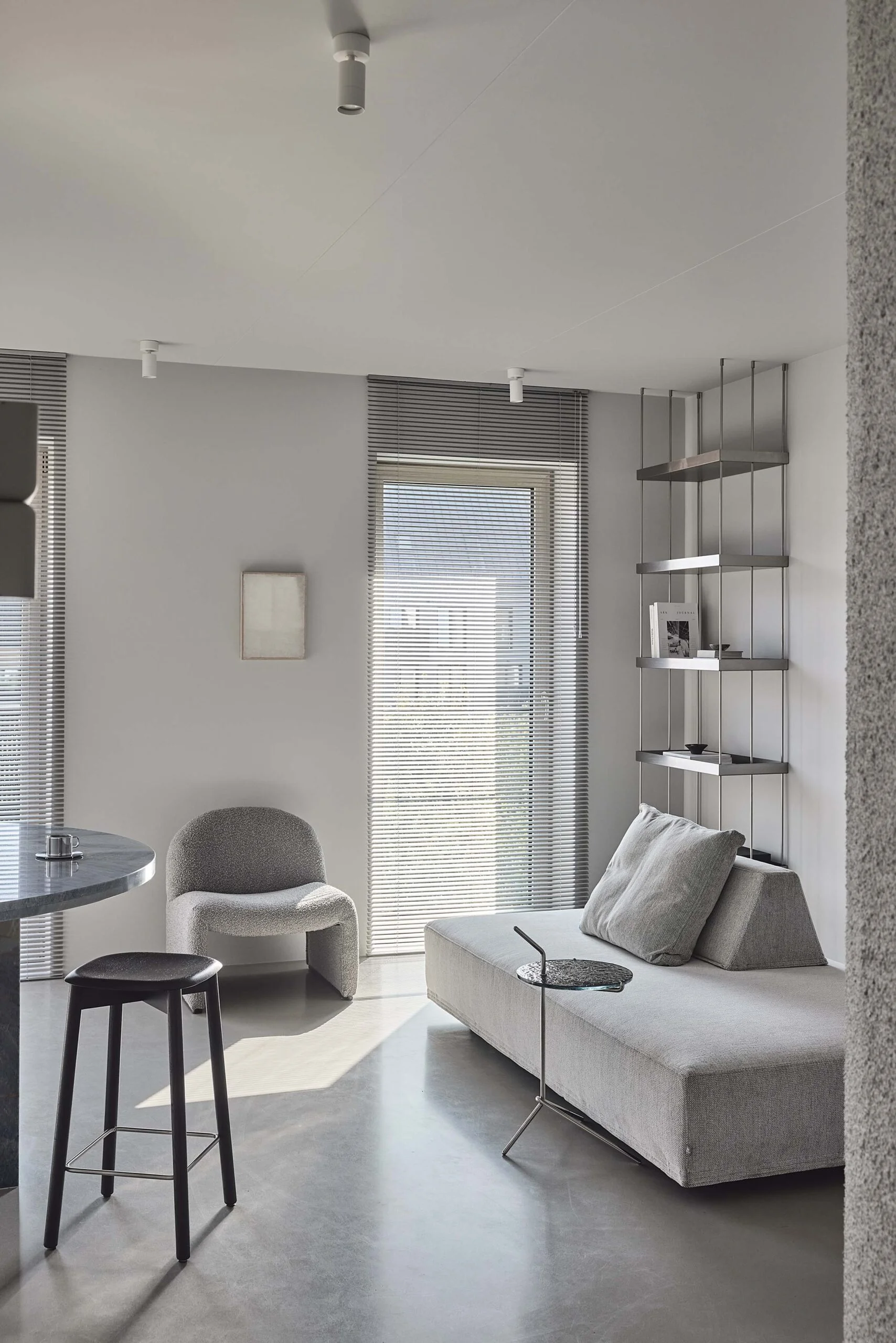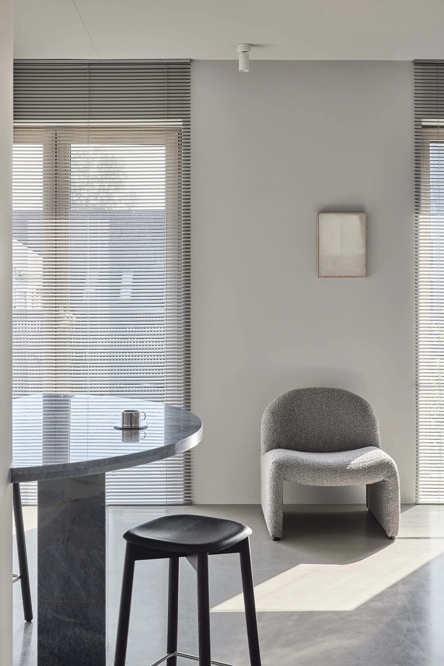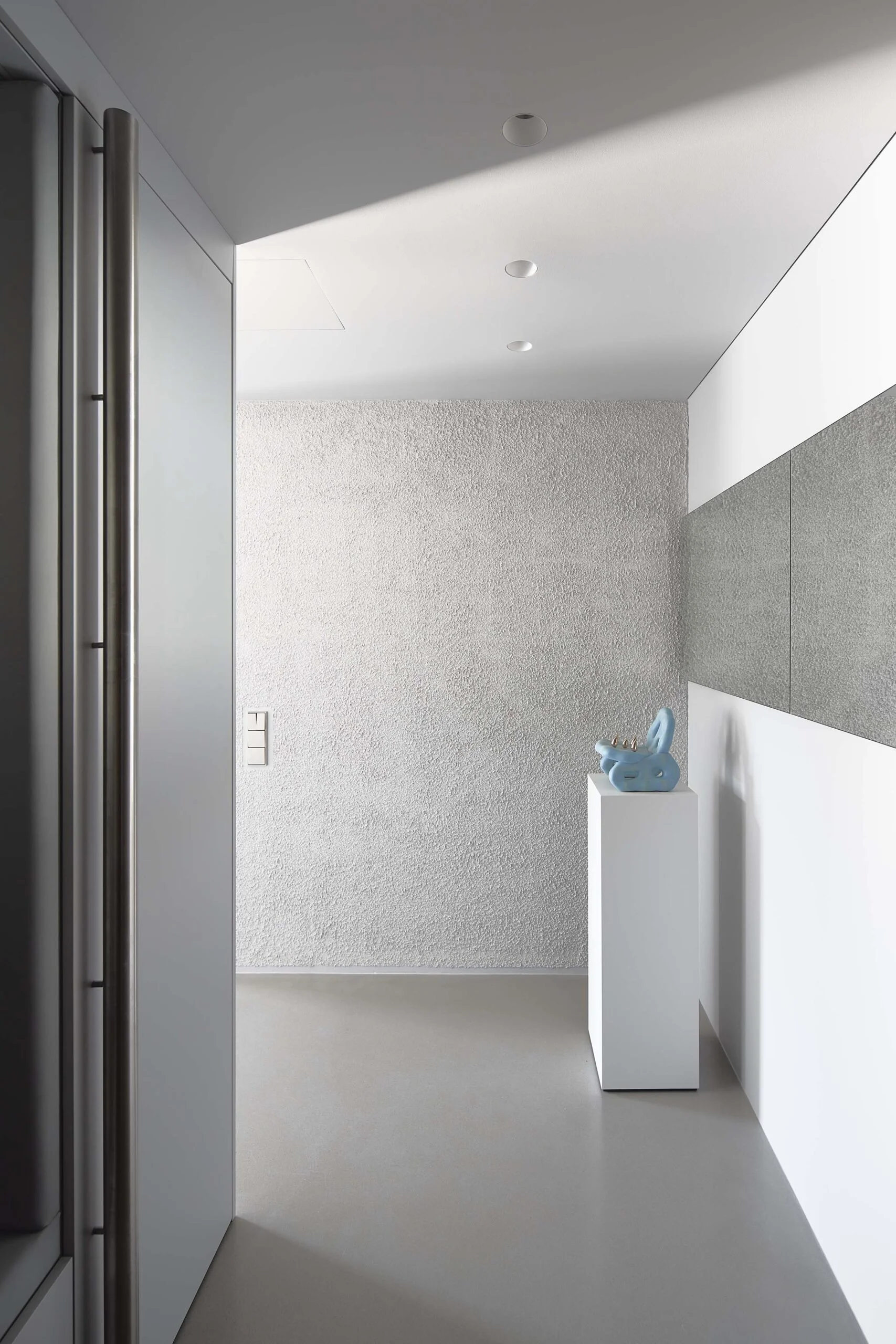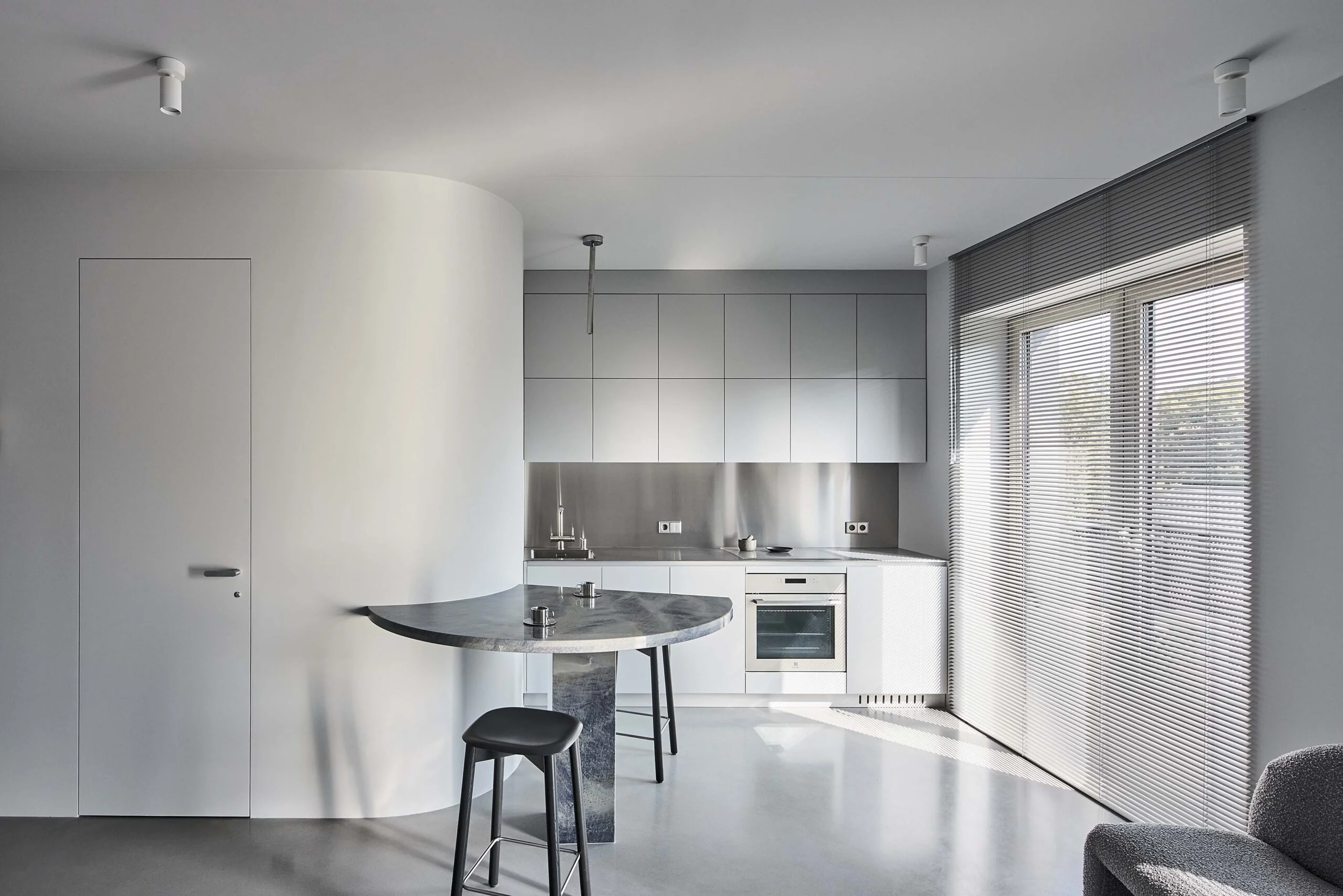Interjeras sukurtas galerijos principu, suteikiant erdvėms minimalistinį, tačiau rafinuotą charakterį. Pagrindinėse erdvėse – tambūre, virtuvėje ir svetainėje – dominuoja šviesiai pilki tonai, kurie subtiliai derinami su įvairiomis sienų ir grindų faktūromis. Akcentais tampa pusapvalis melsvo natūralaus akmens pusbaris, menininkų darbai, kurie ateityje dar praturtins šią erdvę.