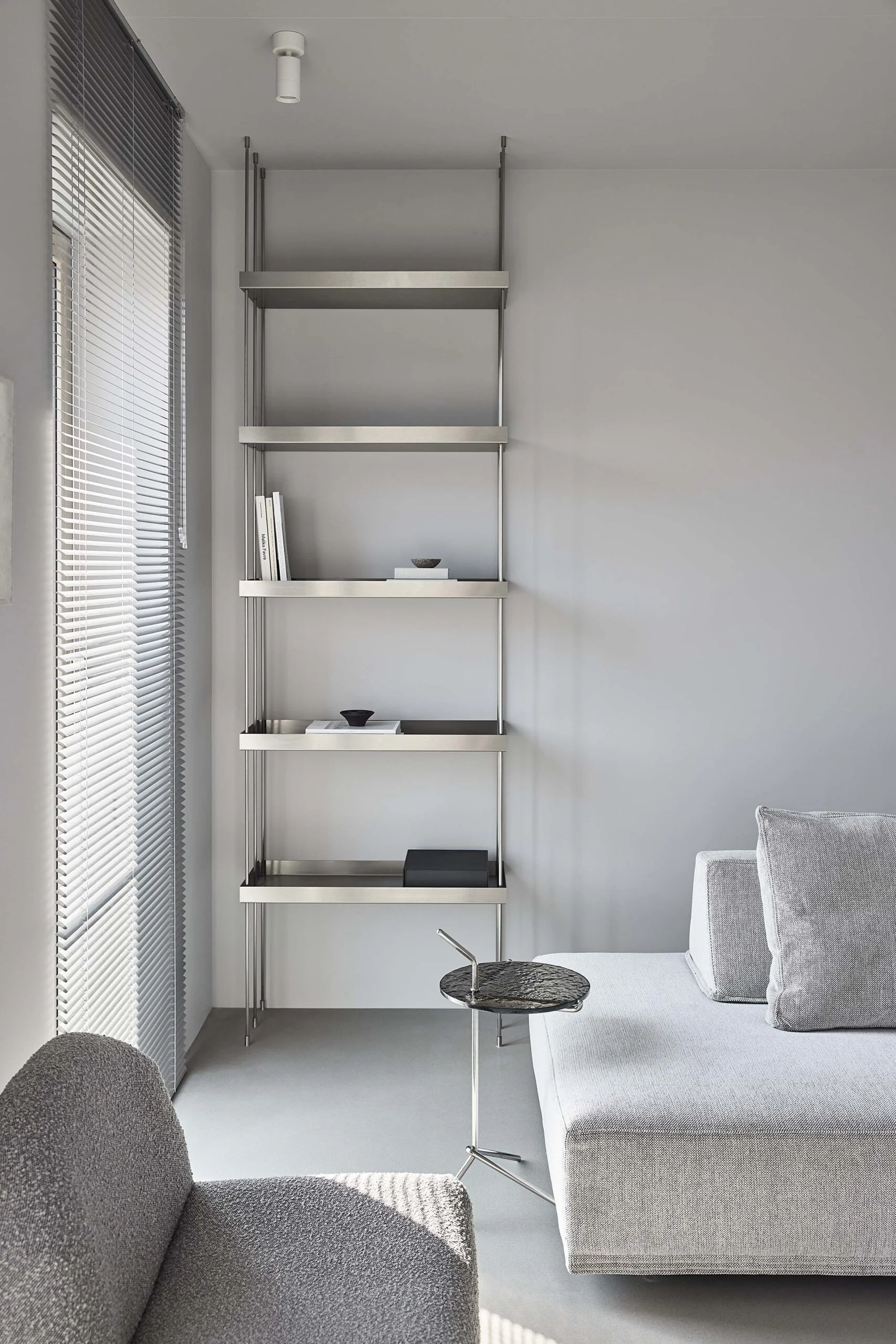 Visas „I.T. butas“ apjungiamas nerūdijančio plieno detalėmis, kurios atsikartoja baldų elementuose, lentynose ir aksesuaruose, įnešdamos šiuolaikiškumo ir vizualinio vientisumo.