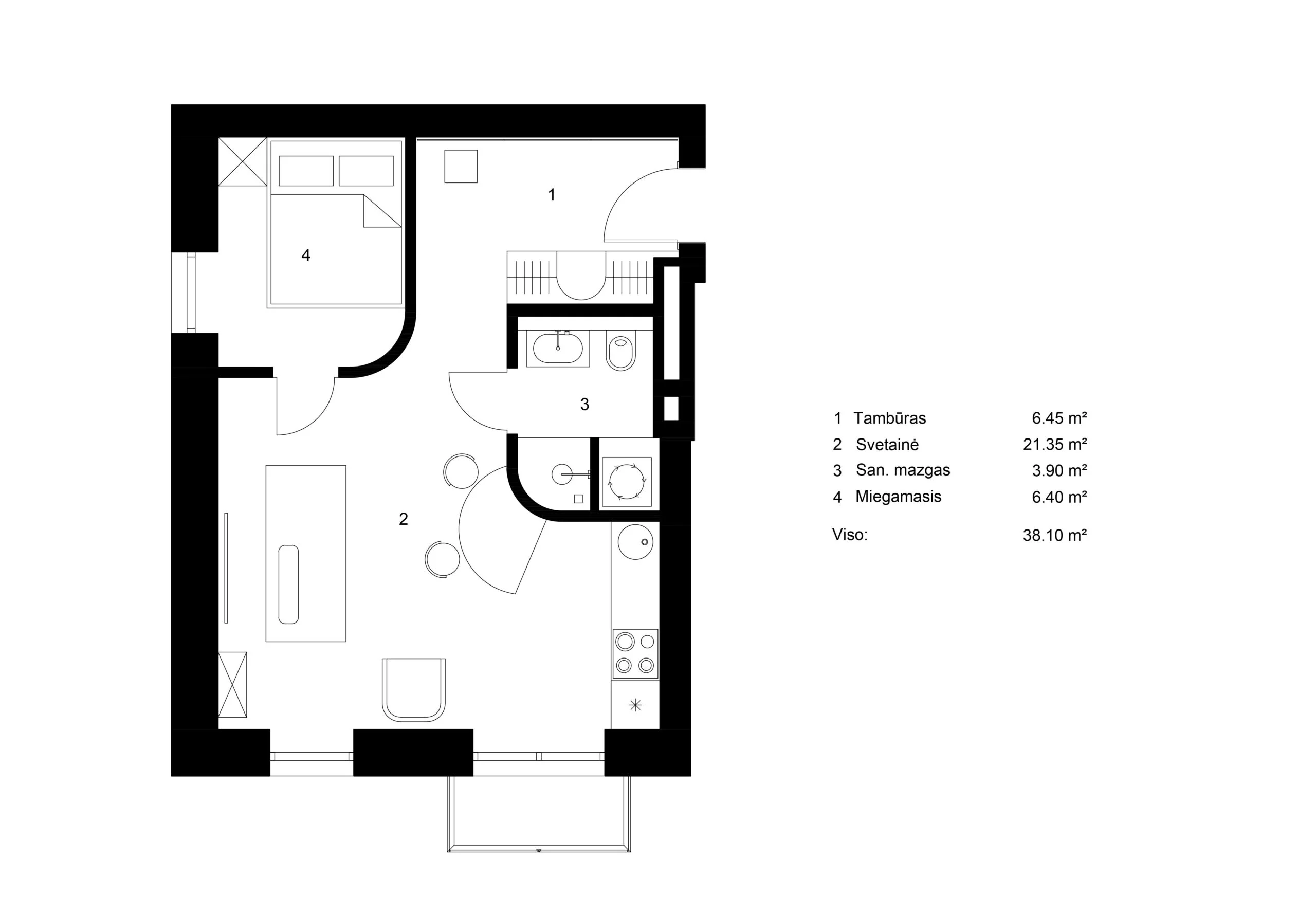 Nedidelis, tačiau jaukus miegamasis pasižymi šviesiomis spalvomis ir funkcionaliu dizainu – lova ir spinta sukurti kaip vientisas baldas, užtikrinantis praktiškumą ir estetinį švarumą. Lovos galvūgalis atkartoja vonios kambario plytelių spalvą, sukuriant subtilų ryšį tarp erdvių.