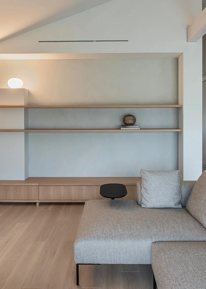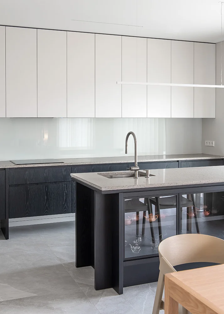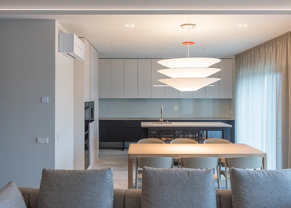 Skandinaviškos įtakos atsiskleidžia švariomis linijomis, atviromis erdvėmis ir organizuotu išdėstymu. Kiekvienas baldų kūrinys parinktas ne tik dėl grožio, bet ir funkcionalumo, kad namai išliktų tvarkingi ir efektyvūs. Apgalvoti saugojimo sprendimai padeda išlaikyti erdvę tvarkingą ir praktišką, leidžiant dizainui sutelkti dėmesį į paprastumą ir harmoniją.