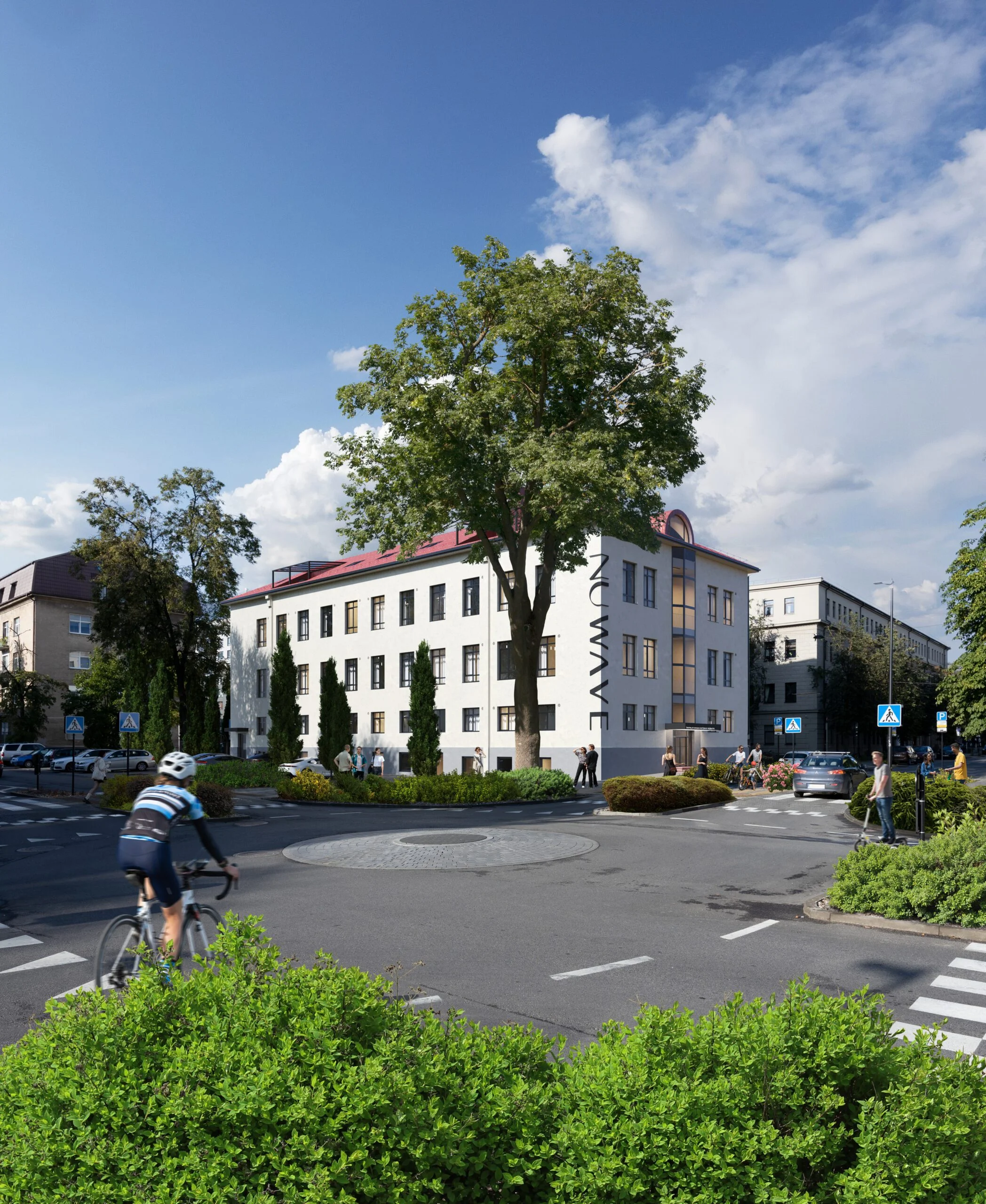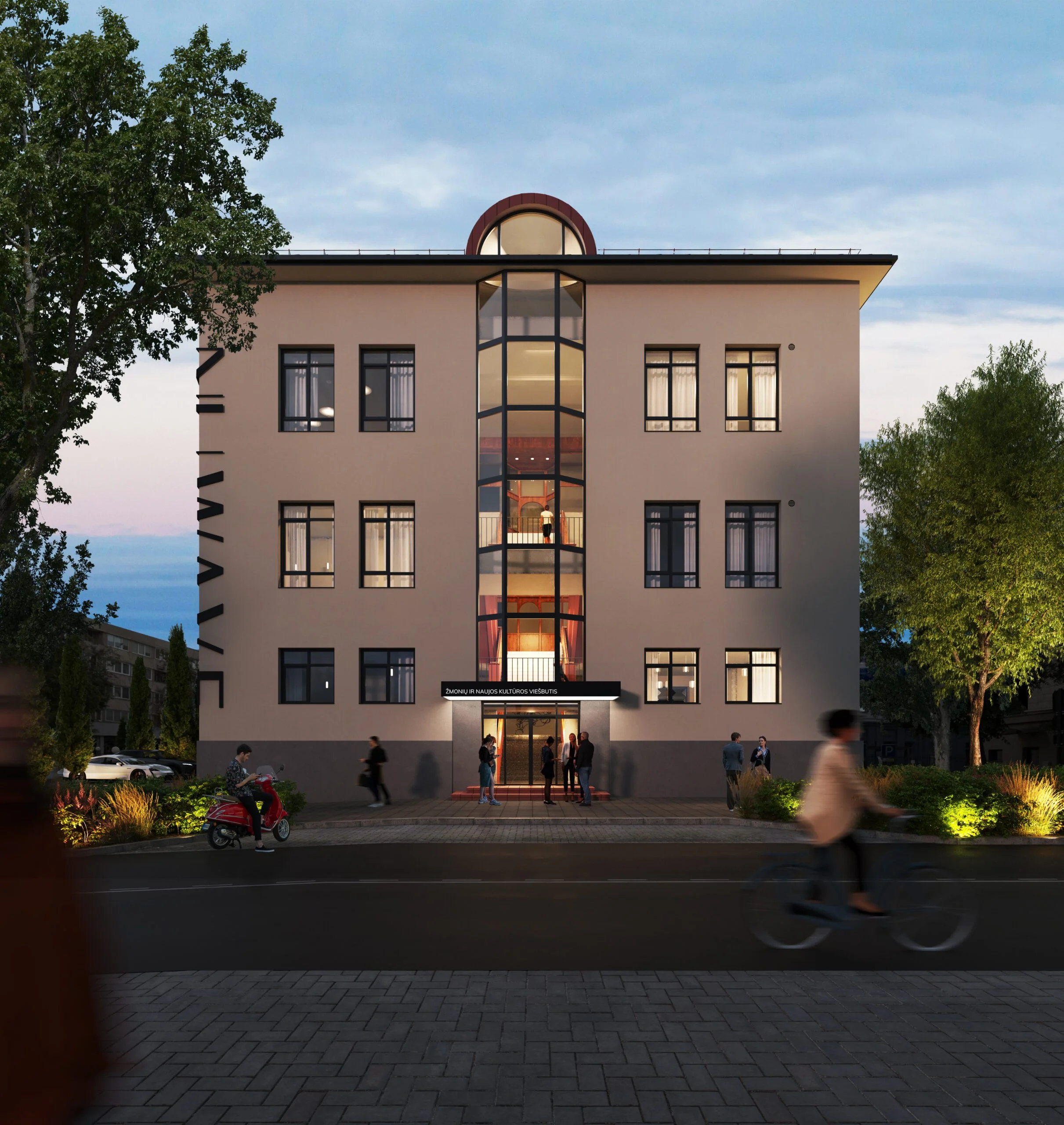 Vienas iš pastato akcentų – paženklintas fasadas kartu su kuriama įėjimo zona, kuri tinkamai pozicionuotų pastatą ir išlaikytų jo naują „žaidimą“ – būti žmonių ir naujos miesto kultūros „viešbučiu“. Toks užrašas ir buvo paliktas ant įėjimo stogelio – „Žmonių ir naujos kultūros viešbutis“. Visgi, suteikus pastatui naują drabužį ir koncepciją, jis nebėra tik viešbutis. Parduodamos patalpos sukurtos taip, kad tai taptų nauja erdve norintiems gyventi ar kitiems išnuomoti būstą išskirtiniame pastate, o taip pat ieškantiems, kur įkurti savo kūrybinę veiklą ar mažą verslą.