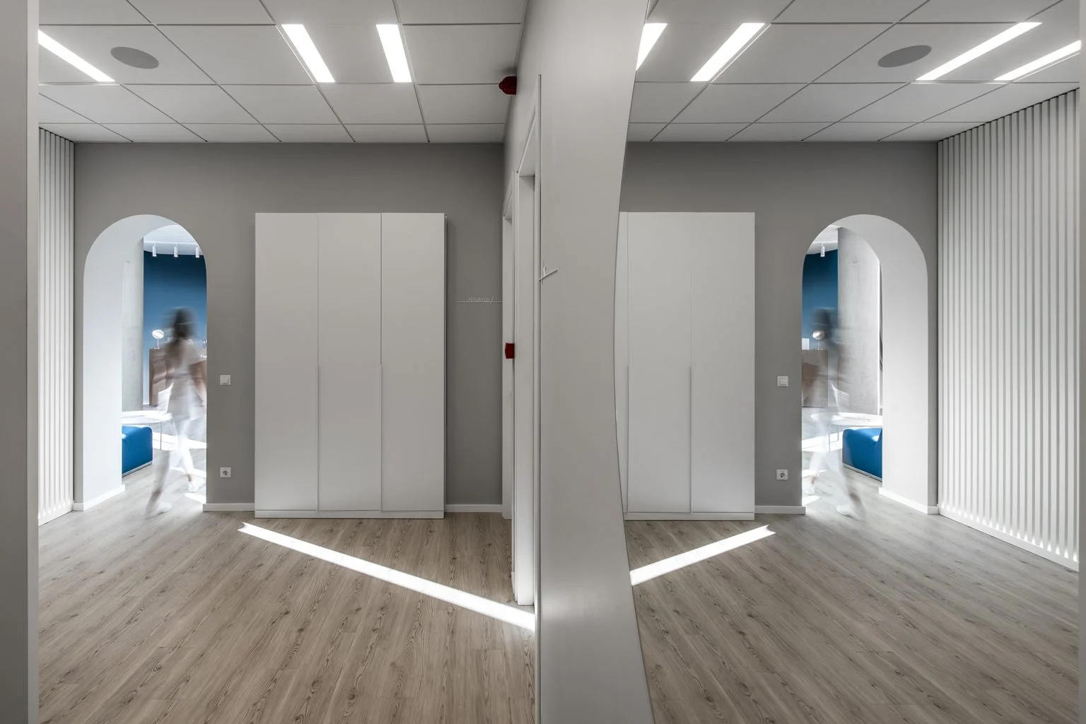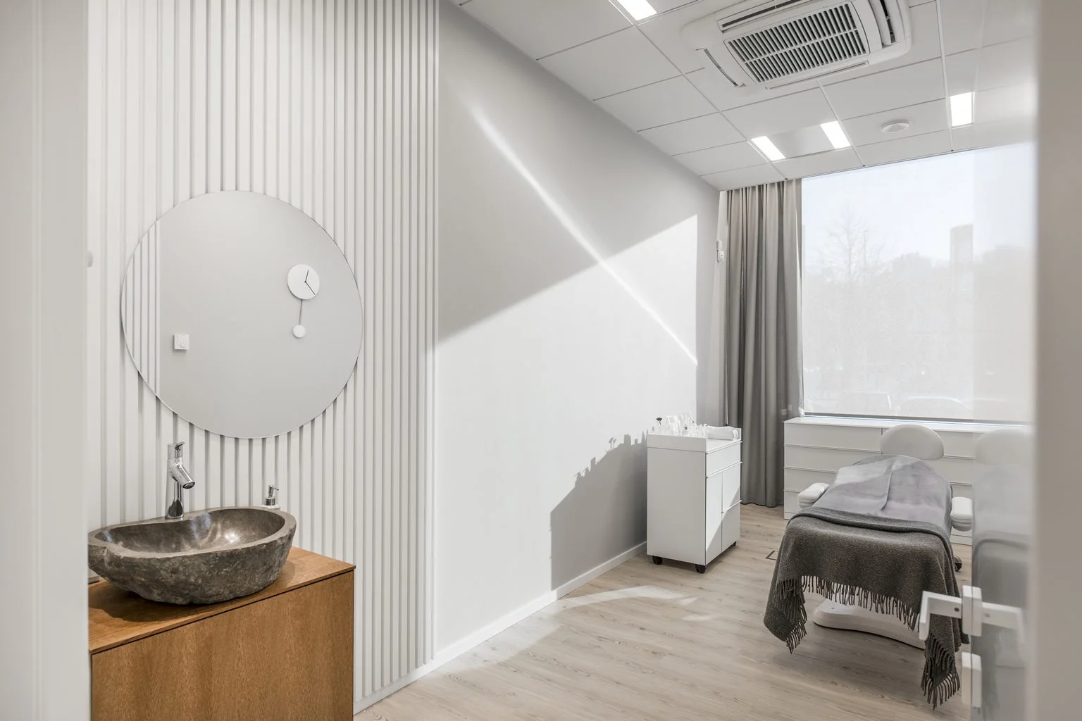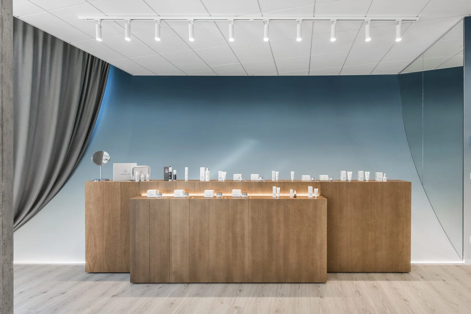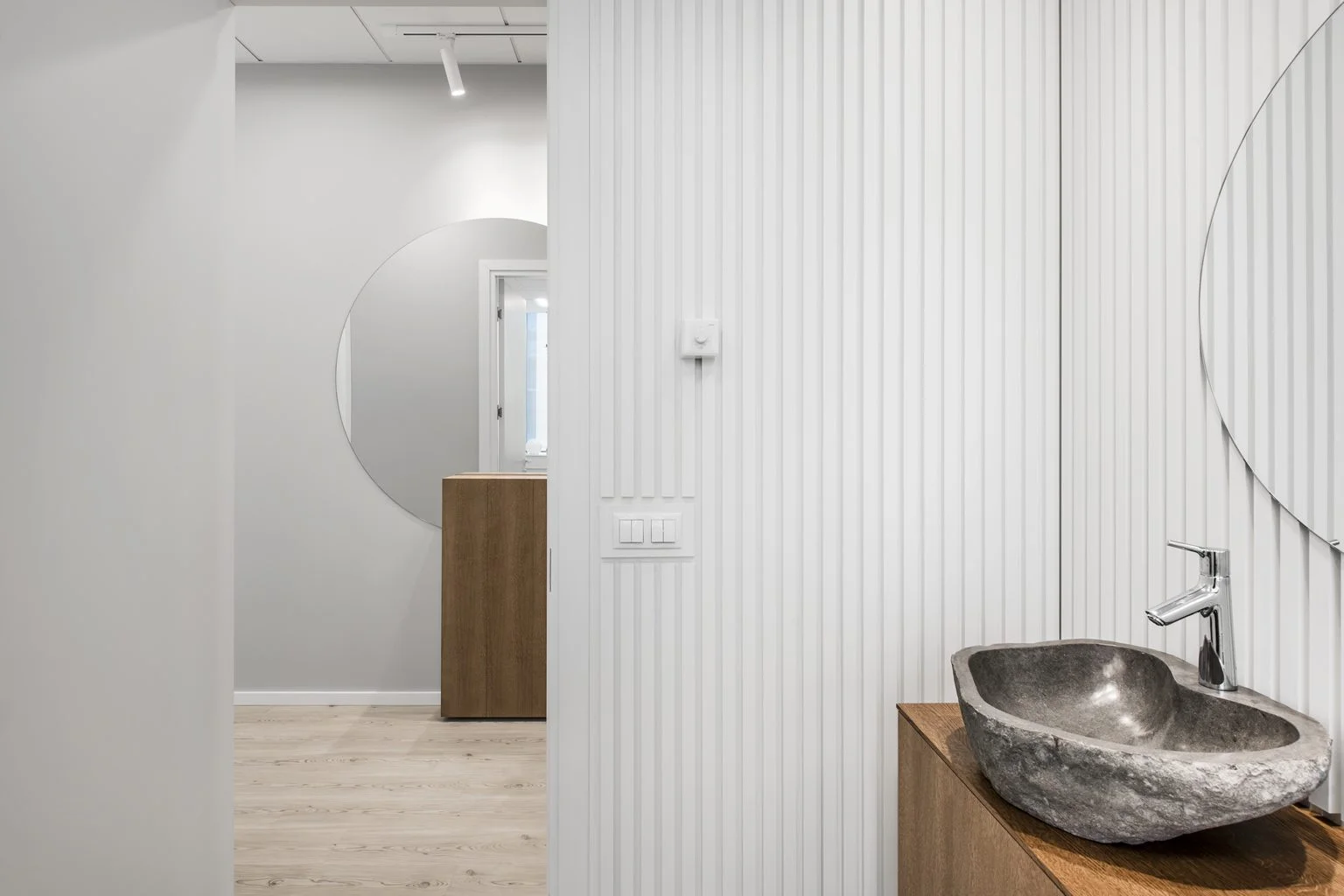 Visose klinikos patalpose naudojamos atsikartojančios švarios geometrinės formos linija ir apskritimas. Apskritimas laikomas tobula forma, įkūnija vientisumą ir harmoniją, o vertikali linija – energijos, kūrybos, intelektualumo simbolis. Tai ir ekspozicijos baldai „stulpeliai”, vertikalių sienų panelių ritmika bei apvalūs veidrodžiai, šviestuvai, įėjimo arka, recepcijos baldas. Net pastato architektūra pasitarnauja bendrajai koncepcijai, kai lenkto fasado vidinė dalis tampa recepcijos akcentu – ombre metodu mėlynai dažyta sieną lyg banga pakyla iš šviesos juostos grindyse. Interjero erdvėje pavyko pasiekti ypatingą harmonijos ir ramybės atmosferą.