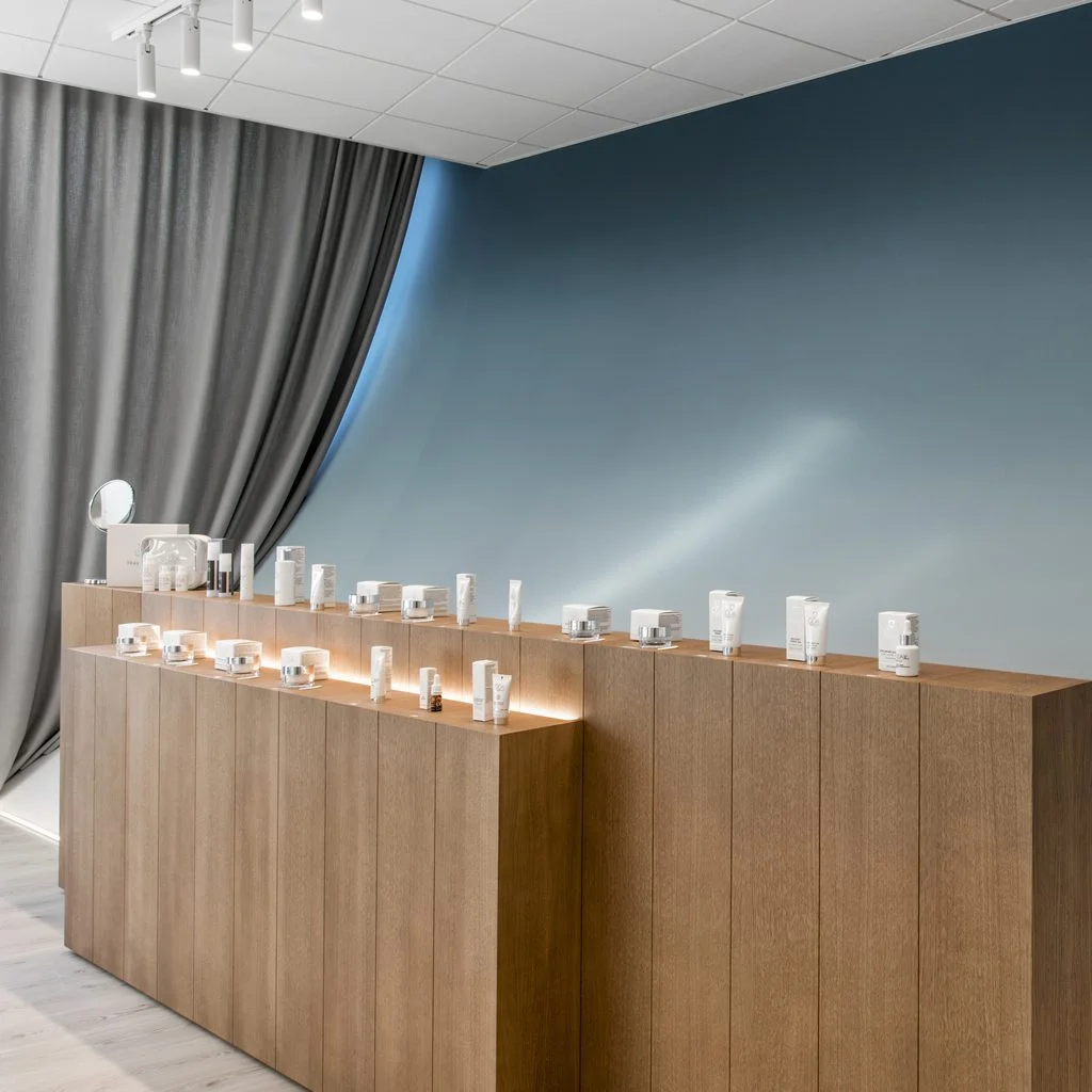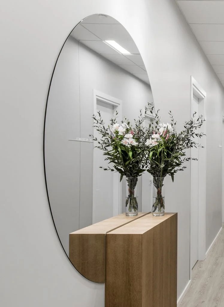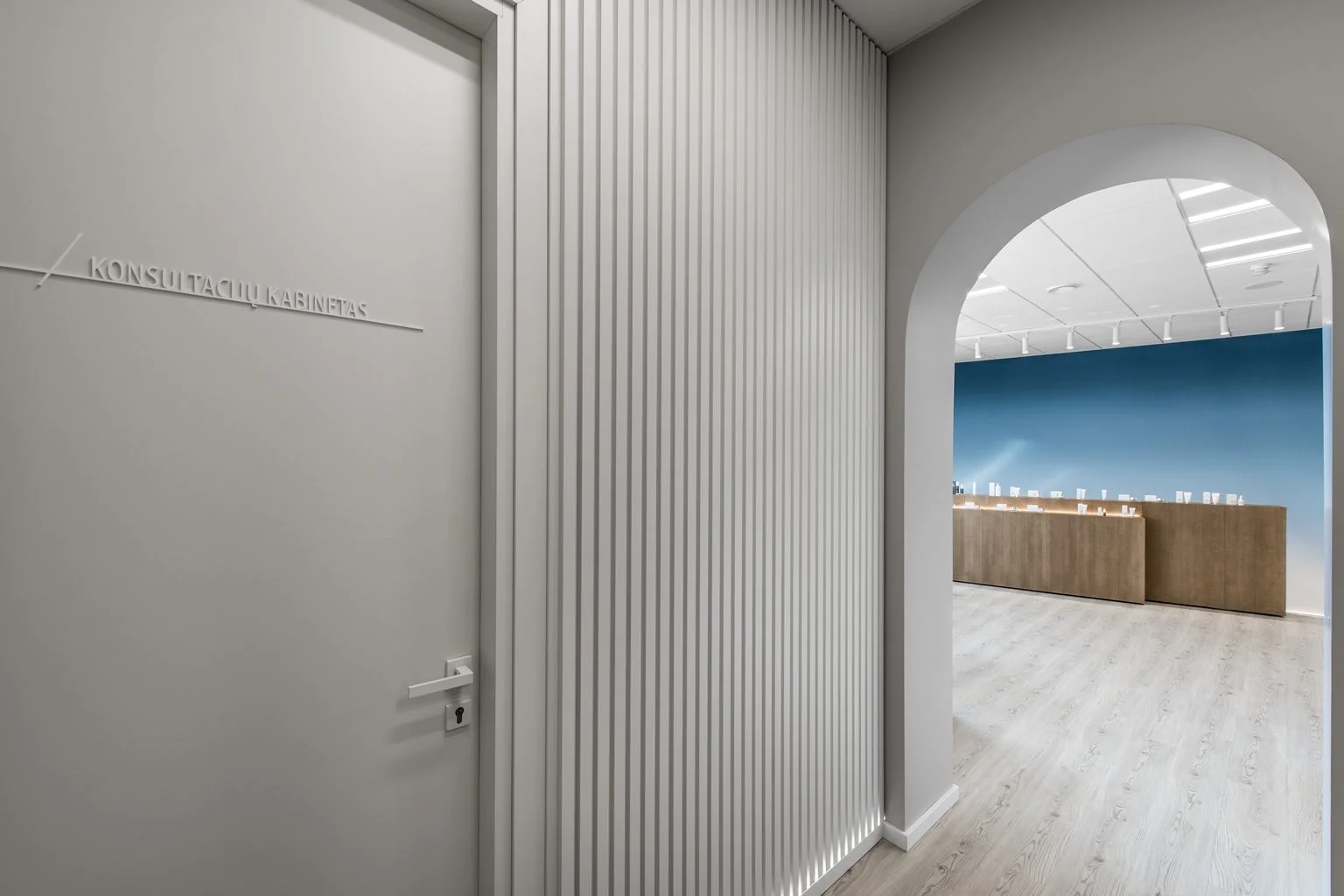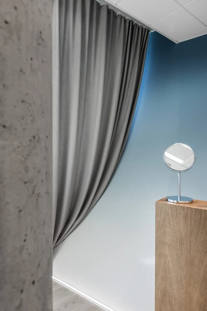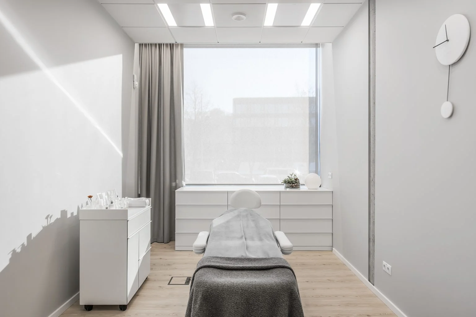 Visose klinikos patalpose naudojamos atsikartojančios švarios geometrinės formos linija ir apskritimas. Apskritimas laikomas tobula forma, įkūnija vientisumą ir harmoniją, o vertikali linija – energijos, kūrybos, intelektualumo simbolis. Tai ir ekspozicijos baldai „stulpeliai”, vertikalių sienų panelių ritmika bei apvalūs veidrodžiai, šviestuvai, įėjimo arka, recepcijos baldas. Net pastato architektūra pasitarnauja bendrajai koncepcijai, kai lenkto fasado vidinė dalis tampa recepcijos akcentu – ombre metodu mėlynai dažyta sieną lyg banga pakyla iš šviesos juostos grindyse. Interjero erdvėje pavyko pasiekti ypatingą harmonijos ir ramybės atmosferą.
