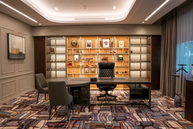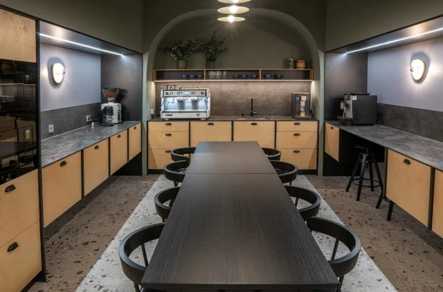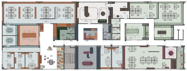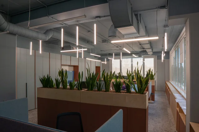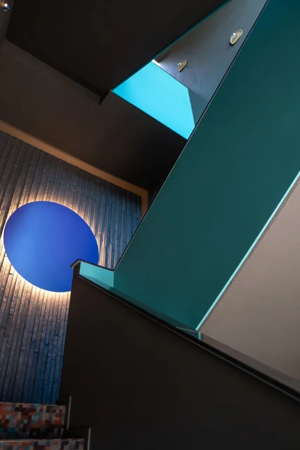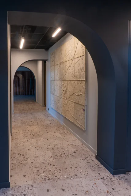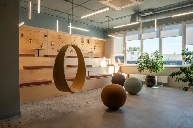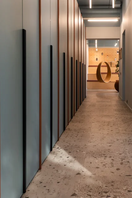 Pagrindine interjero ašimi tapo koridorius su jį rėminančiomis arkomis – tarsi „miesto vartais“, kurie veda per svarbiausias biuro zonas: nuo recepcijos ir žaidimų erdvės iki valgyklos bei konferencijų salių. Kiekviena zona turi savo unikalų dviejų spalvų kodą, kuris sukuria skirtingas nuotaikas. Šis spalvinis zonų išskyrimas padeda ne tik orientuotis erdvėje, bet ir sustiprina pojūtį, kad darbuotojai keliauja per skirtingus „miesto kvartalus“.