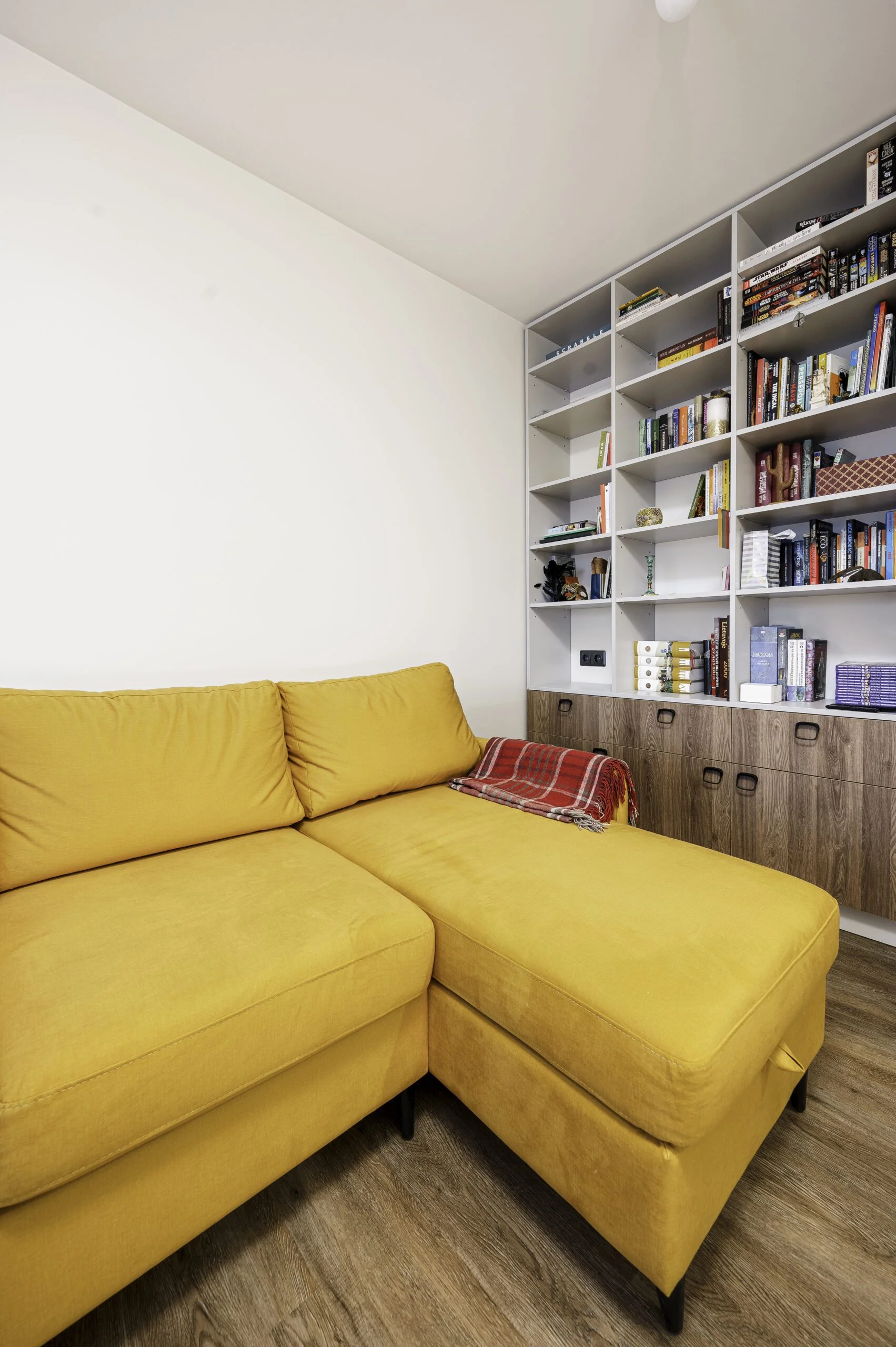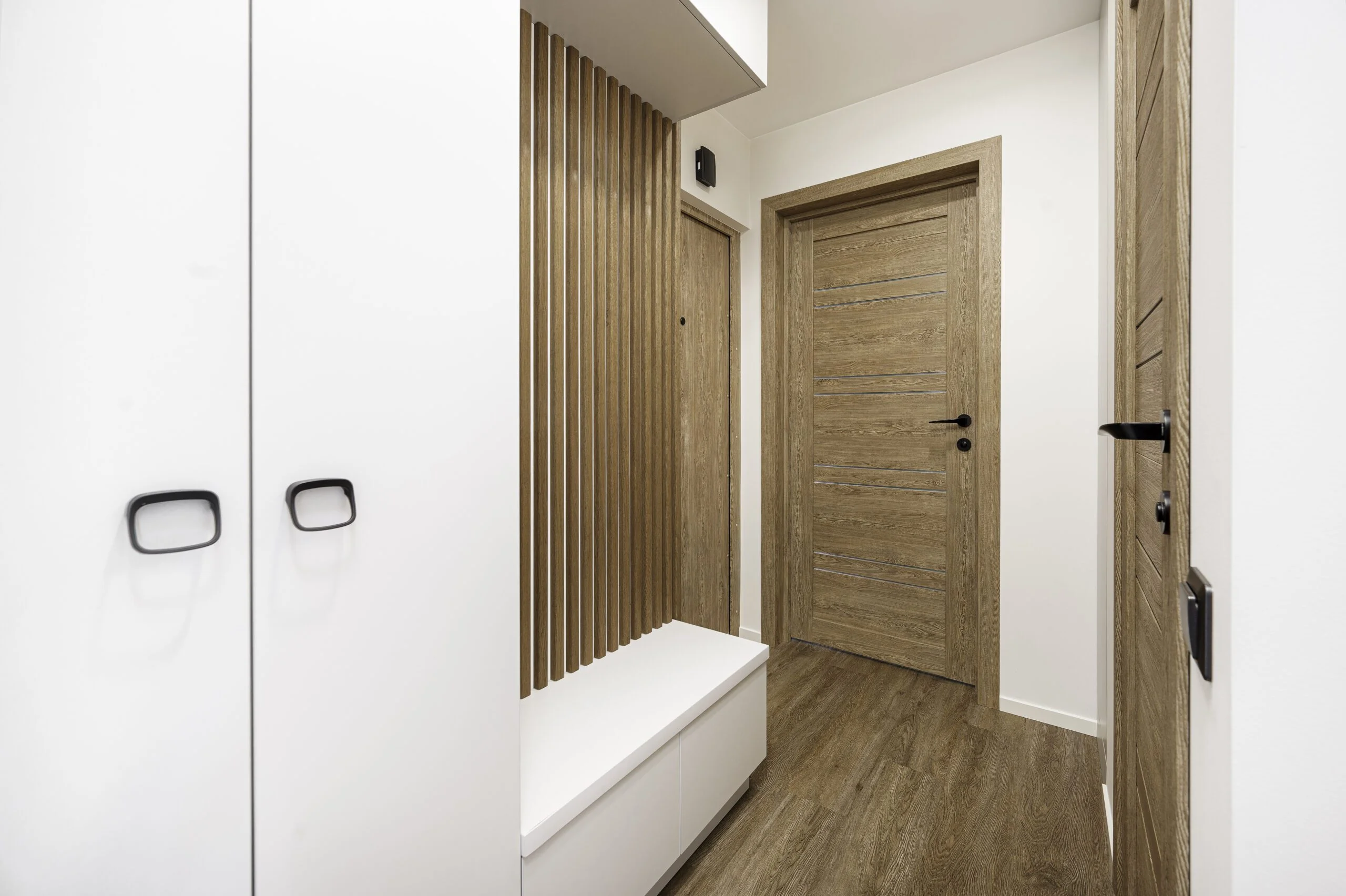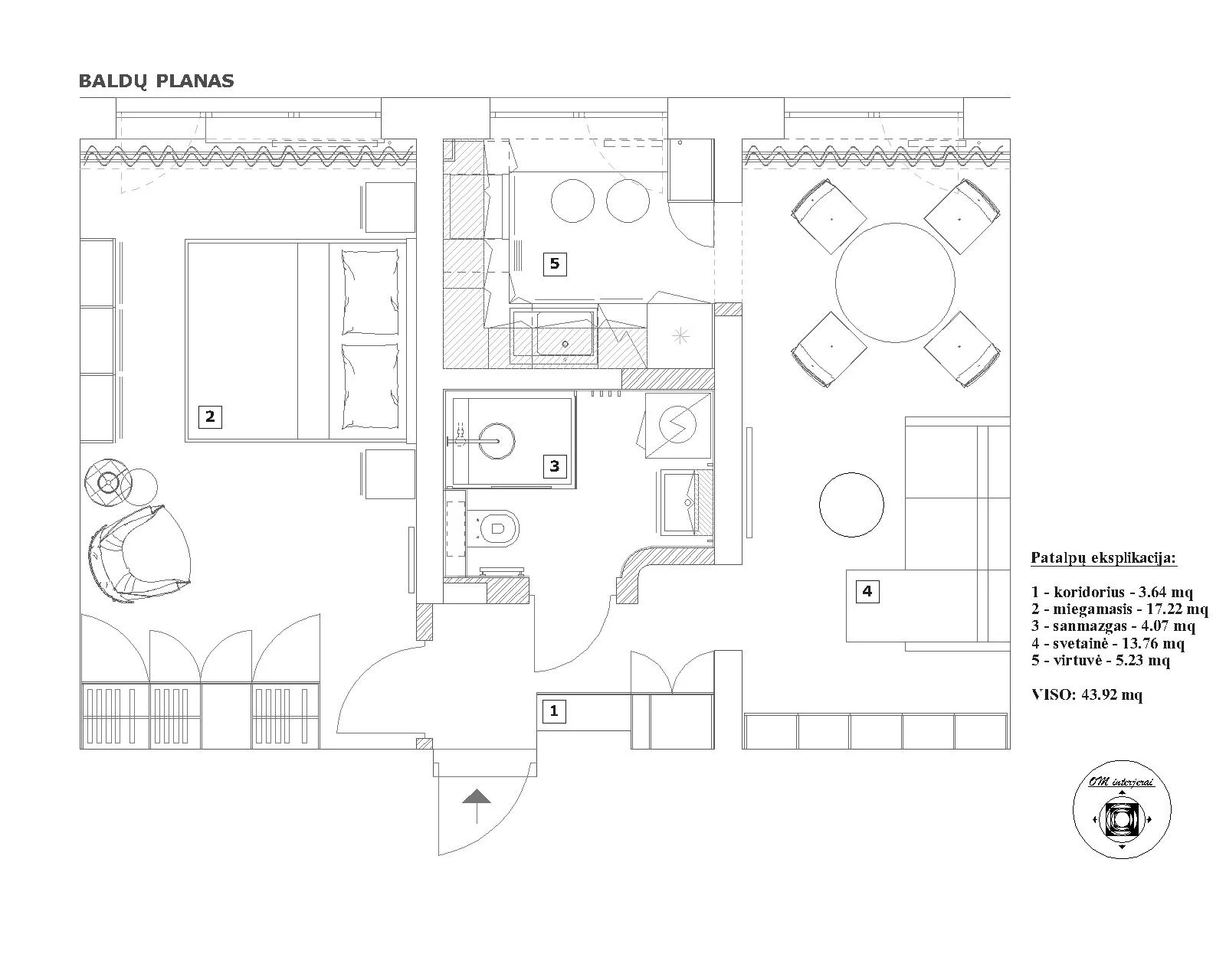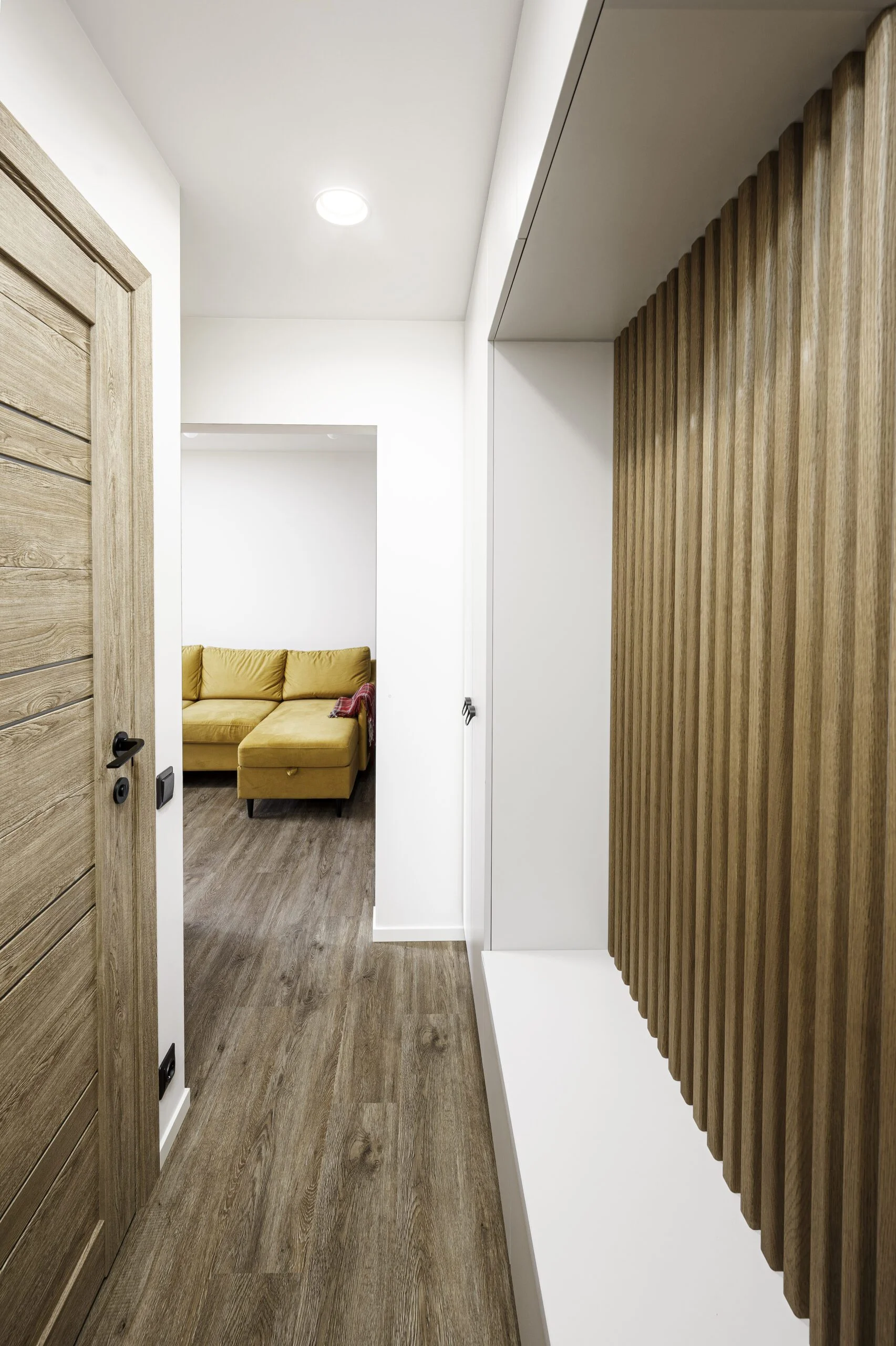 Saulėtas senos statybos 45 m2 butas „Saulė“. Pagrindinė užsakovų užduotis buvo padaryti šviesų, jaukų, šiltą butą bei pertvarkyti jo suplanavimą – padidinti san. mazgą bei virtuvę. Natūralumas interjere tapo vienas iš pagrindinių prioritetų, todėl bute „Saulė“ vyrauja šilto medžio, geltoni ir žali atspalviai. Grindų apdaila, ta pačia spalva atkartojamas duryse bei pereina į briuselių dekoratyvą ant sienų.