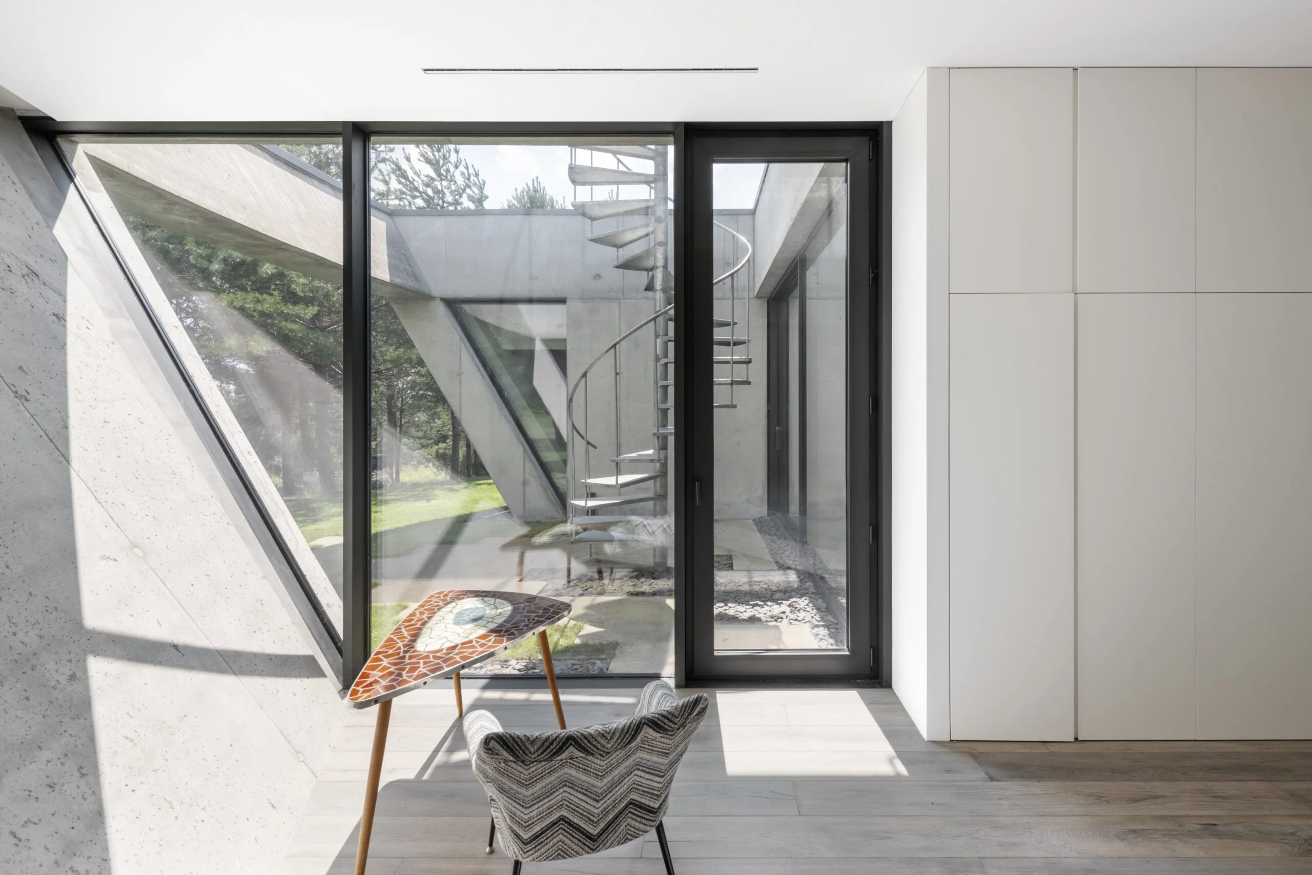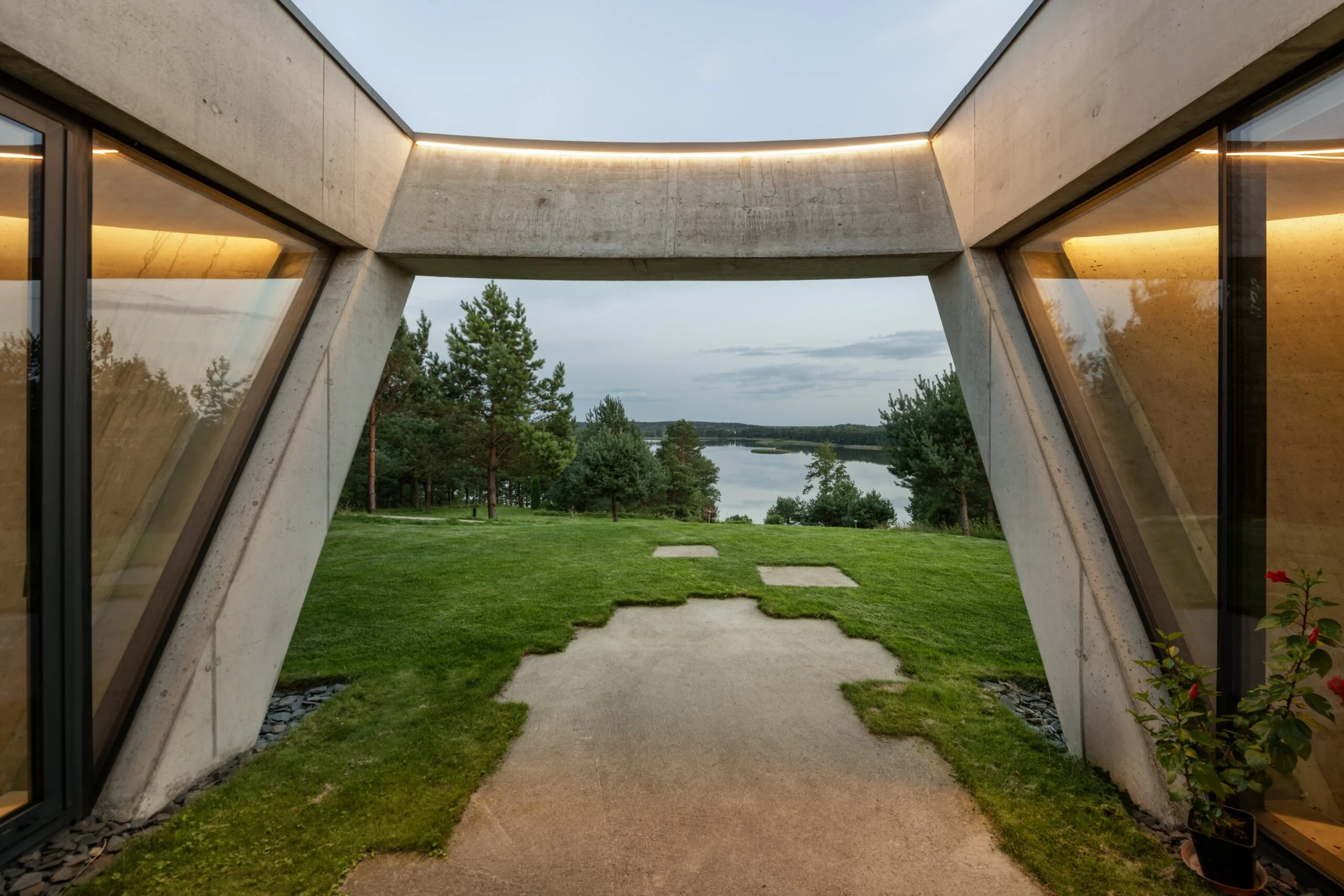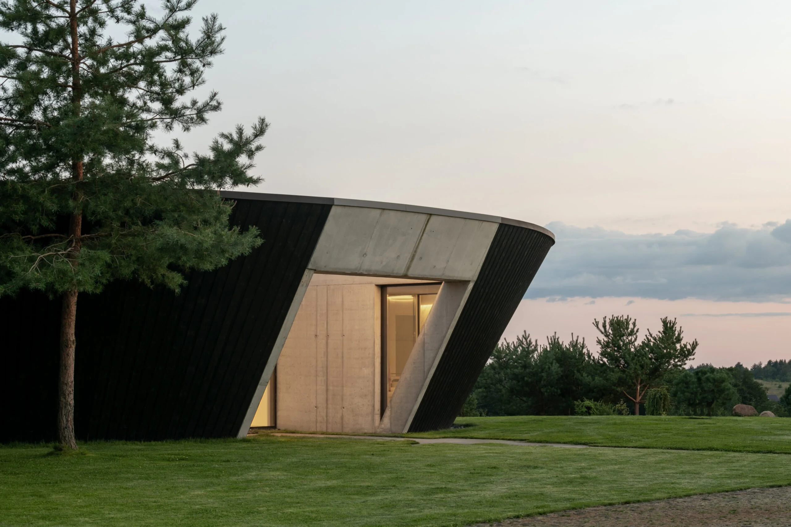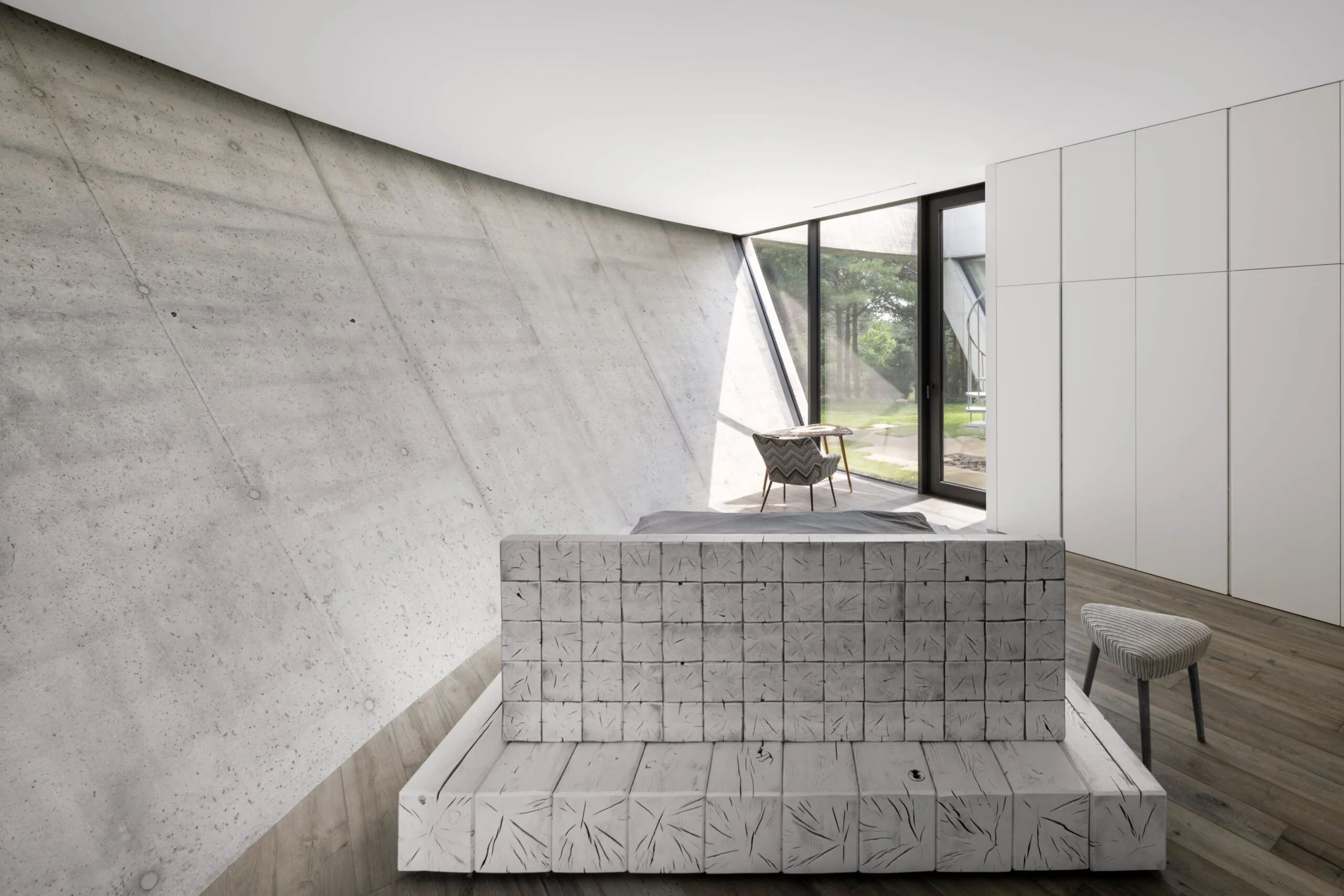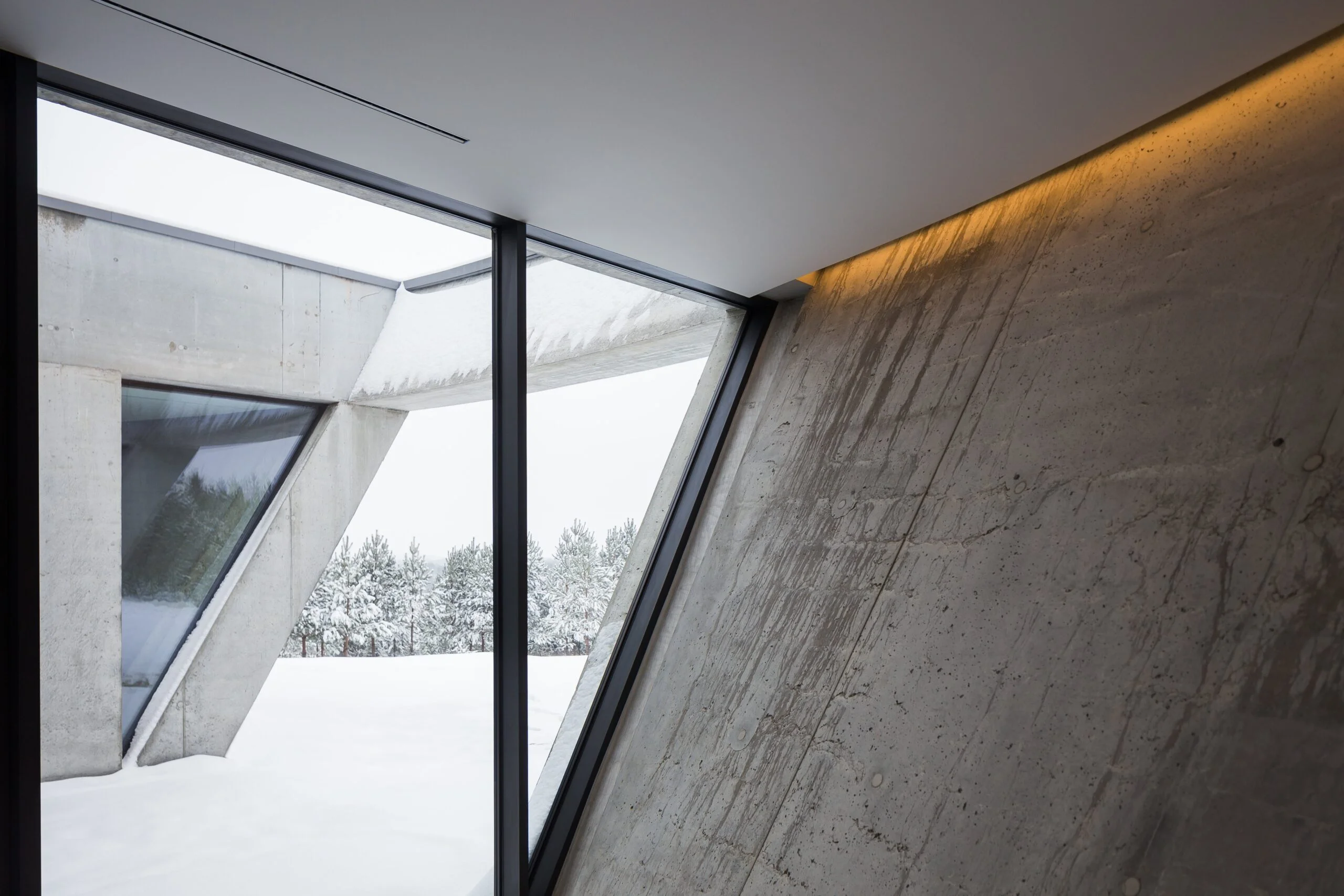 Subtiliai pasvirusi betoninė siena kambariuose suteikia architektūrinio žavesio bei erdvės pojūčio kambariuose. Tai yra labiau skulptūrinis pasirinkimas, kuris interjerui suteikia nestandartinį pojūtį, o eksterjerui įdomų siluetą. Tas termo medienos ir betono kompozicijos siluetas kontrastuoja su natūralia aplinka, dar labiau pabrėždamas pastato formos paprastumą ir organišką reakciją į neapibrėžtą aplinką.