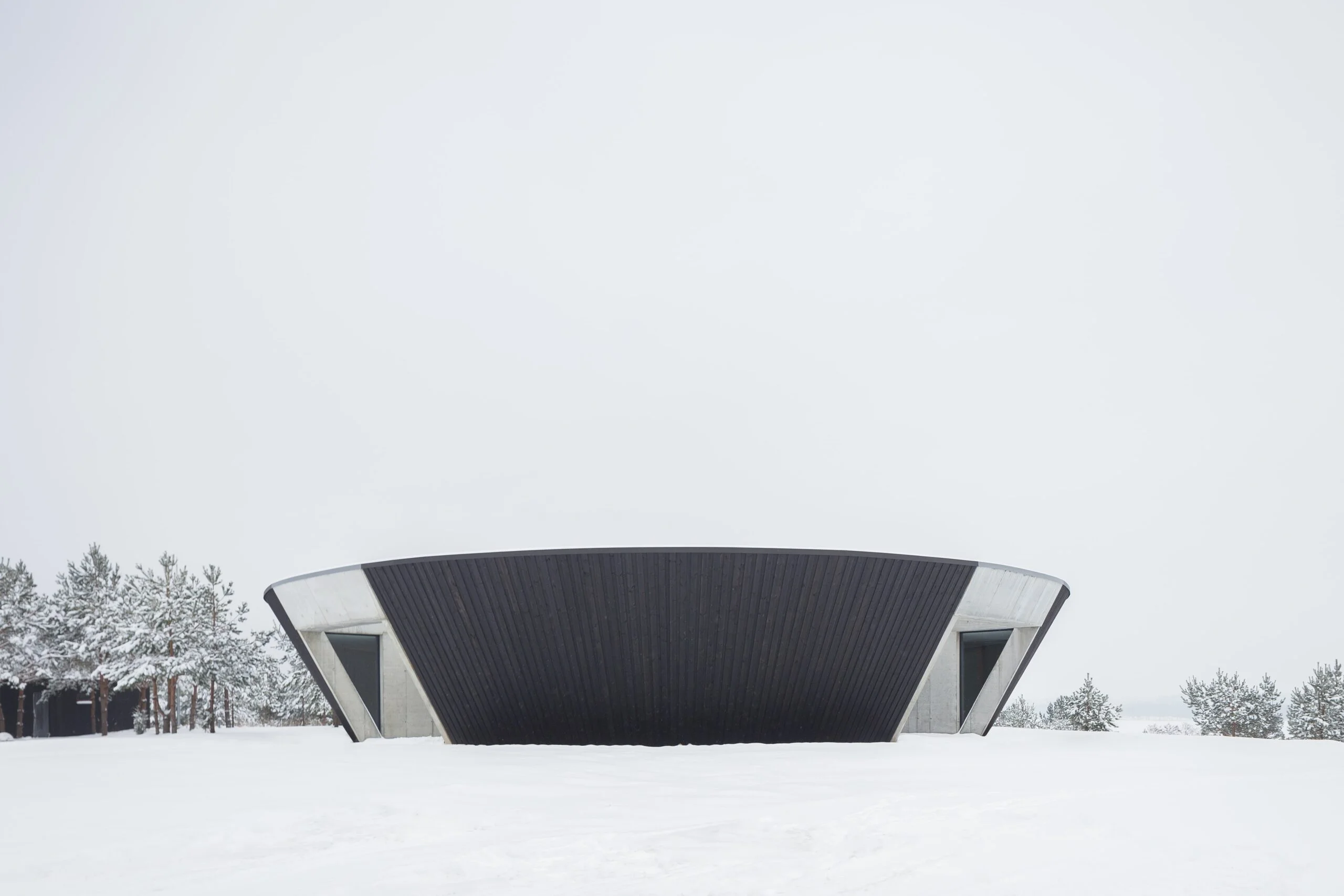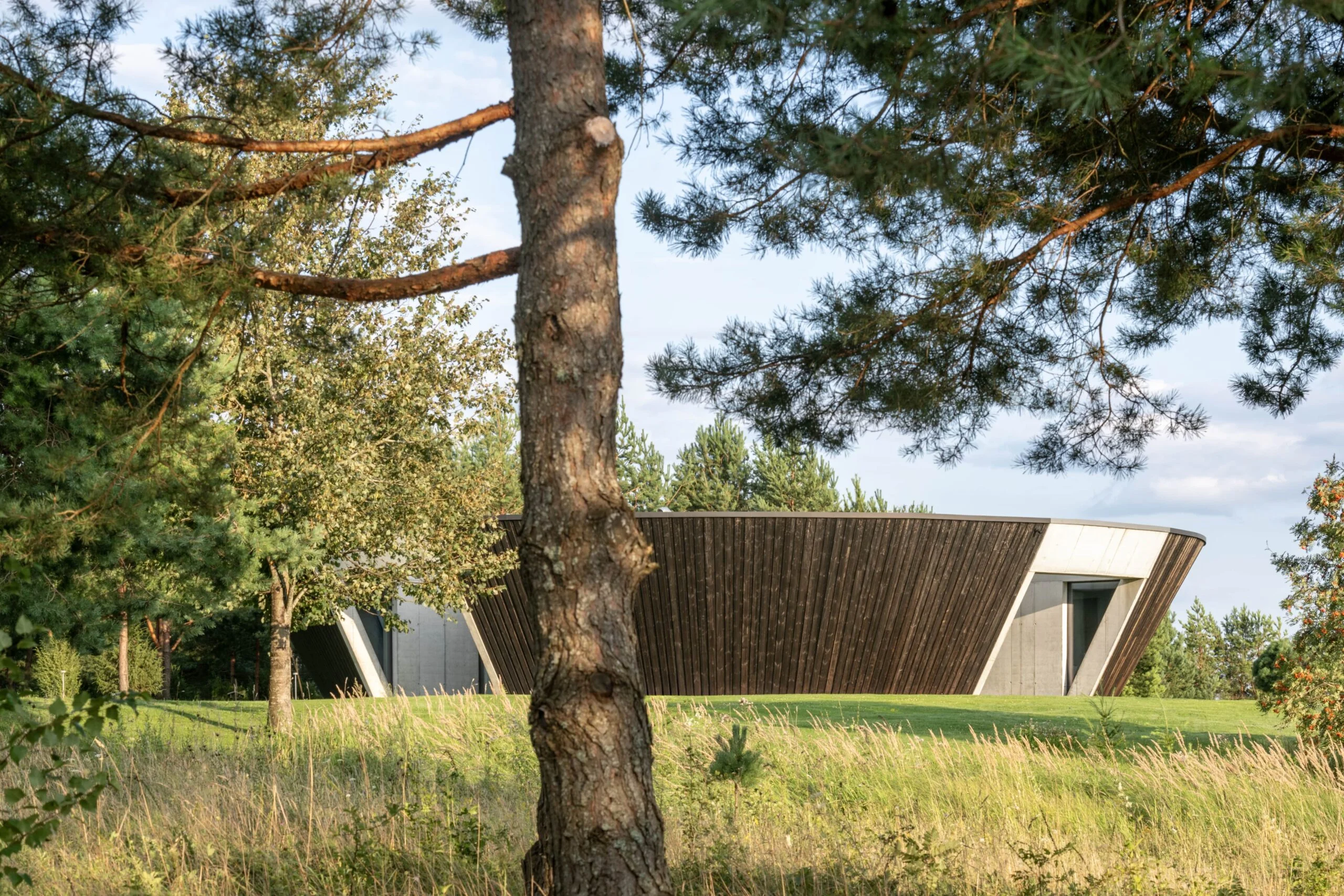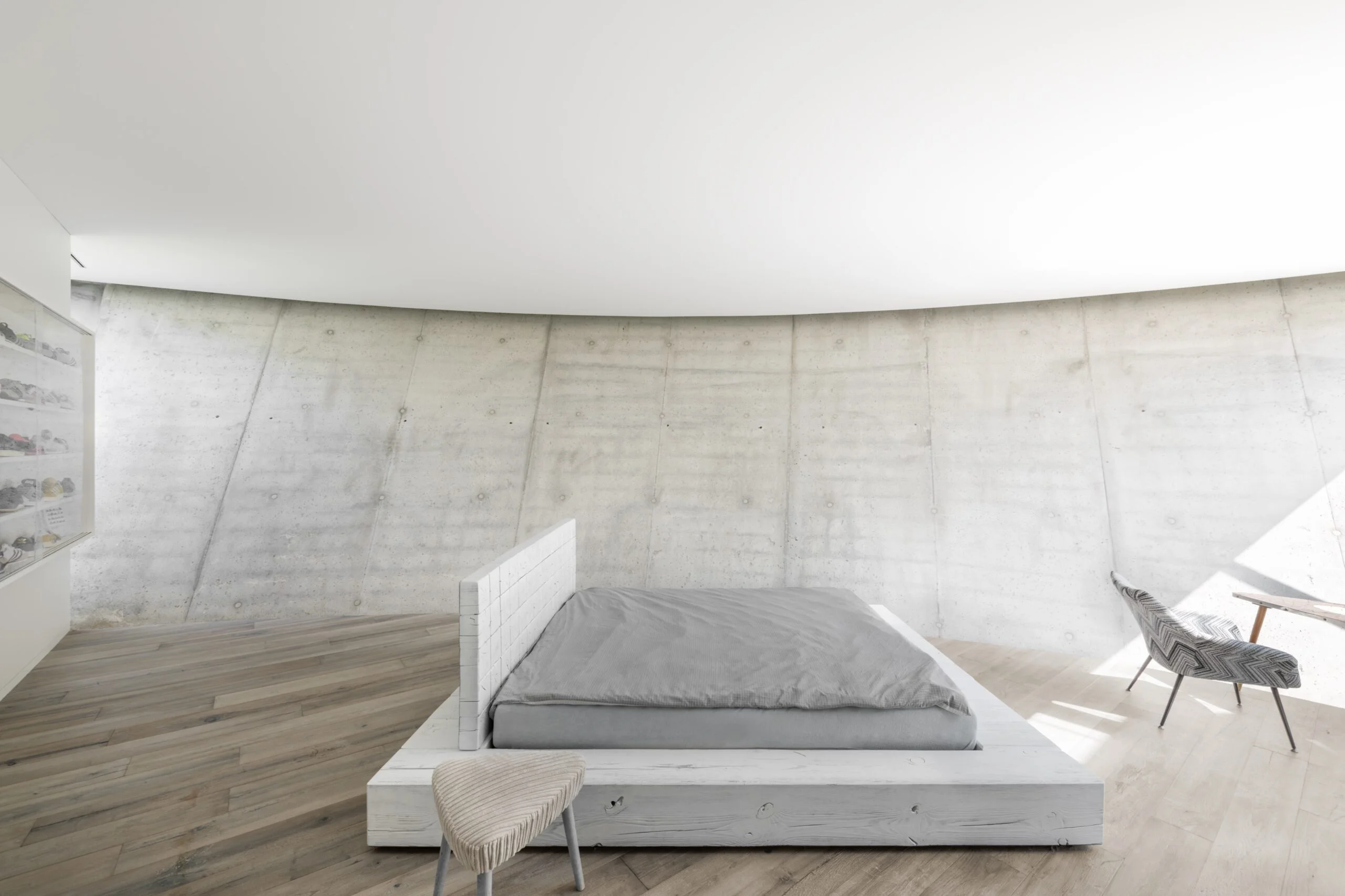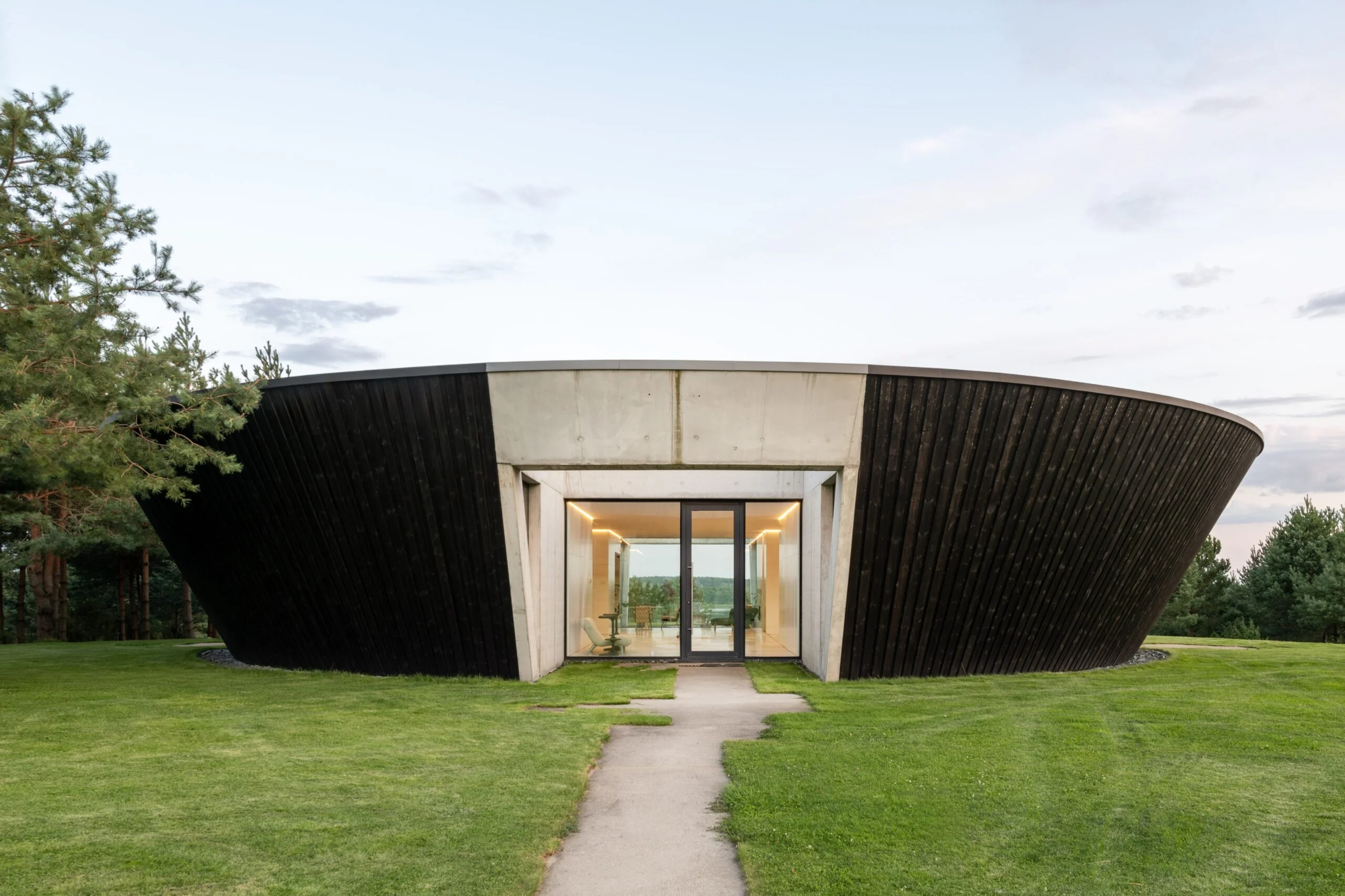 Subtiliai pasvirusi betoninė siena kambariuose suteikia architektūrinio žavesio bei erdvės pojūčio kambariuose. Tai yra labiau skulptūrinis pasirinkimas, kuris interjerui suteikia nestandartinį pojūtį, o eksterjerui įdomų siluetą. Tas termo medienos ir betono kompozicijos siluetas kontrastuoja su natūralia aplinka, dar labiau pabrėždamas pastato formos paprastumą ir organišką reakciją į neapibrėžtą aplinką.