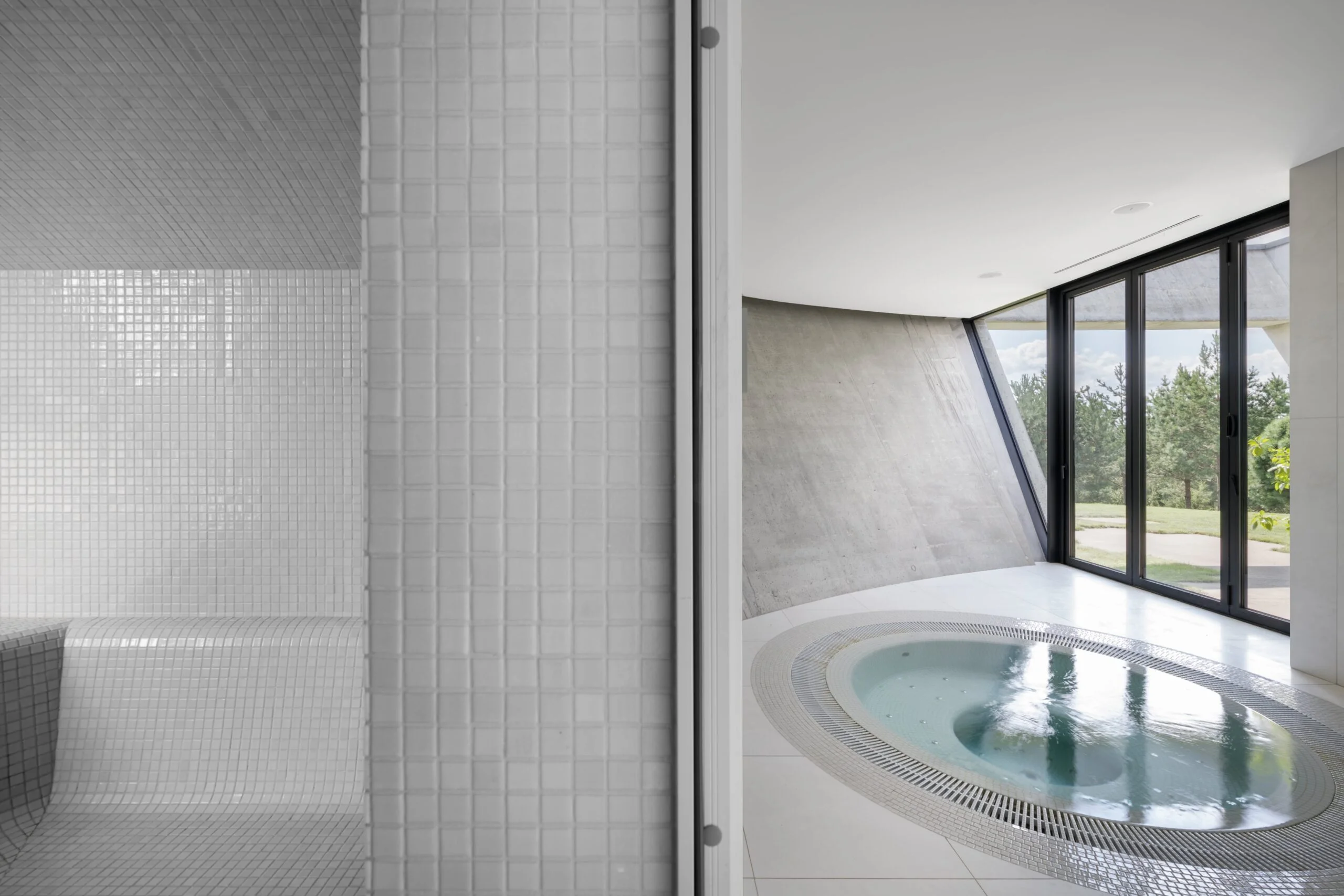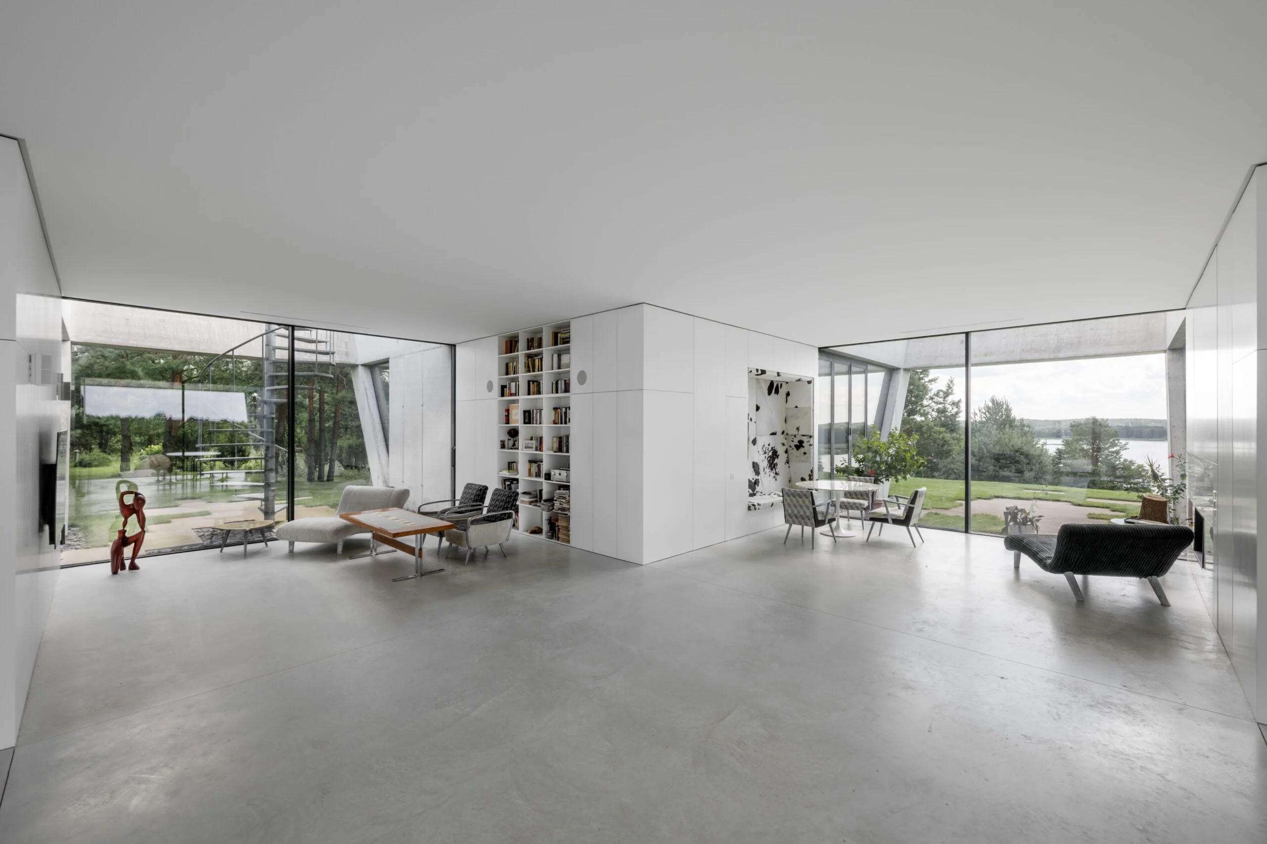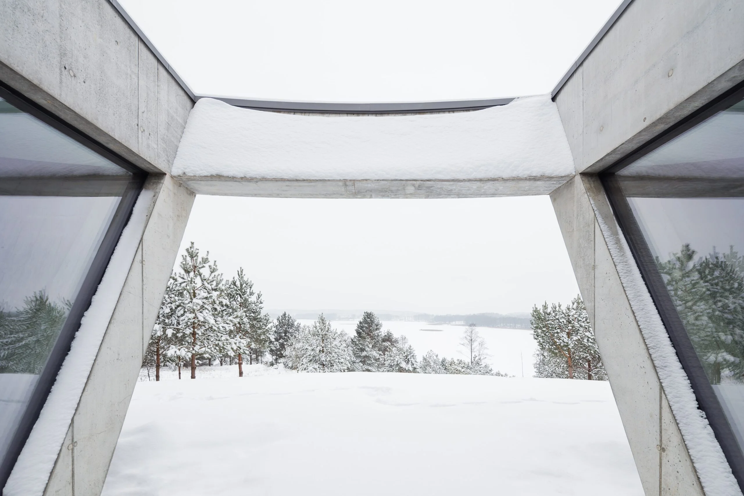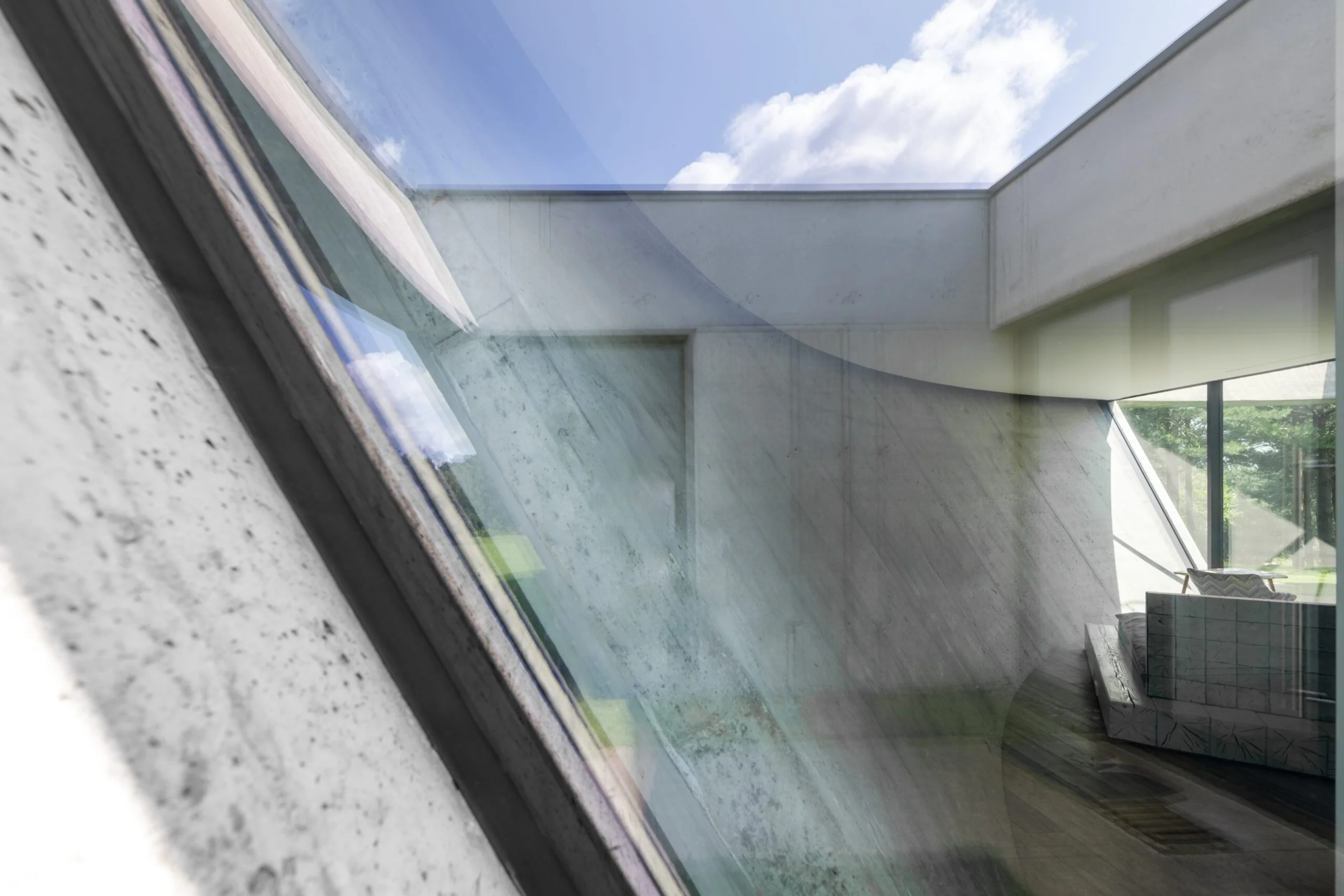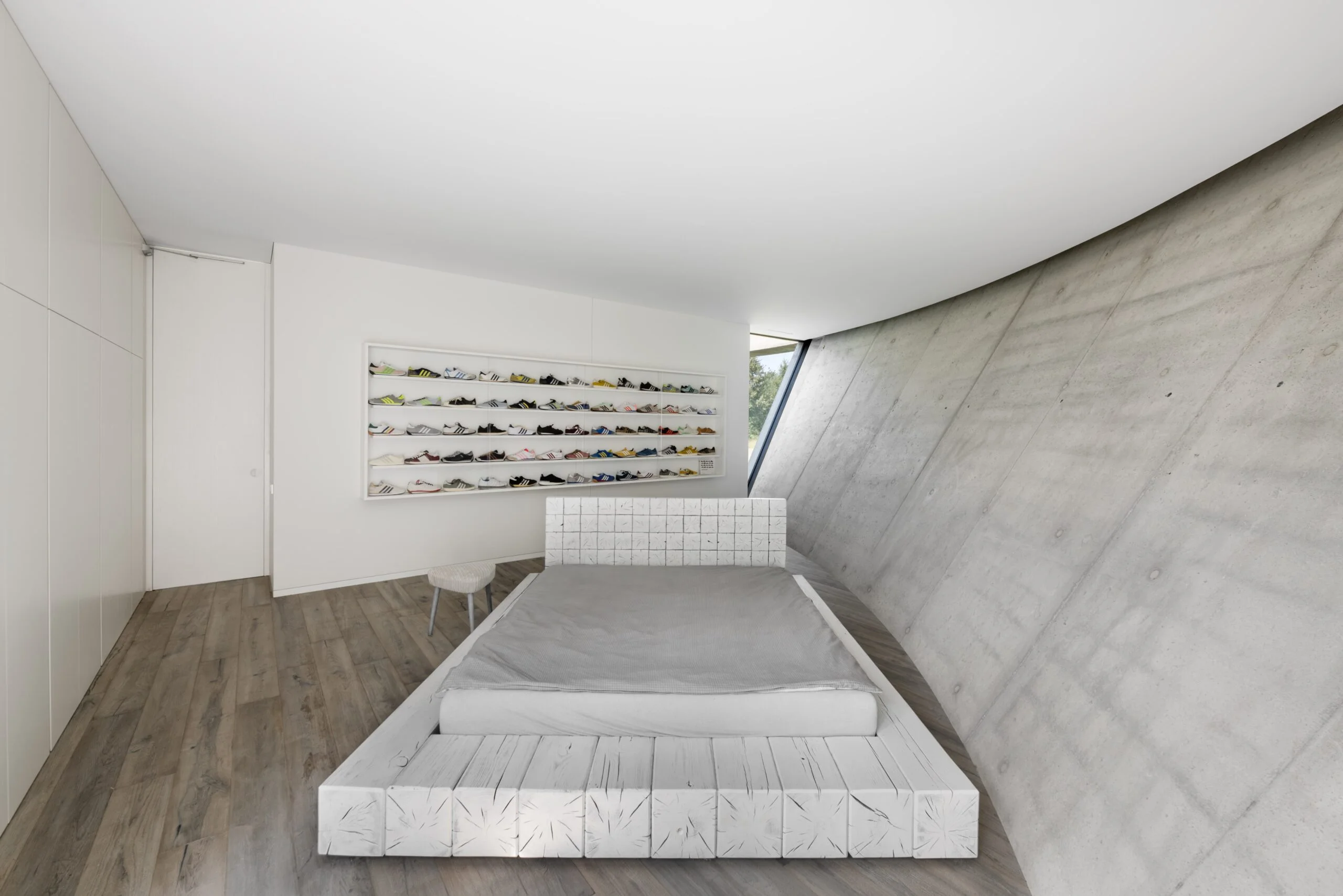 Subtiliai pasvirusi betoninė siena kambariuose suteikia architektūrinio žavesio bei erdvės pojūčio kambariuose. Tai yra labiau skulptūrinis pasirinkimas, kuris interjerui suteikia nestandartinį pojūtį, o eksterjerui įdomų siluetą. Tas termo medienos ir betono kompozicijos siluetas kontrastuoja su natūralia aplinka, dar labiau pabrėždamas pastato formos paprastumą ir organišką reakciją į neapibrėžtą aplinką.