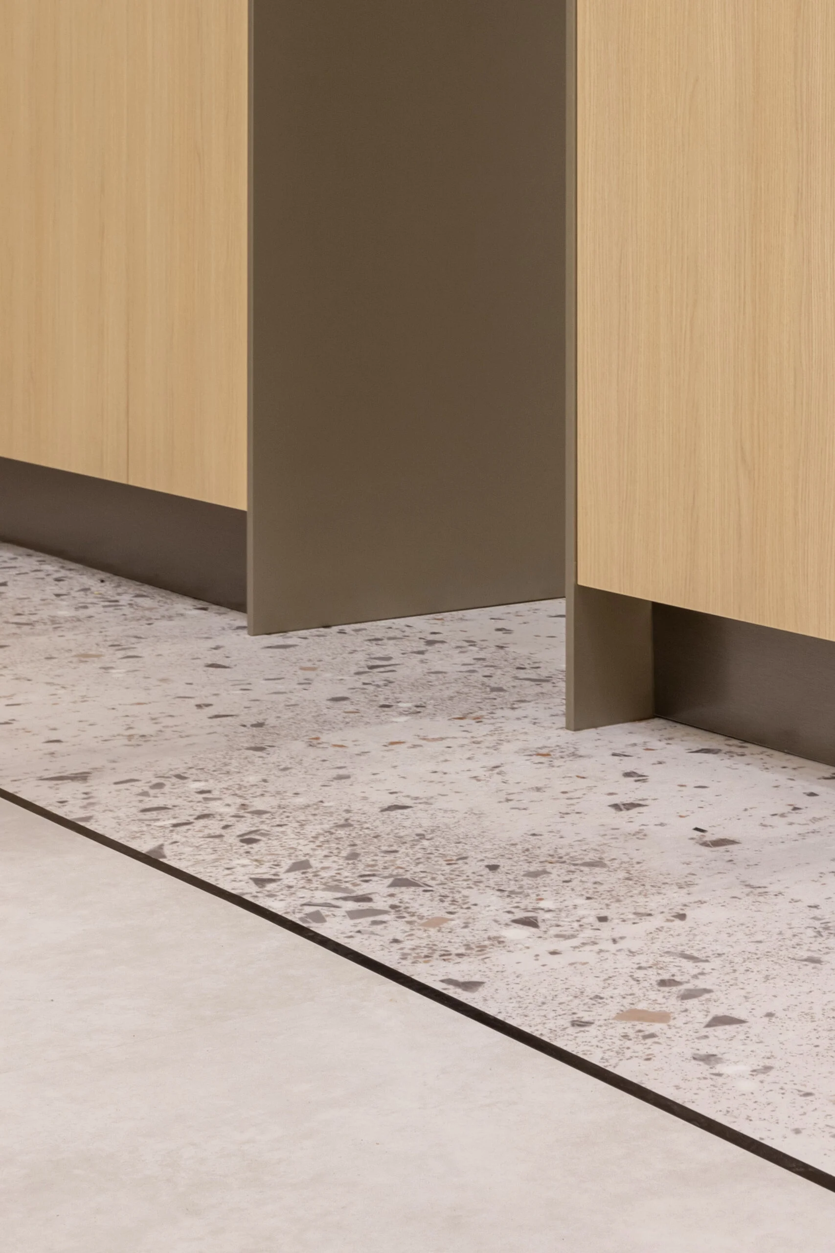Subtili, tačiau interjerą pagyvinanti detalė – išlenktas „Pure Plain Black” intarpas. Ši linija apibrėžia išplanavimą, išlaikant minimalistinį stilių. Dizaino įrėminimas terrazzo vinilinėmis plytelėmis suteikia vizualinio patrauklumo ir švelniai įtvirtina erdvę. Didelių plytelių formas – idealus sprendimas norint užpildyti dideles komercines erdves ir suteikti patalpai prabangią bei santūrią išvaizdą. O juodas intarpas subtiliai sukuria apvadą ir leidžia išryškinti drąsų terrazzo dizainą.