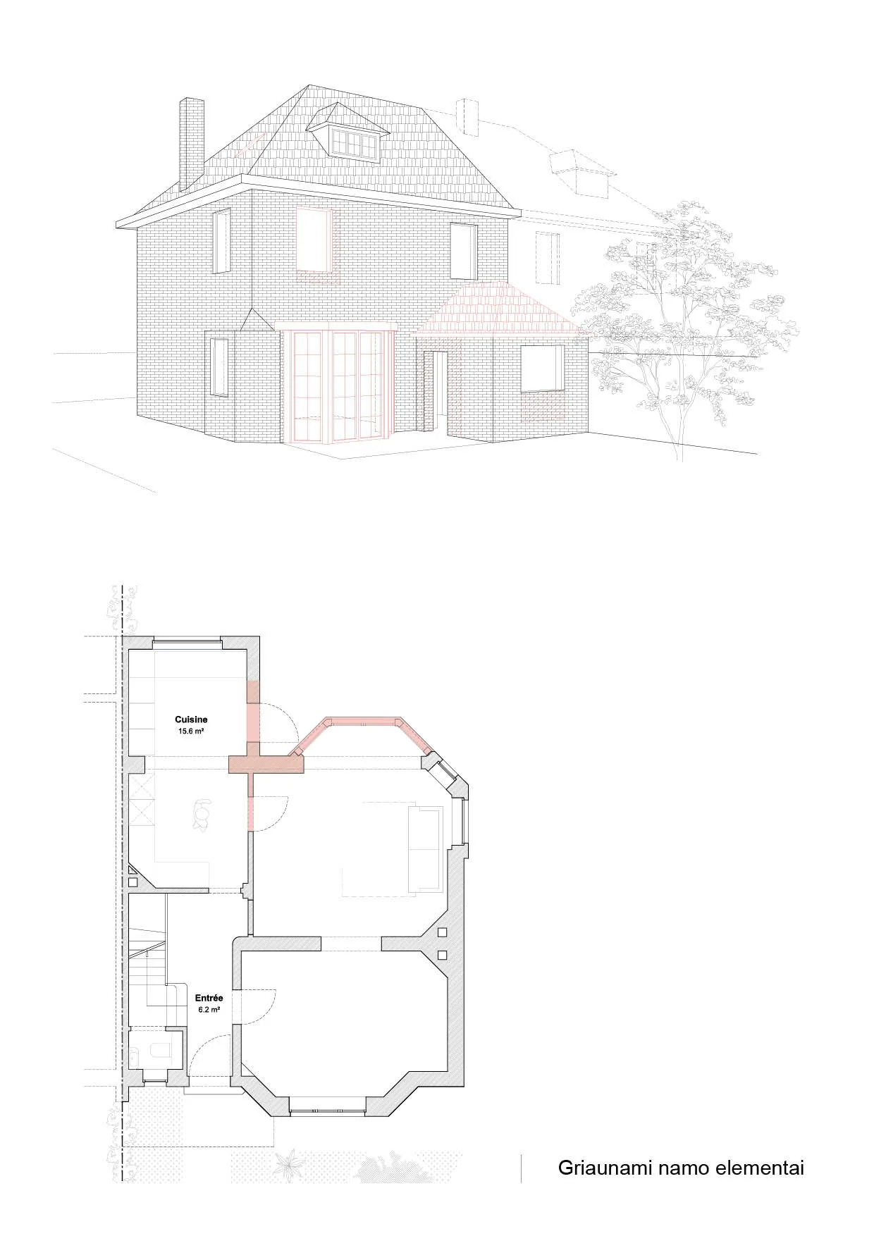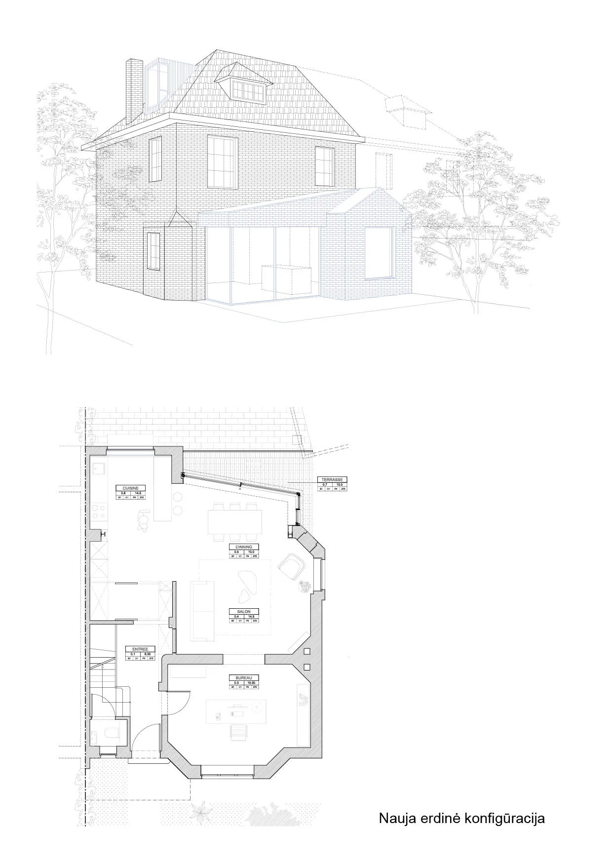 Atsižvelgiant į „Avenue des Alouettes“ kvartalo namų istorinę vertę, priestato forma derinama su esama pastato kompozicija : nugriovus du savyje užsisklendusius priestatus, pridedamas nedidelis, iki tol atskiras mažas erdves sujungiantis tūris sukuriantis erdvinį ir vizualinį tęstinumą tarp svetainės, valgomojo ir sodo.