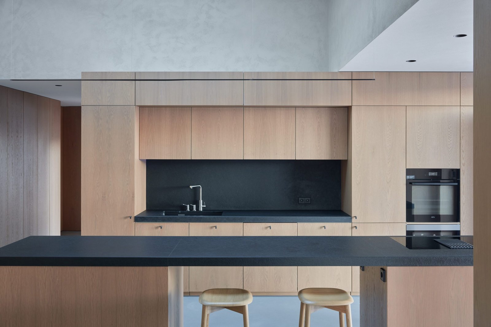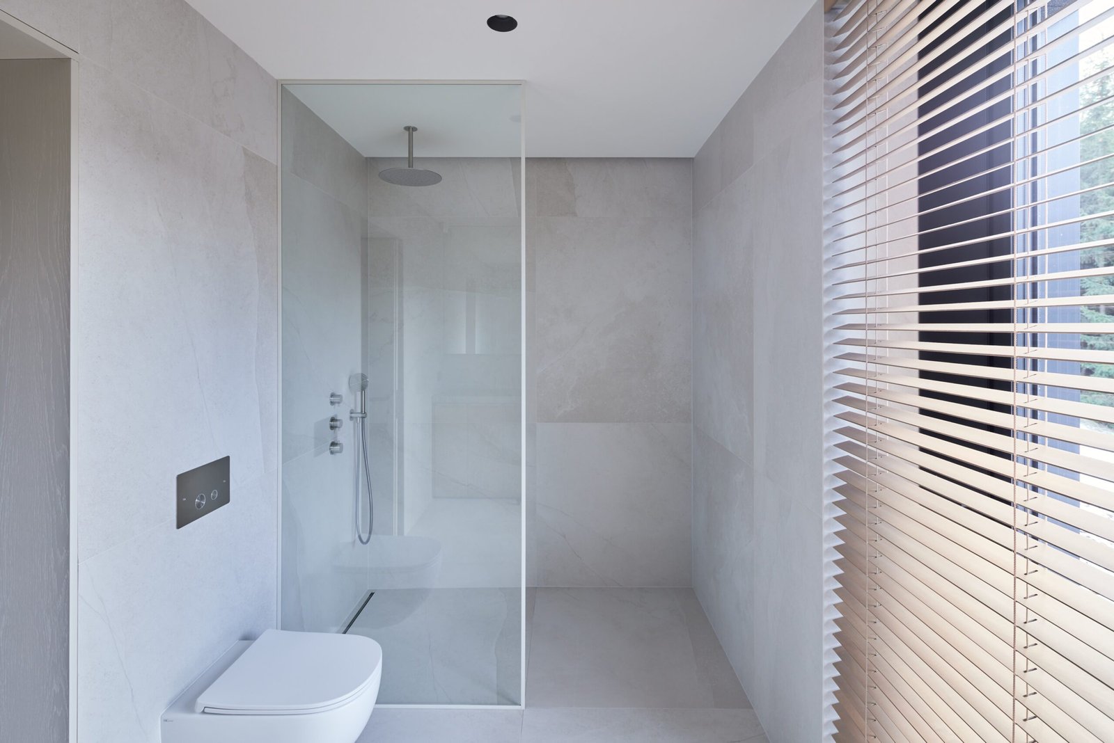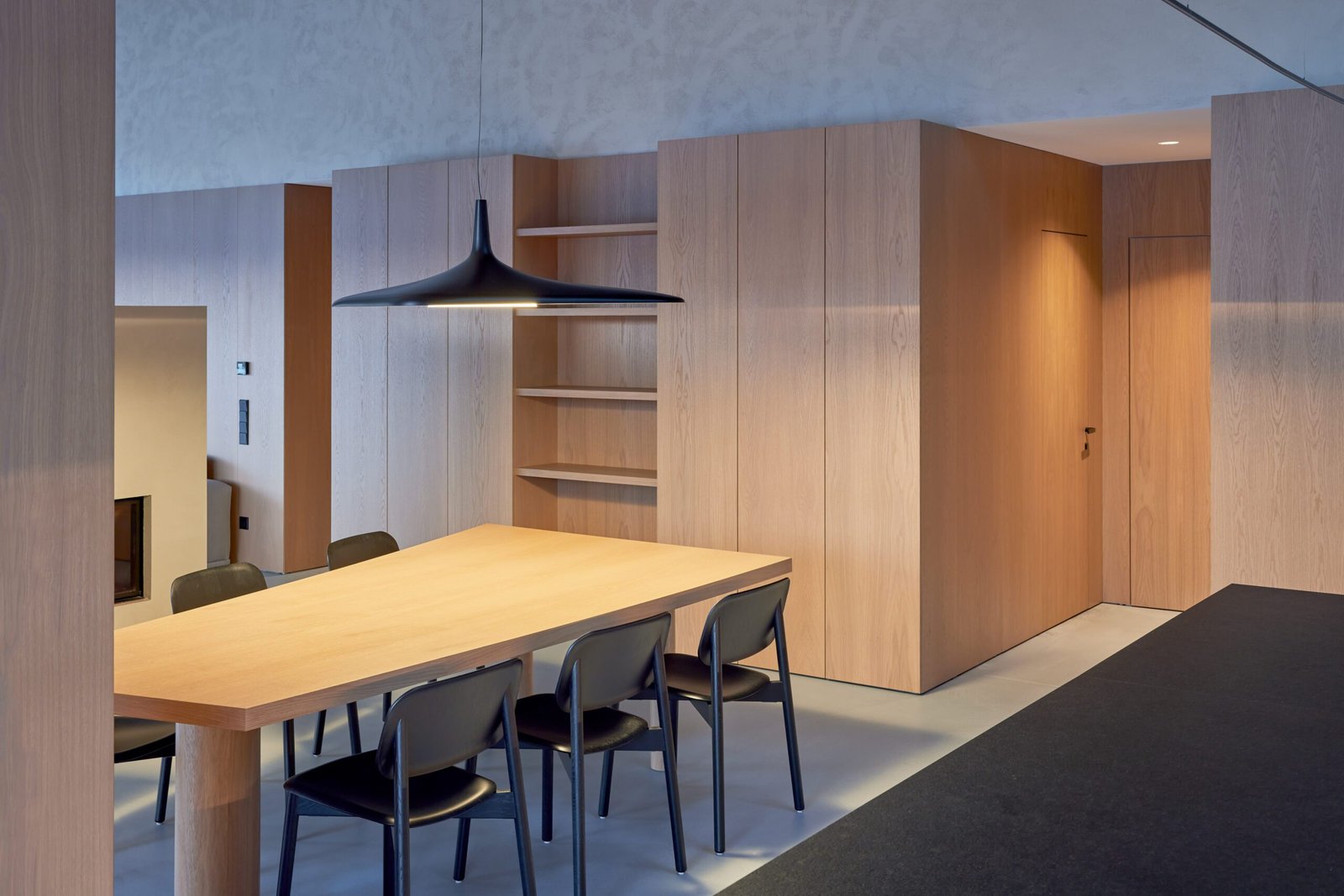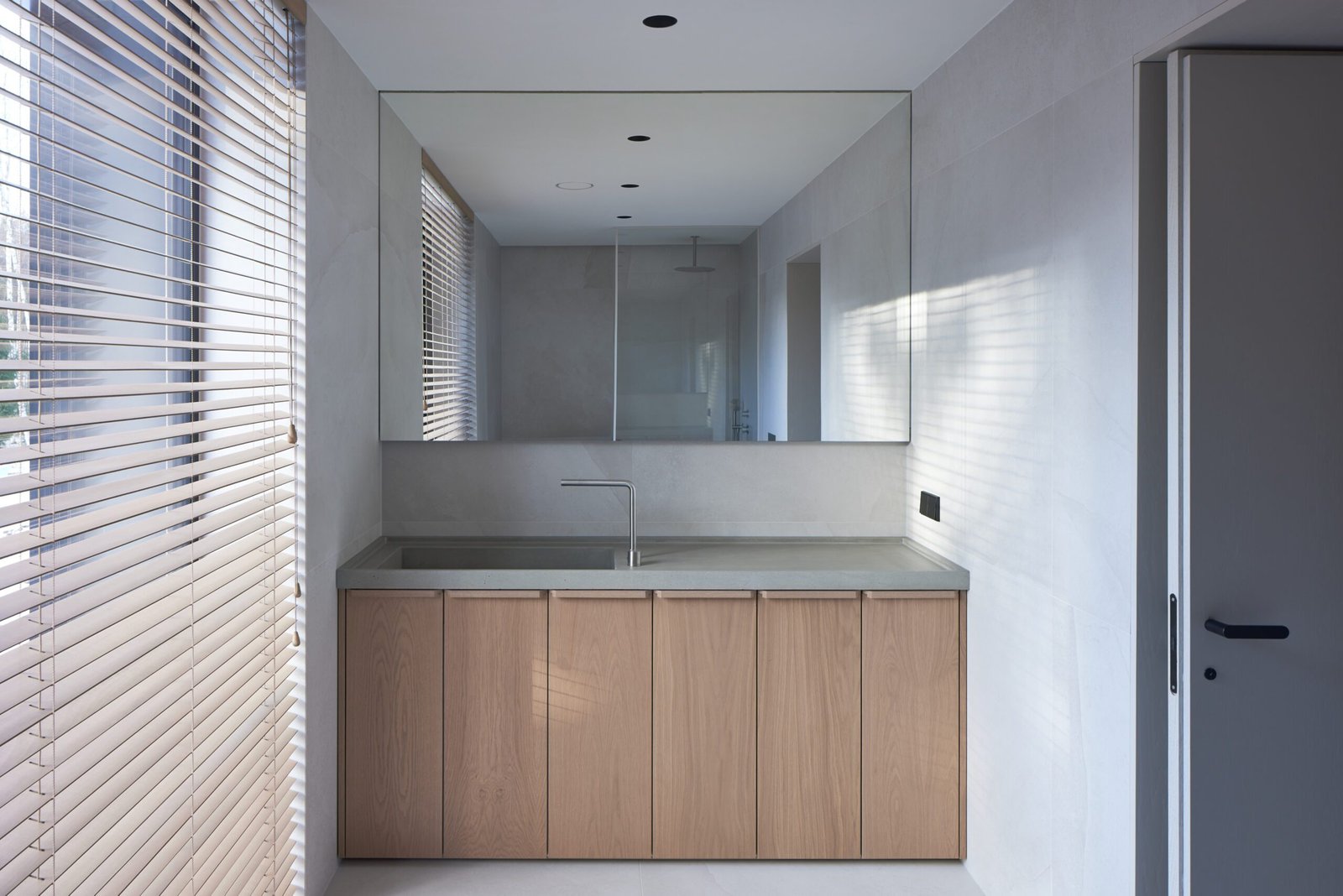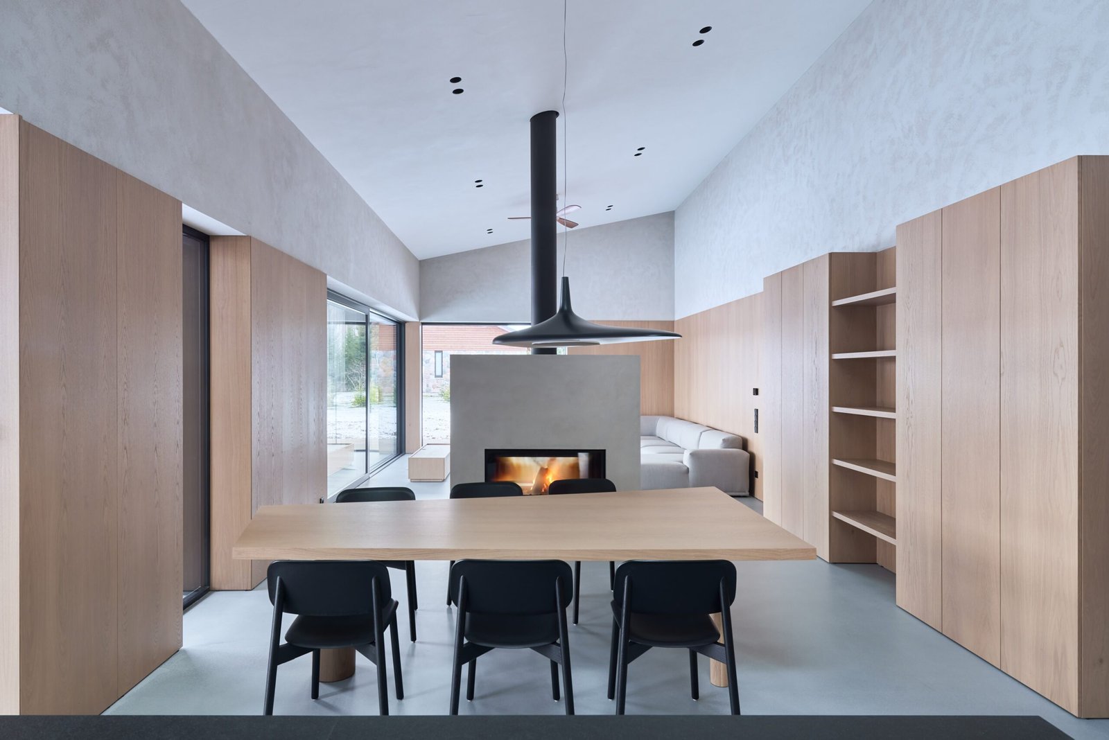 Vientisą interjerą kuria ir įrengta dekoratyvinio betono liejamųjų grindų sistema. Natūralaus cemento grindys patikimai tarnaus ištisus metus – vasarą išlaikys kambarius vėsius, o žiemą bus malonu vaikščioti ant šildomųjų grindų paviršiaus.