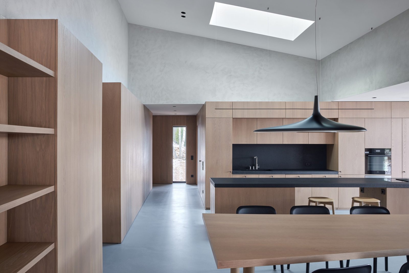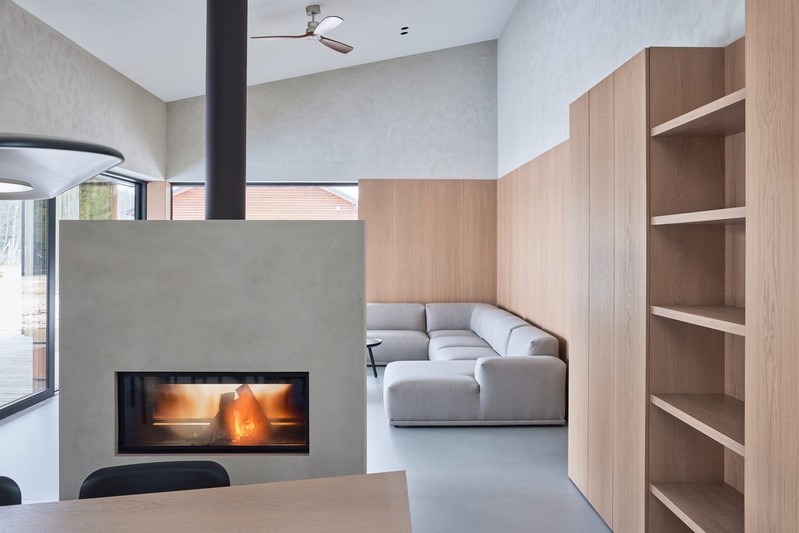 Prie ežero įsikūrusio namo vidaus interjere pastebimos gamtoje sutinkamos spalvos, vyrauja natūralios ir tvarios medžiagos – medis, molio tinkas, cementas.