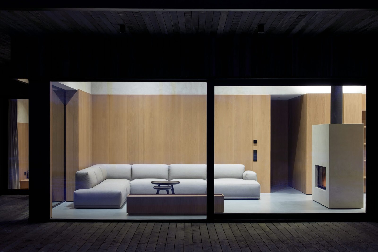 Architektas P. Žakauskas pasakoja, kad vidaus erdvėse stipriai juntamas privačių ir bendrų erdvių atskyrimas. Namo planas padalytas išilgai, šiaurinę pastato dalį skiriant pagrindinei gyvenamajai erdvei. Joje suprojektuotos aukštos vienšlaitės lubos, pro vitrininius langus matomi panoraminiai ežero vaizdai, o visos gyvenimui ir bendravimui skirtos zonos išdėstytos aplink patalpos centre įrengtą dvipusį židinį.