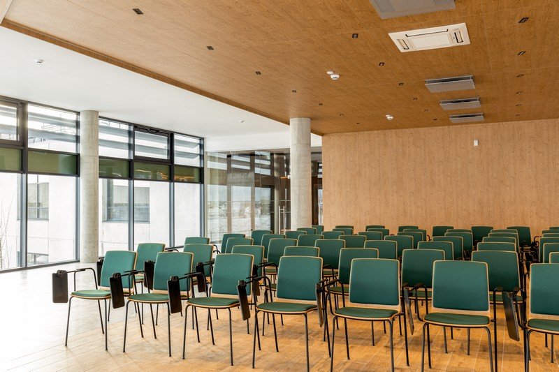 • Sienų, lubų ir durų apsiuvimui buvo panaudota 1500 m2 nedegios BS1 klasės ir 1000 kv. m įprastos LMDP ąžuolo dekoro plokštės.