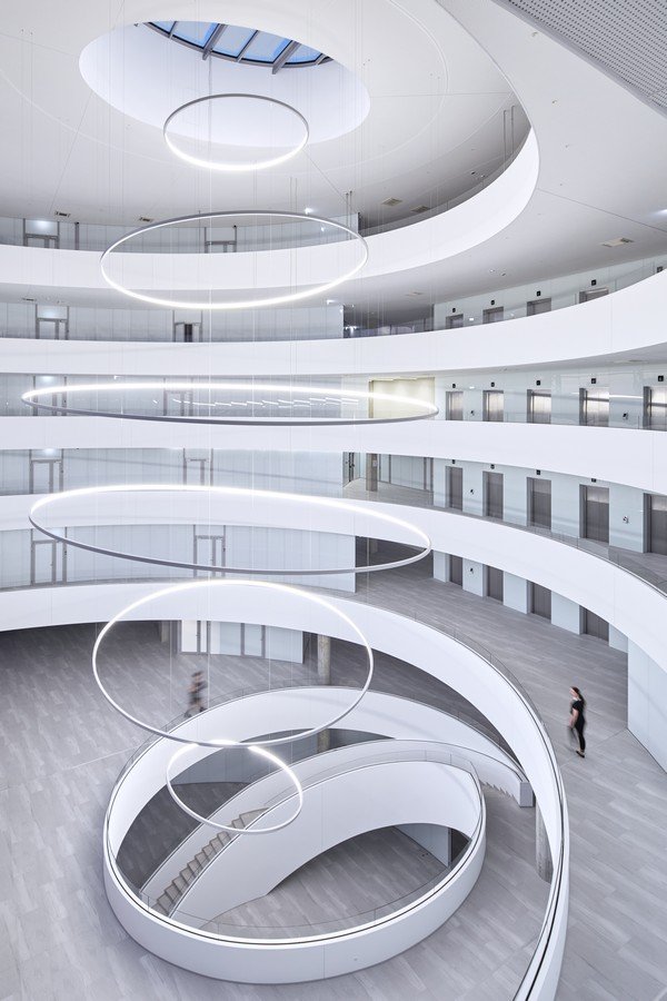 Įmonei įprastas apdailos užduotis šiame pastate išskirtines darė du dalykai: tai didelis aukštis, kuriame teko dirbti atitveriant atrijų, ir pertvarų forma.
