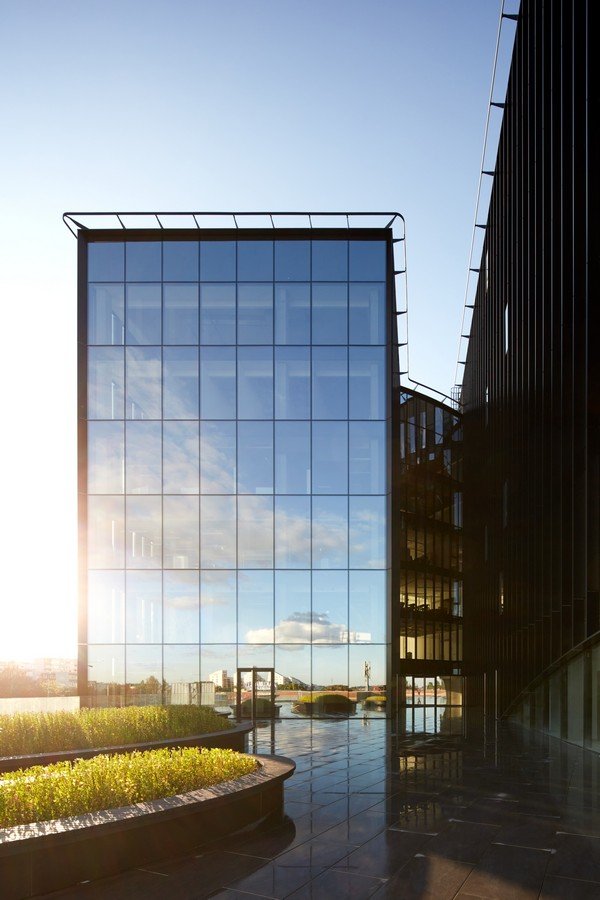 Abu verslo centro tūrius jungia amfiteatro erdvės holas. Pagrindinis komplekso fasado akcentas – horizontalus ovalas, tarsi būtų pastato akis. Dėl šio stiklinio ovalo viduje esantis atrijus tampa atviras, suteikia galimybę praeiviams pamatyti verslo centro gyvenimą iš lauko, o žvelgiant iš vidaus tarsi leidžia pajausti gatvės šurmulį bei judėjimą.
